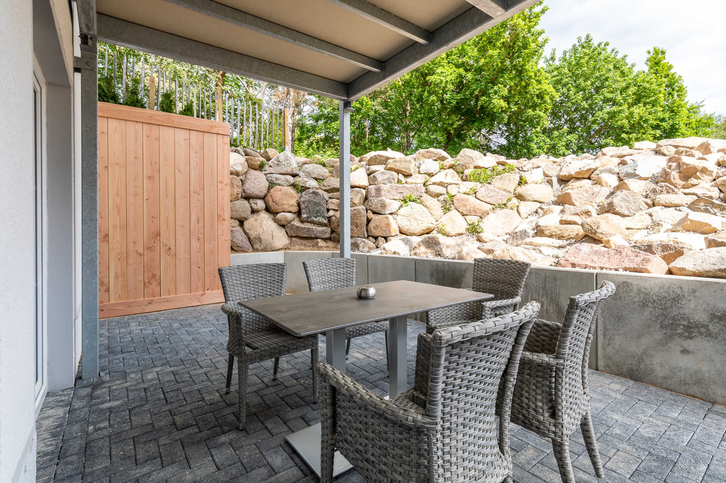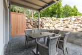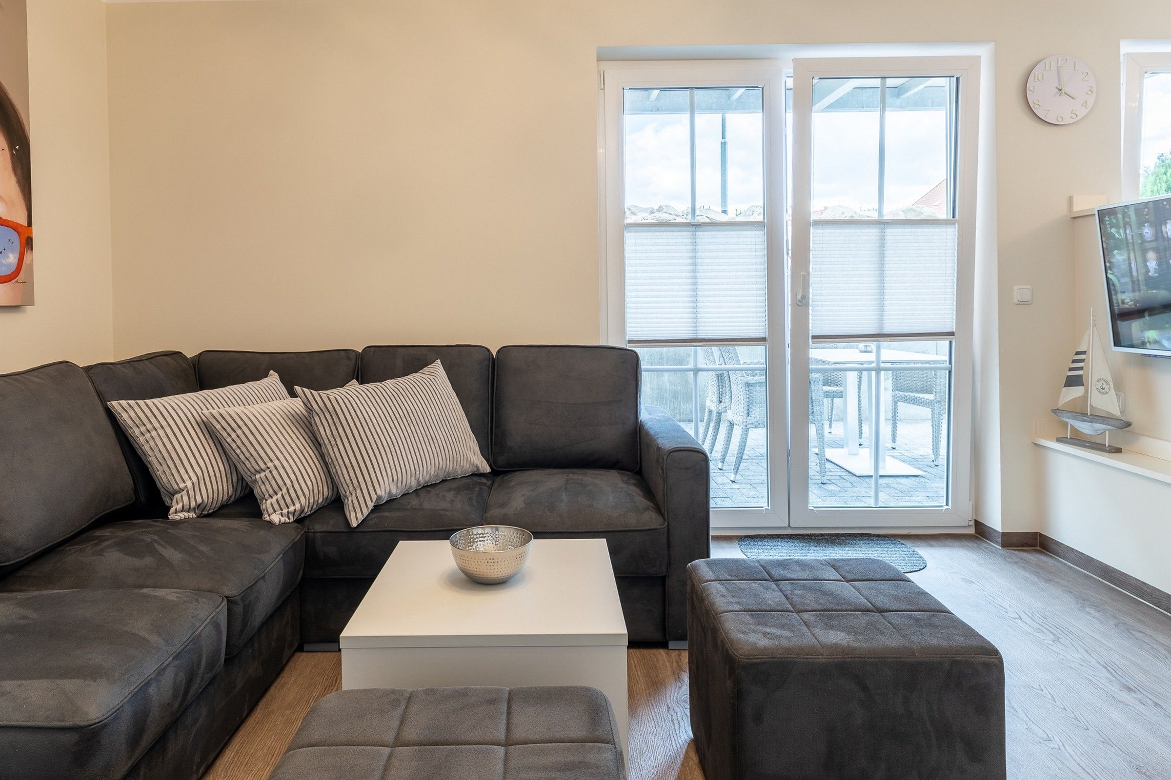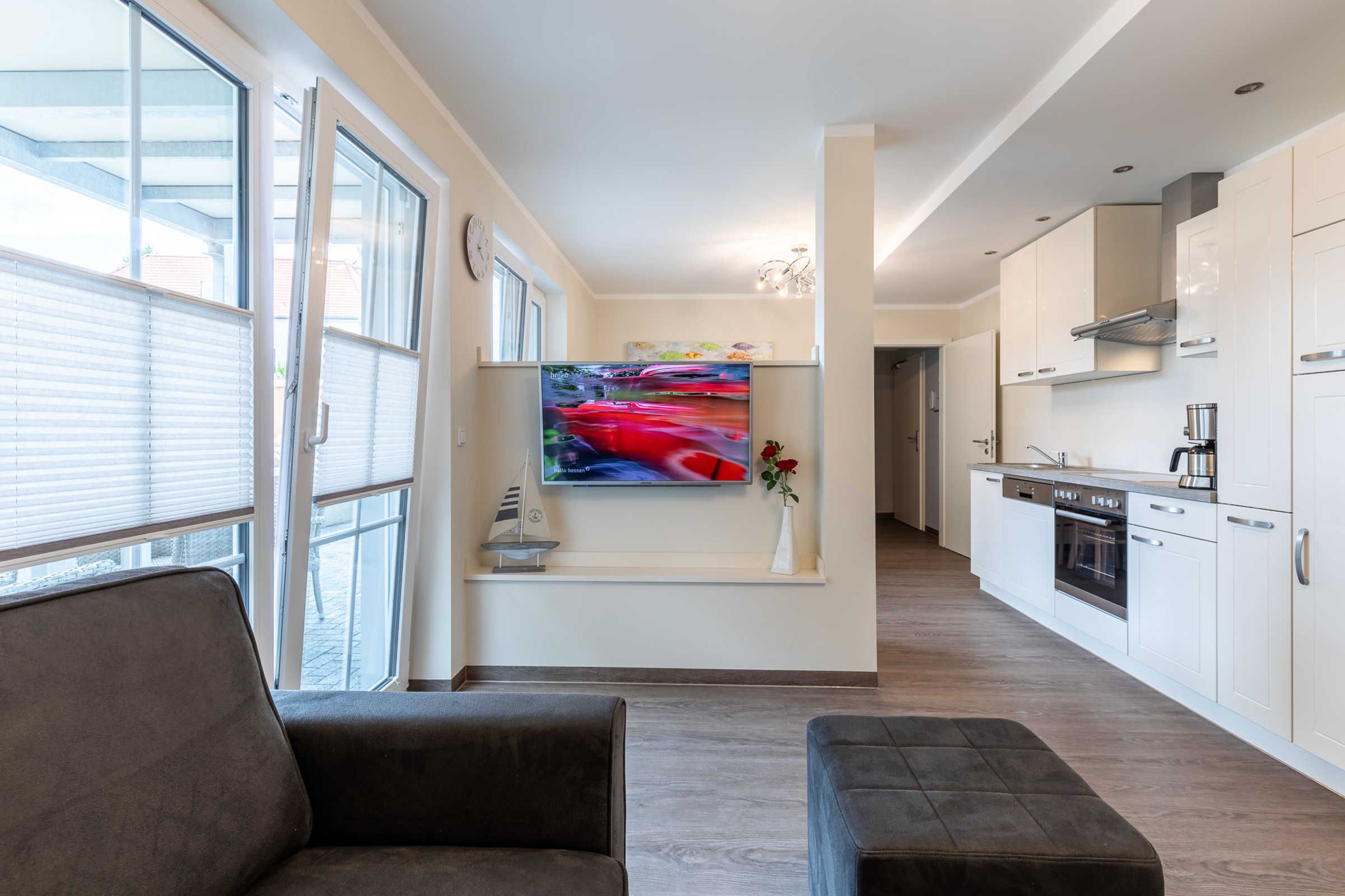 Sie bietet einen offenen Wohn- und Essbereich mit integrierter Küchenzeile und Zugang zur möblierten, überdachten Südost-Terrasse. Das bequeme Ecksofa lädt zum gemütlichen Beisammensein oder zum Entspannen beim Fernsehen ein. Der Flatscreen-TV sorgt für Ihre Multimediaunterhaltung.