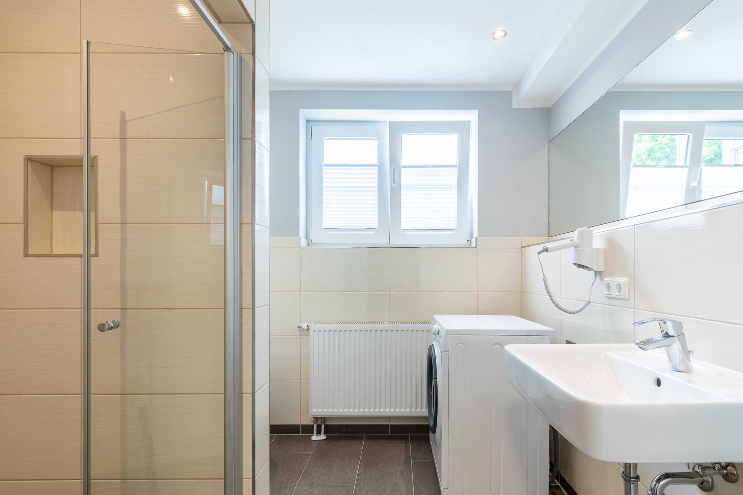 Ein großes Bad mit Tageslicht bietet eine barrierefreie Dusche, Waschbecken, WC und auch eine Waschmaschine.