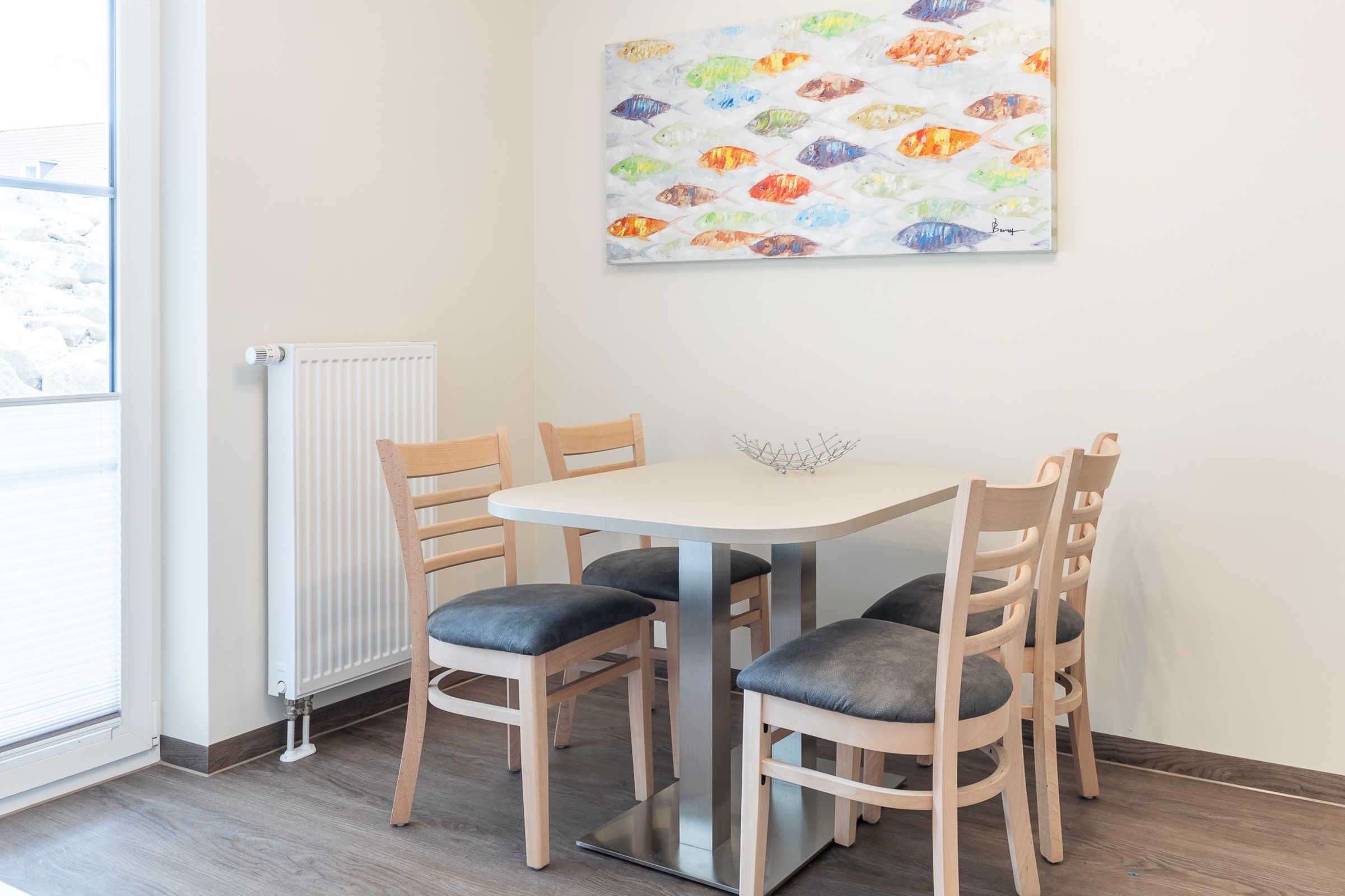 Zur gut ausgestatteten modernen Wohnküche gehört auch ein schöner Essbereich für alle Drei.