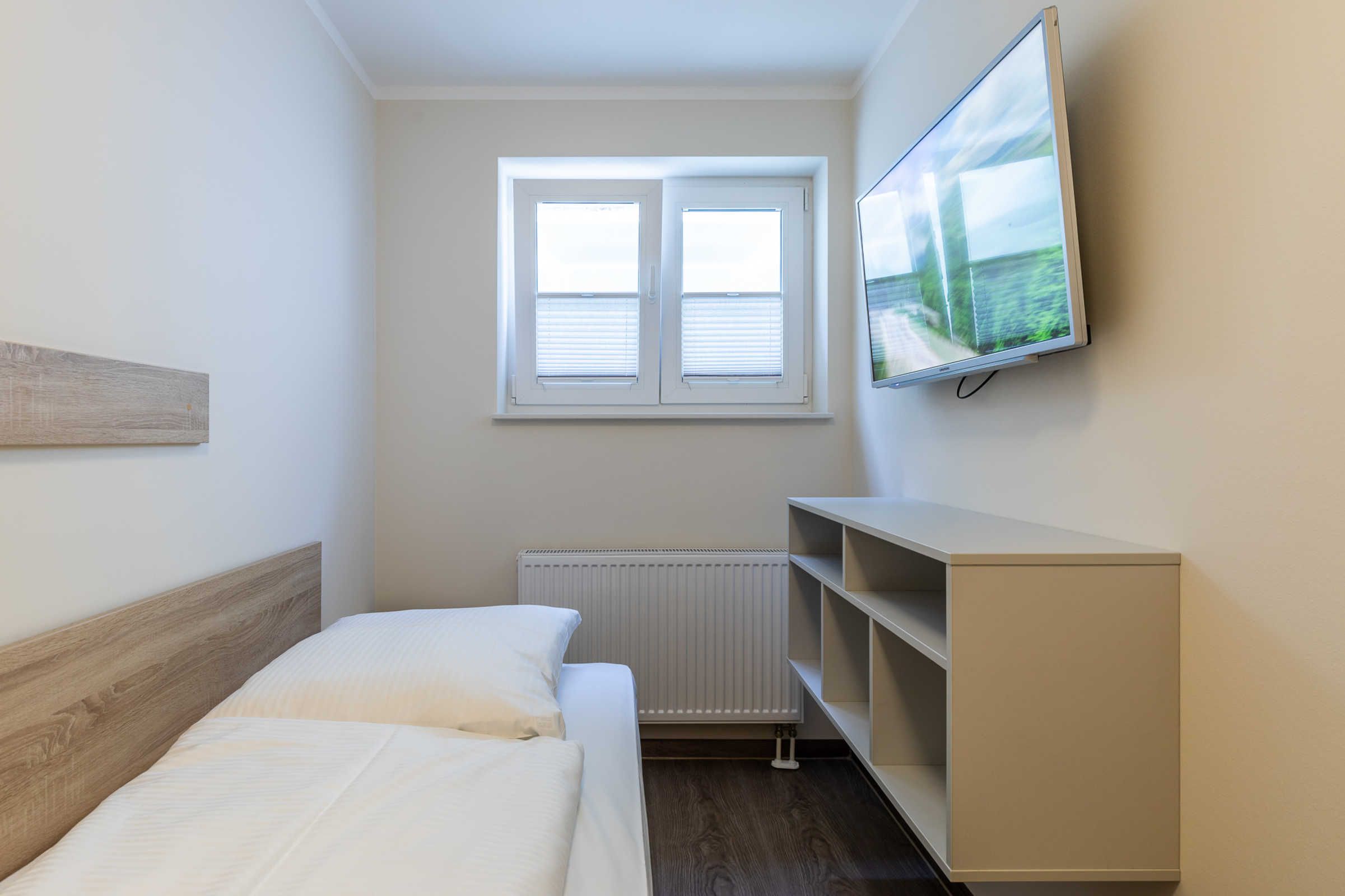 Zwei separate Schlafzimmer sind vorhanden und ebenfalls modern möbliert. Das große Schlafzimmer ist mit einem Doppelbett und einem geräumigen Kleiderschrank, das Gäste-/ Kinderzimmer ist mit einem Einzelbett, Kleiderschrank und TV ausgestattet.