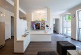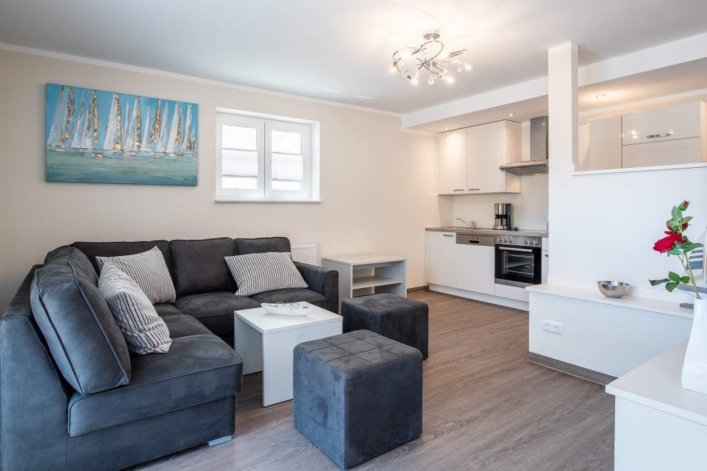 Das bequeme Ecksofa mit passenden Hockern im modernen Wohnzimmer lädt zum gemütlichen Beisammensein oder zum Entspannen beim Fernsehen ein. Auf der möblierten, überdachten Südost-Terrasse, die Sie von hier aus erreichen, können Sie den Abend bei einem Glas Wein ausklingen lassen.