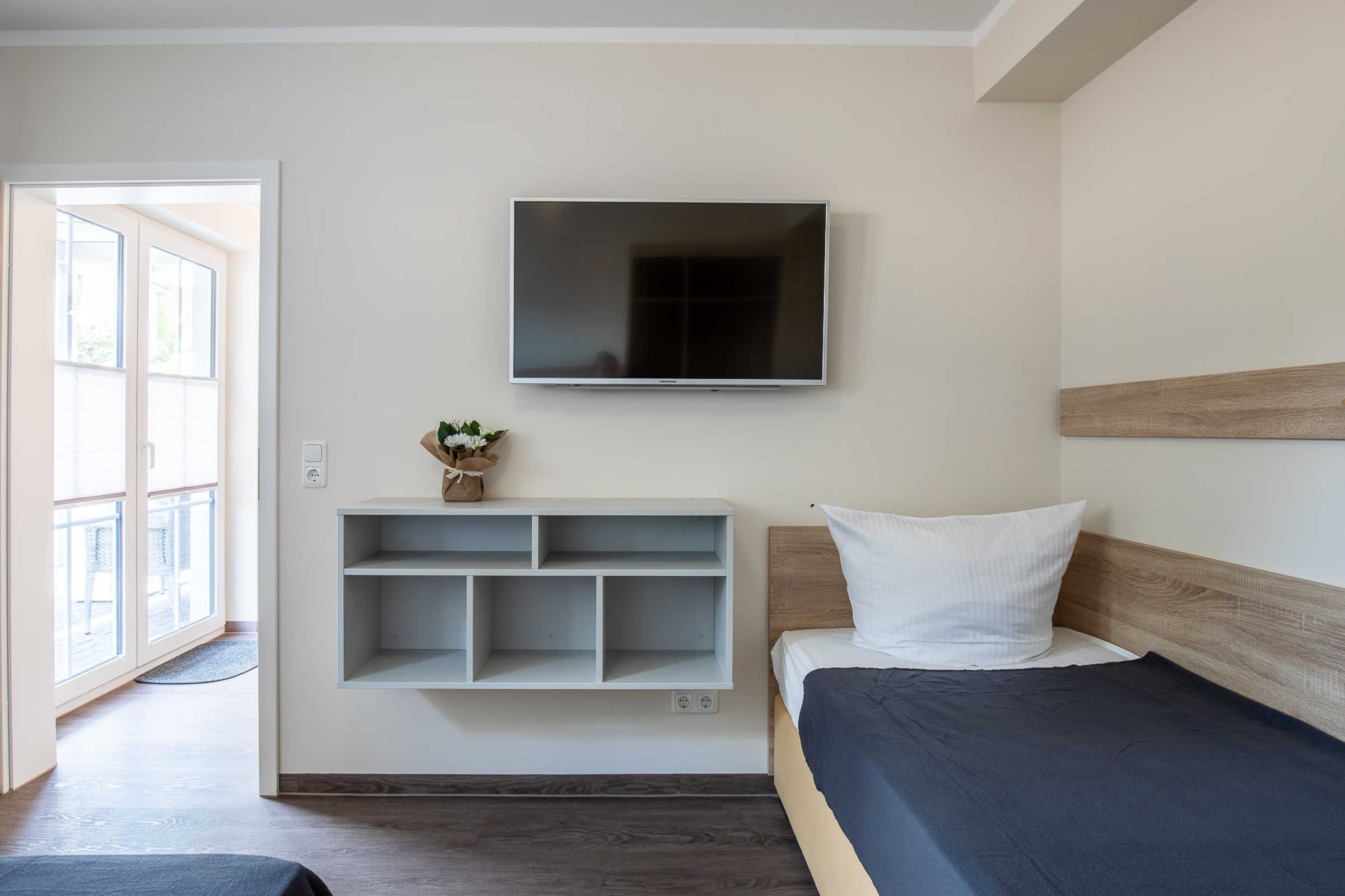 Das Schlafzimmer ist mit einem Doppelbett einem geräumigen Kleiderschrank und Schreibtisch, das Gäste-/ Kinderzimmer mit zwei Einzelbetten ausgestattet. Auch hier finden Sie einen Kleiderschrank und sogar einen weiteren Flatscreen-TV an der Wand.
