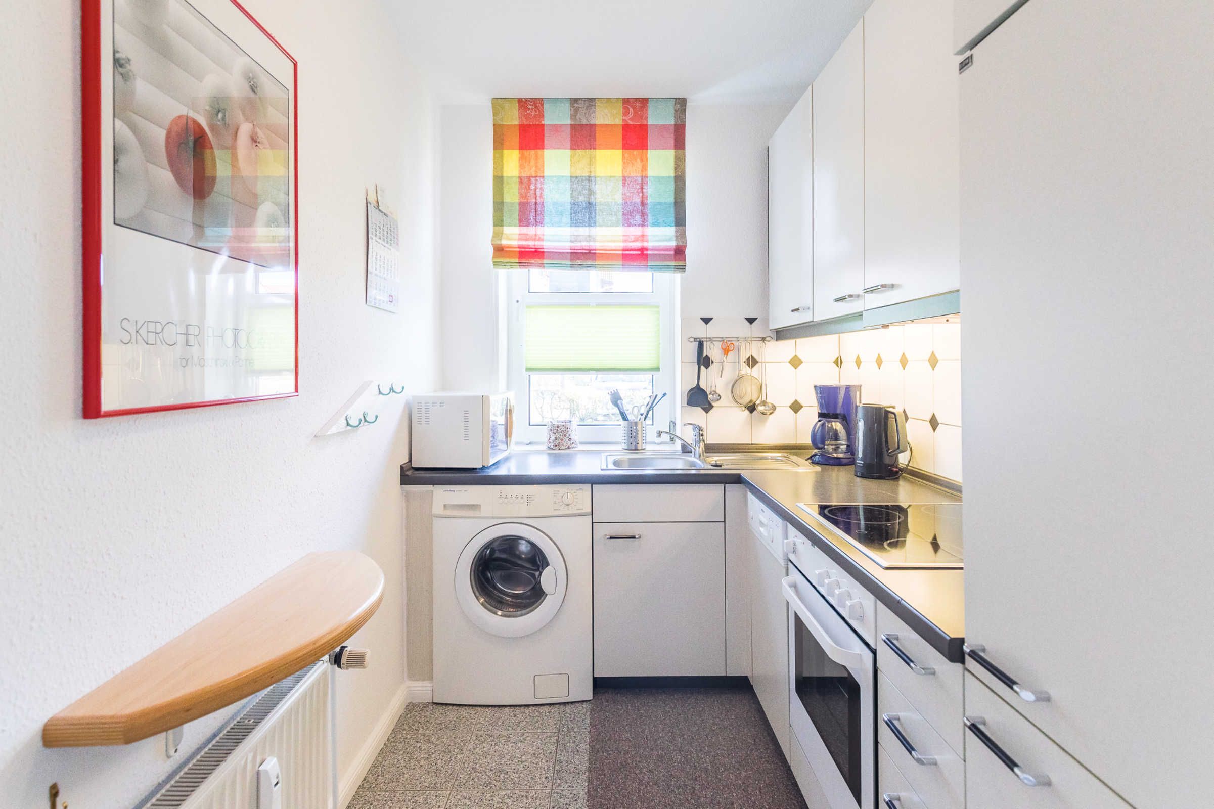 Die separate Küche bietet eine komplette Ausstattung und verfügt u.a. über Geschirrspüler, Mikrowelle, Herd, Backofen, Kühlschrank mit Gefrierfach, gebührenfreie Waschmaschine uvm.