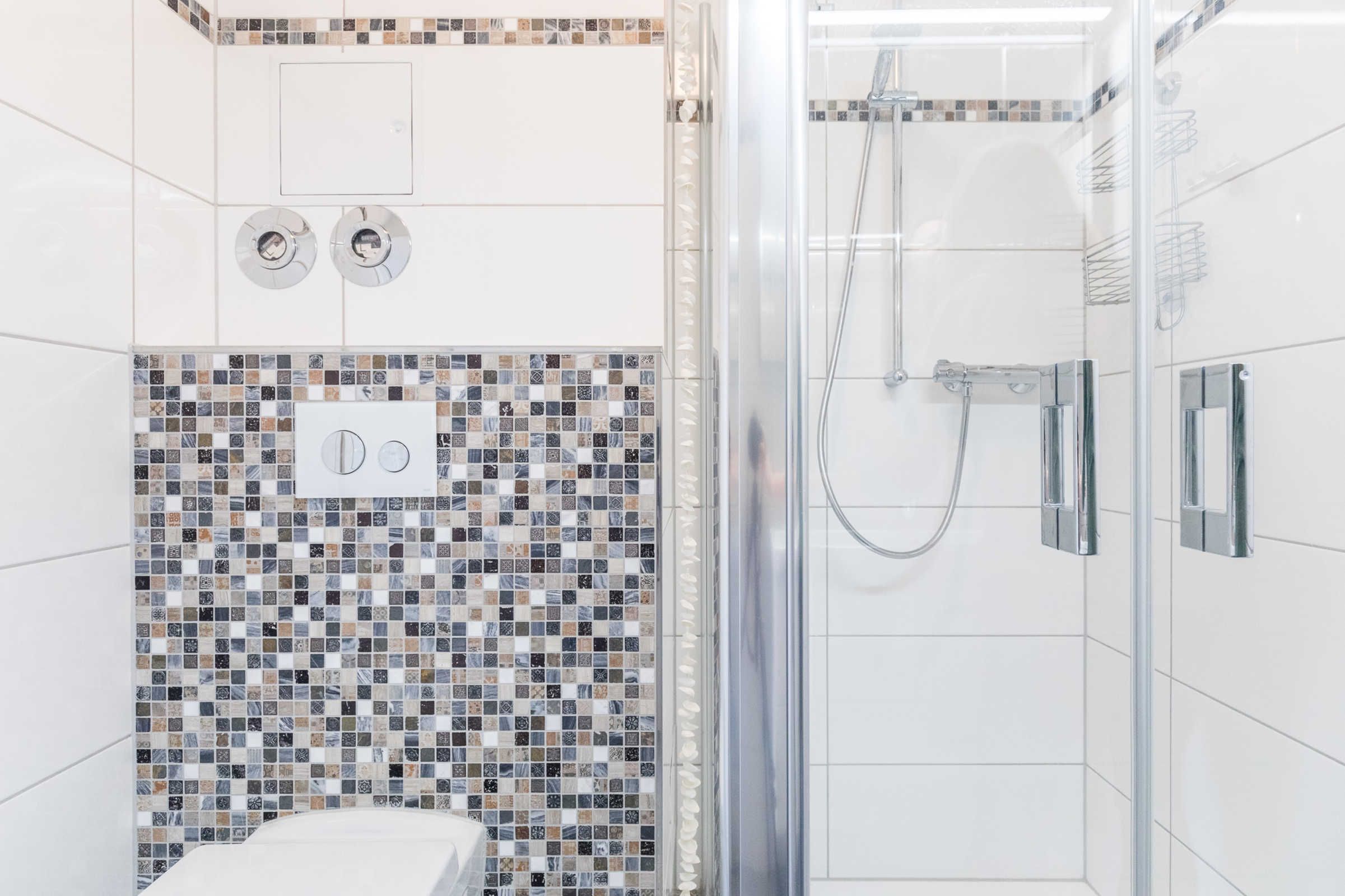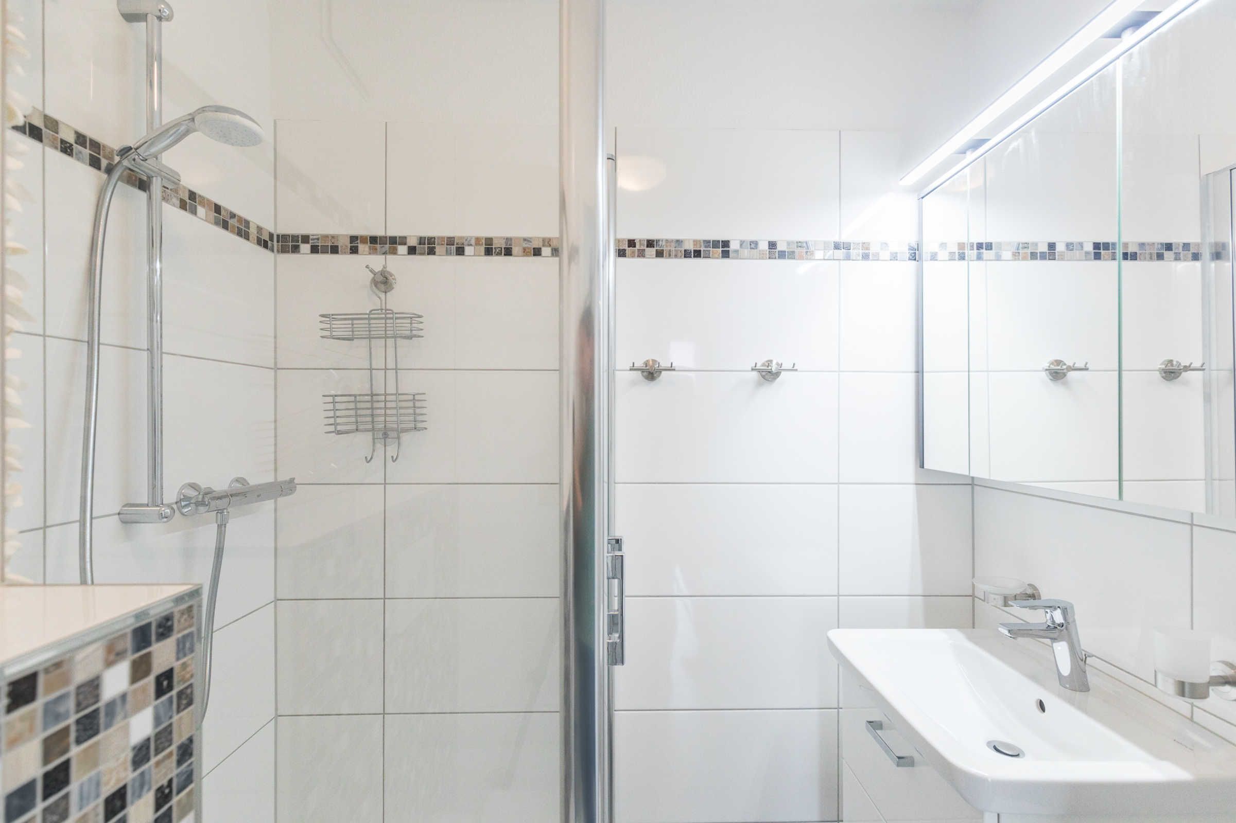 Das Bad bietet eine Dusche, Waschbecken und WC.