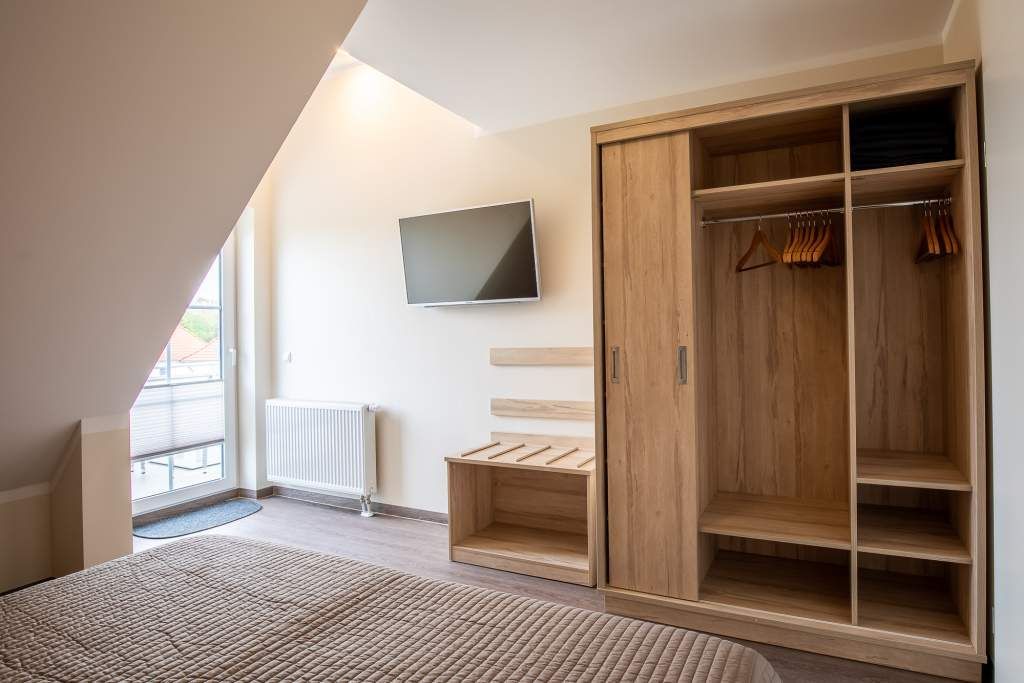 Das Schlafzimmer ist mit einem Doppelbett und einem geräumigen Kleiderschrank, das Gäste-/ Kinderzimmer mit zwei Einzelbetten ausgestattet. Beide Zimmer bieten weiterhin ebenfalls einen Flatscreen-TV und auch ein Reisebettchen findet hier bei Bedarf einen Platz.