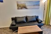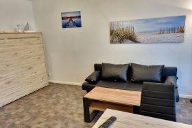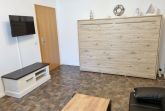Im Wohnbereich befindet sich eine Sitzgruppe mit Flachbild-TV sowie das sehr bequeme Schrankbett, welches Ihnen tagsüber viel Freiraum im Appartement bieten und für die Nacht schnell auszuklappen ist.