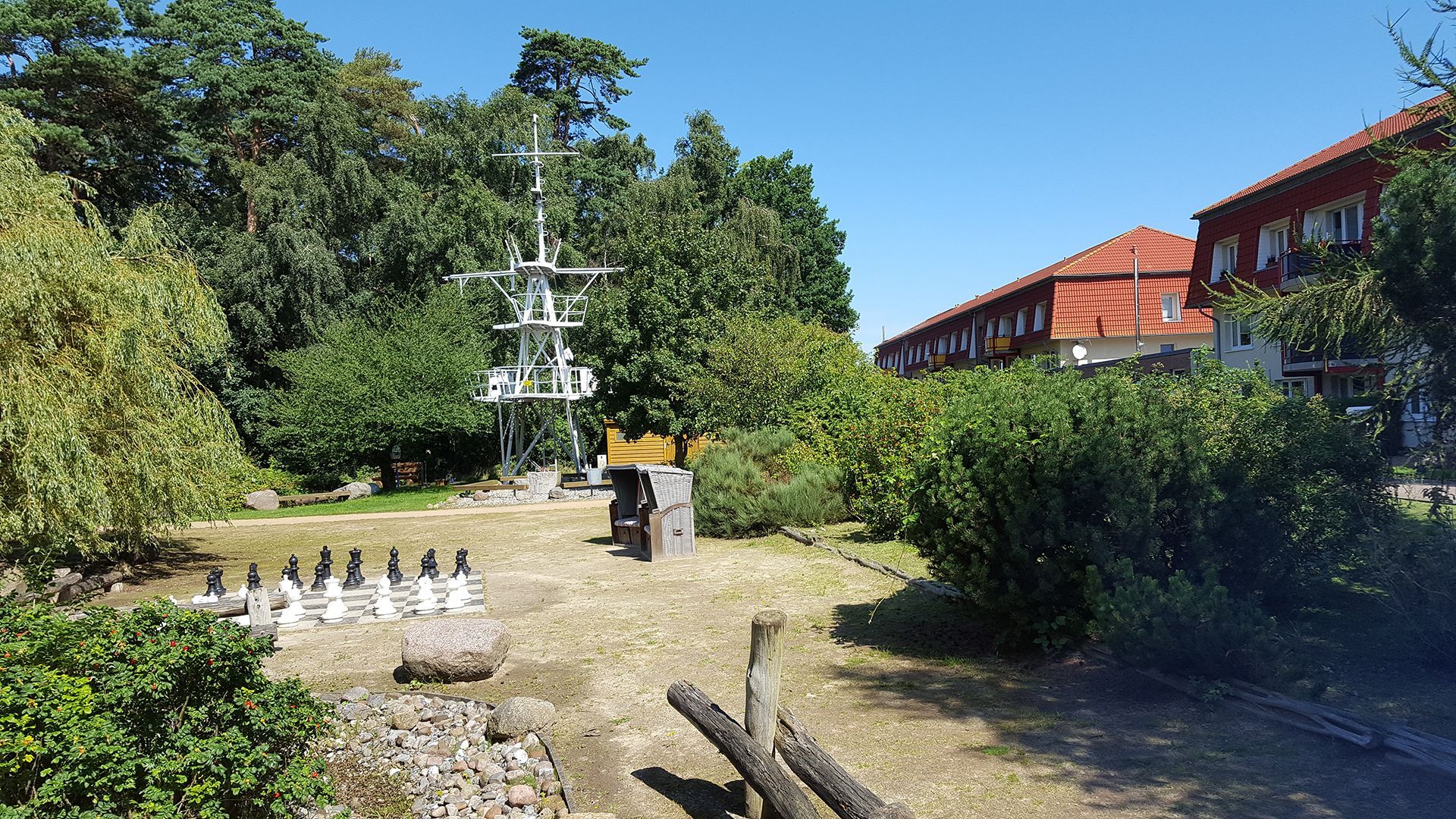 Die Ferienwohnungsanlage ist umgegeben von Kieferngehölzen und Sanddornbüschen und bietet eine Parkanlage mit Wasserlauf.