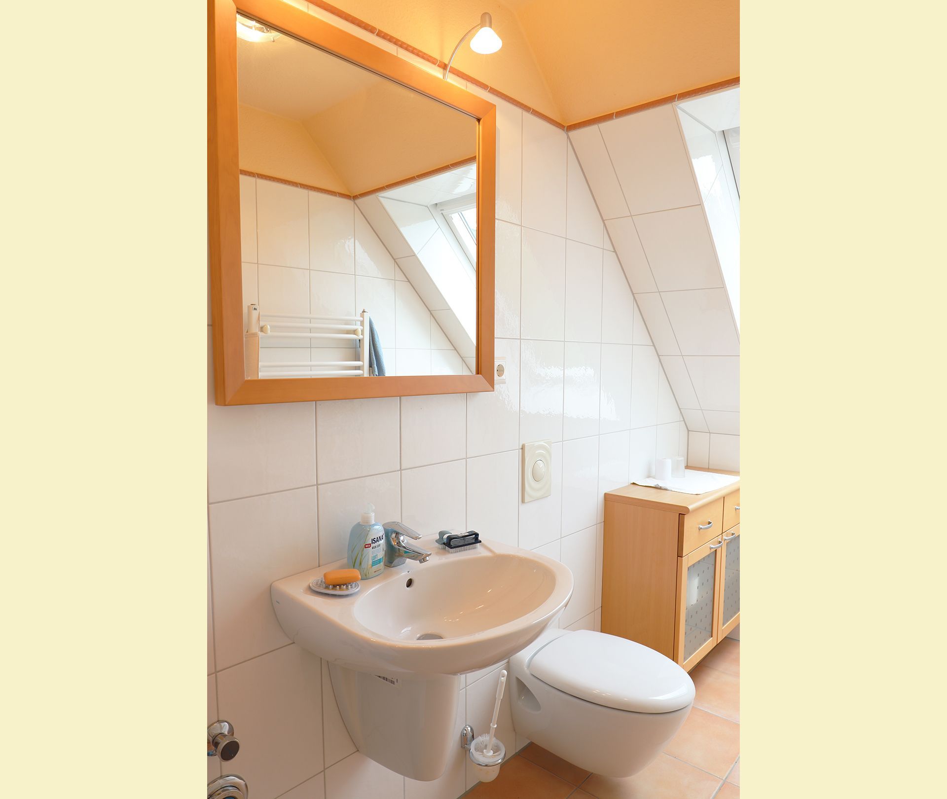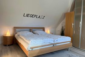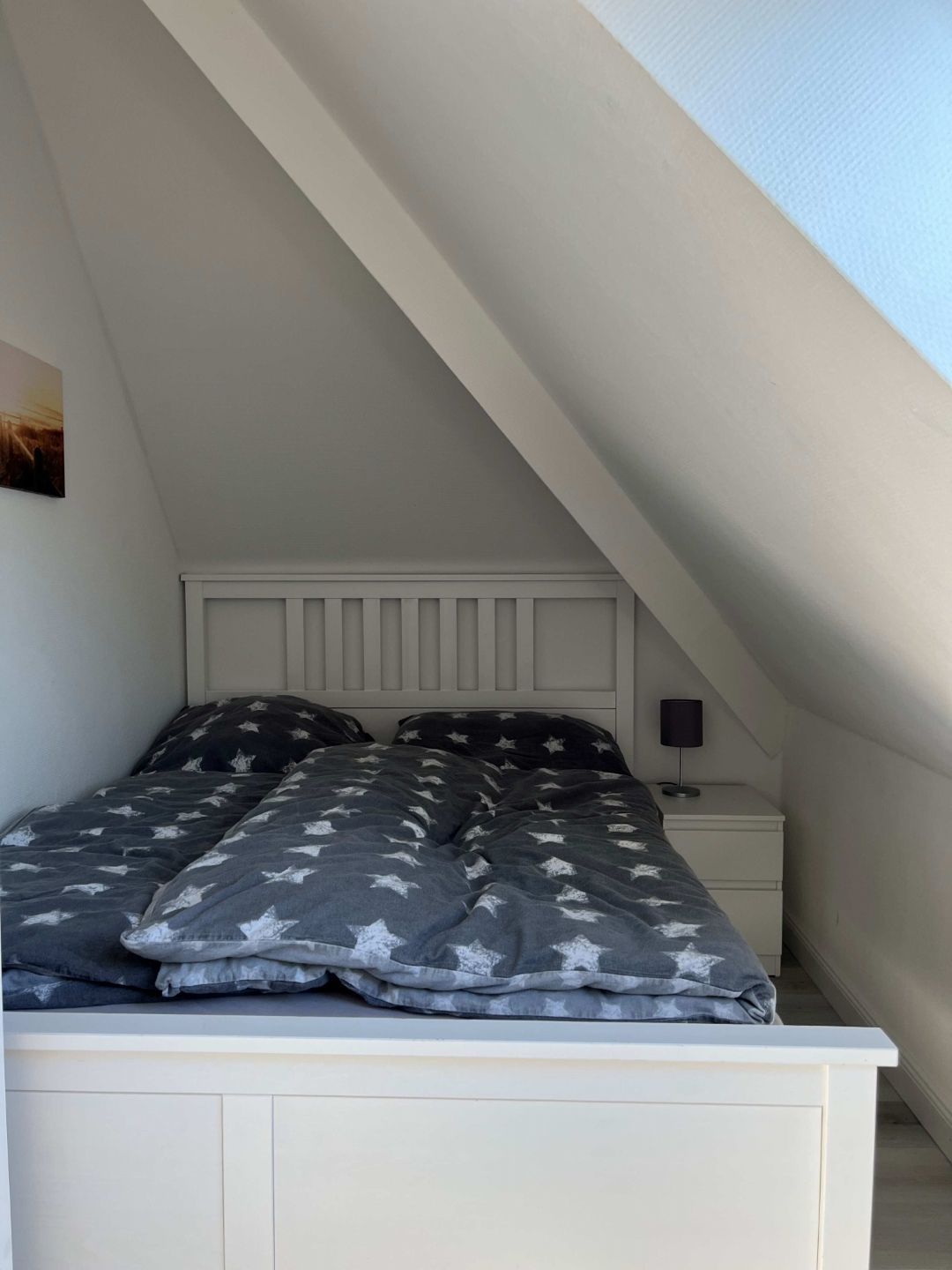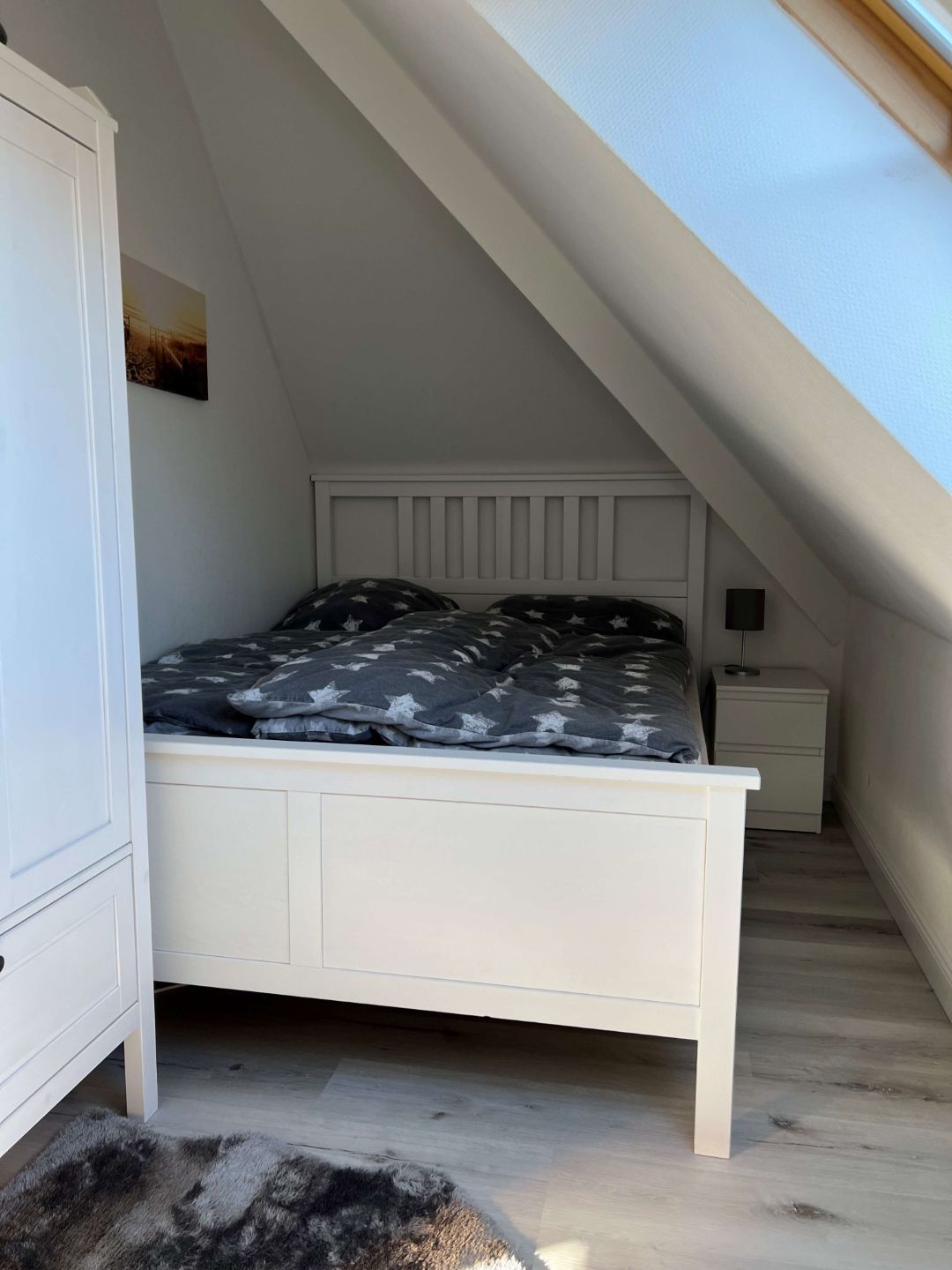 Auf dieser Etage befindet sich auch ein Gäste-WC. Über eine Treppe im Appartement gelangen Sie in das ausgebaute Dachgeschoss, wo sich das frisch renovierte Badezimmer mit Dusche, sowie das Schlafzimmer mit einem Doppelbett (180x200) und TV befinden. In einem Nebenraum stehen Ihnen ein weiteres Doppelbett (140x200) und ein Einzelbett zur Verfügung.