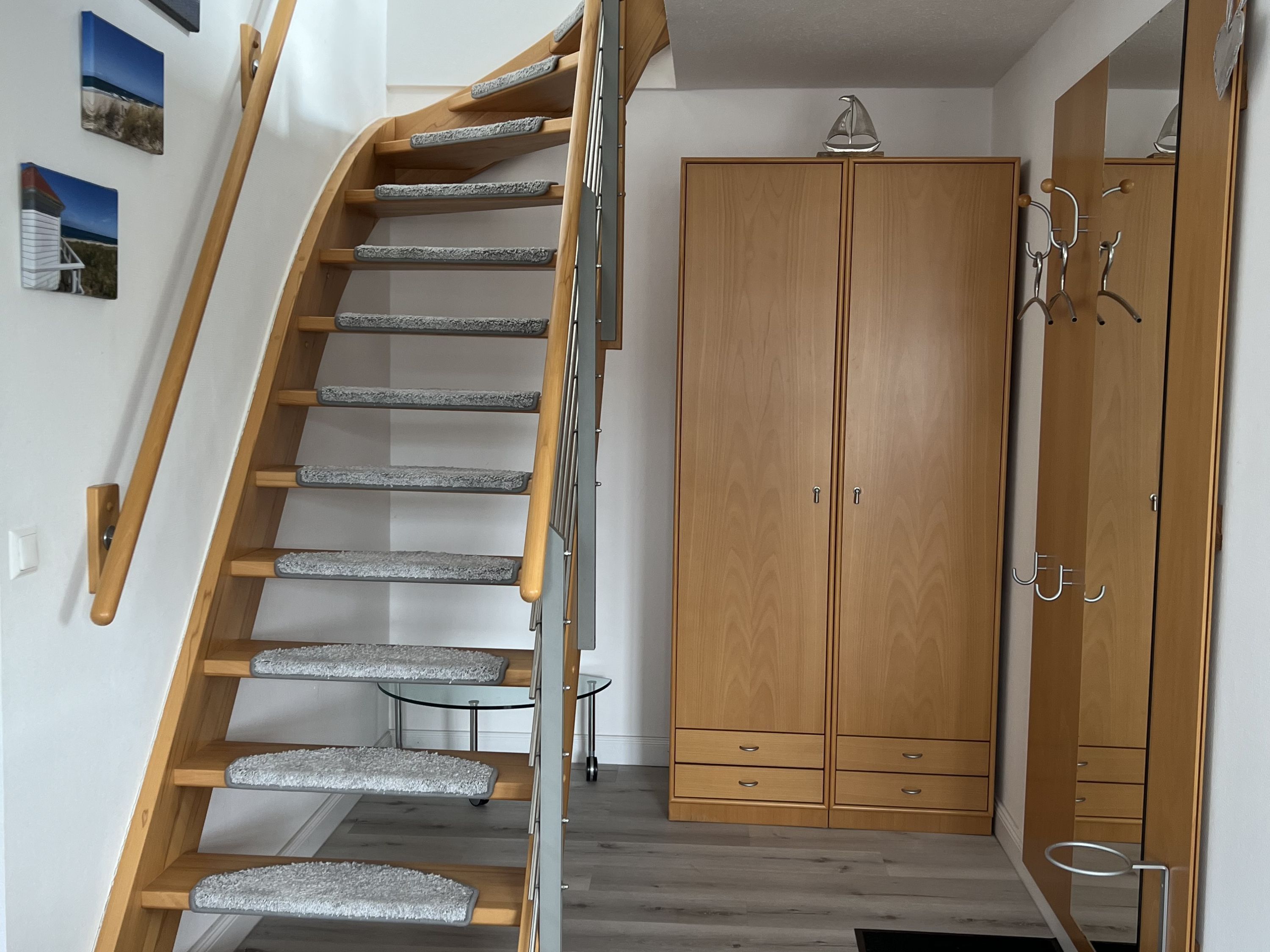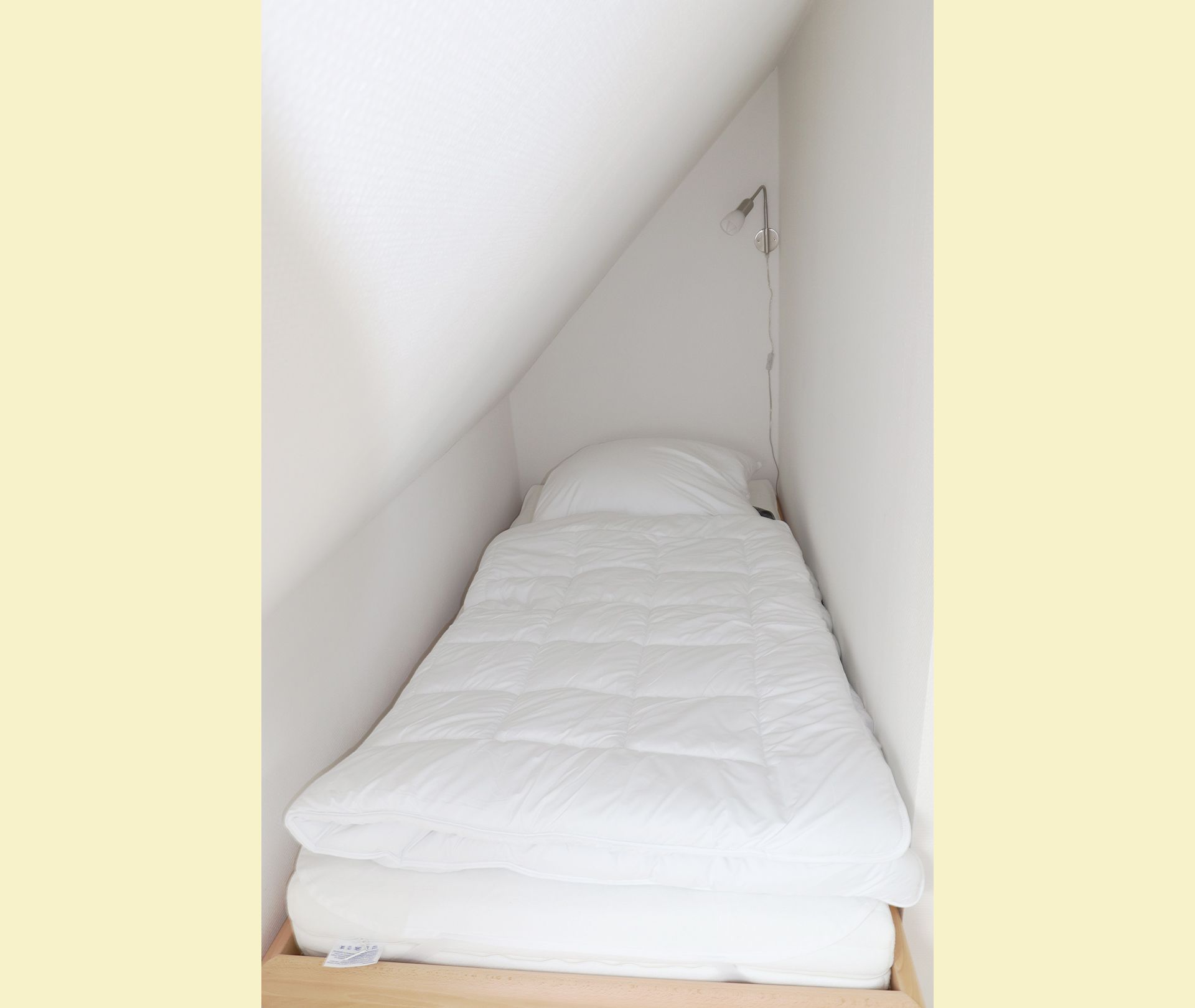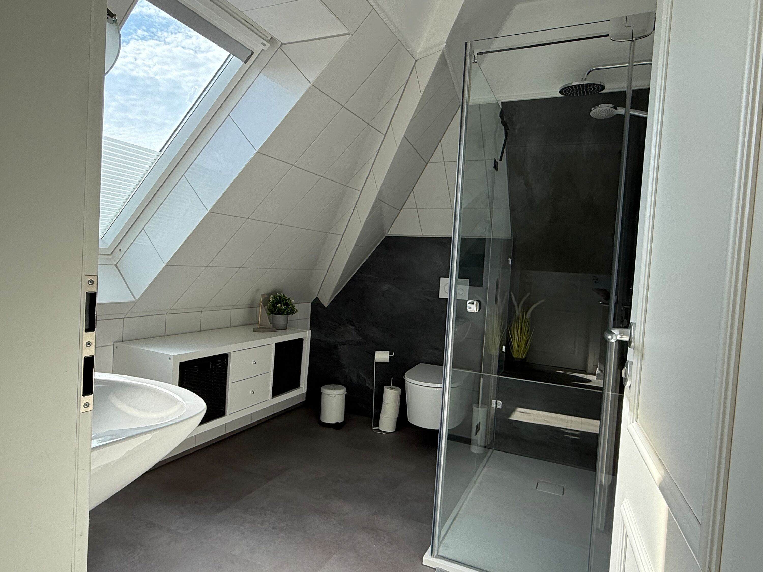 Auf dieser Etage befindet sich auch ein Gäste-WC. Über eine Treppe im Appartement gelangen Sie in das ausgebaute Dachgeschoss, wo sich das frisch renovierte Badezimmer mit Dusche, sowie das Schlafzimmer mit einem Doppelbett (180x200) und TV befinden. In einem Nebenraum stehen Ihnen ein weiteres Doppelbett (140x200) und ein Einzelbett zur Verfügung.
