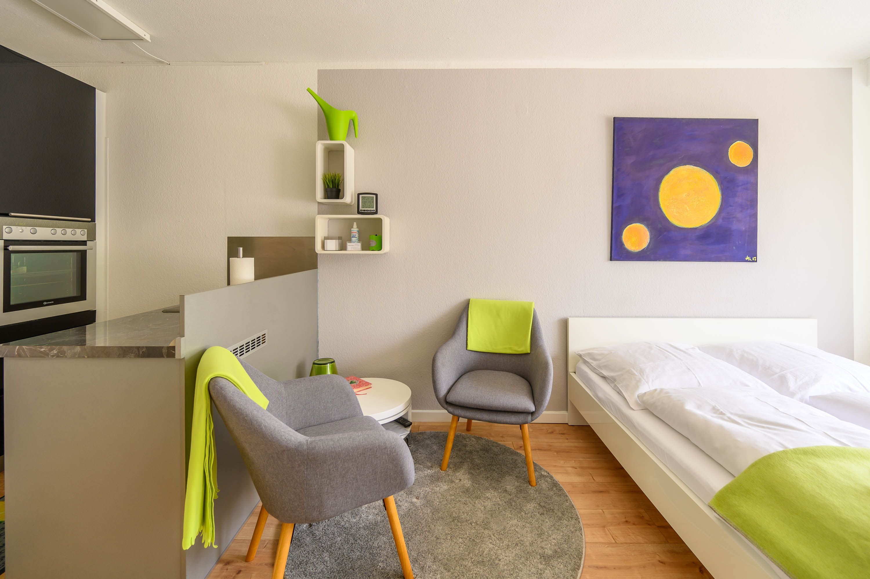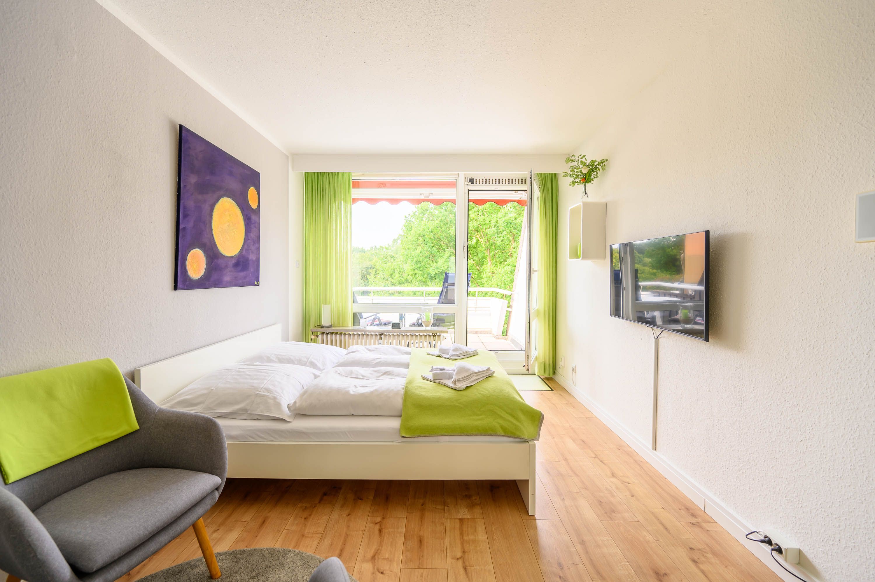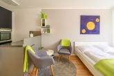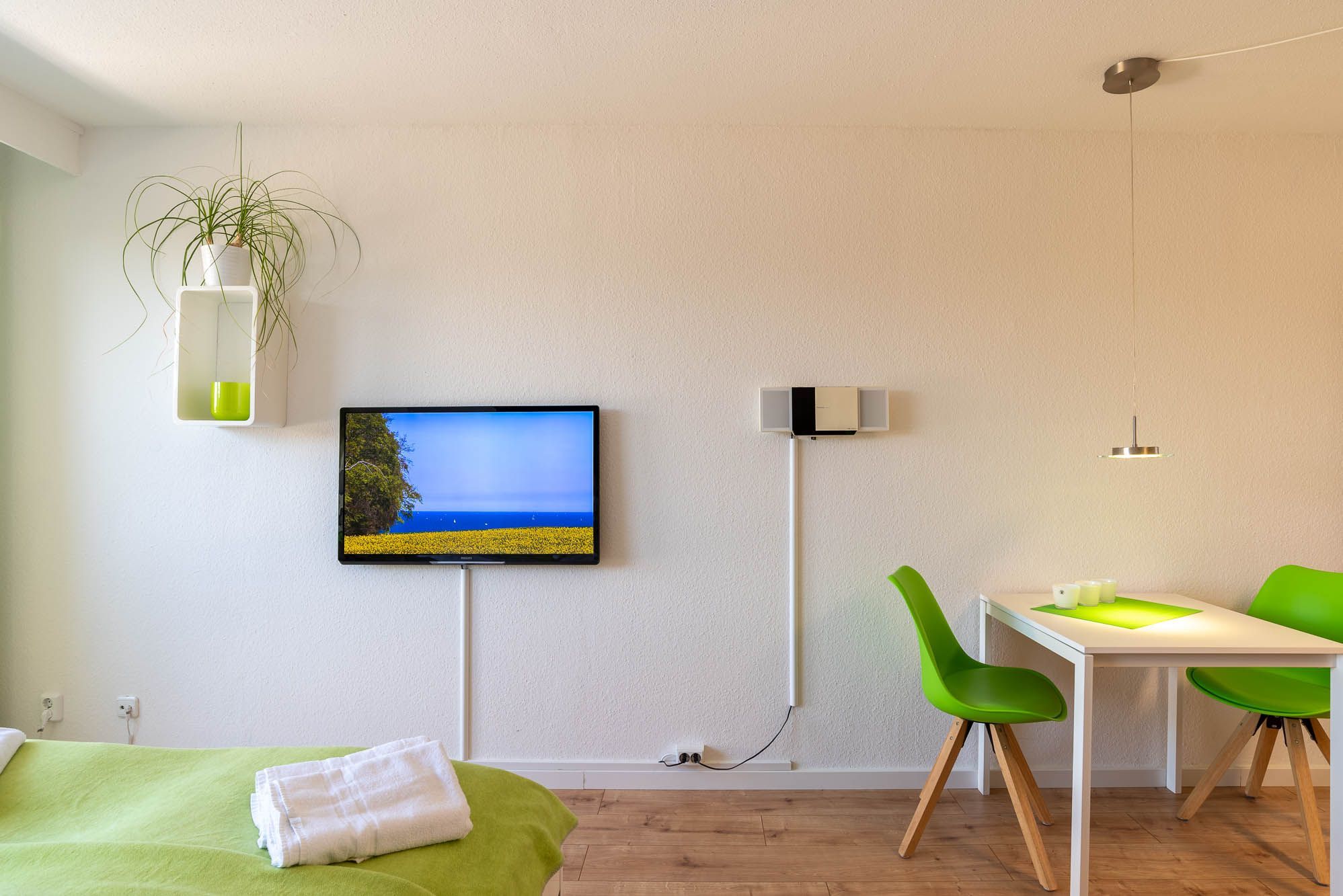 Der kombinierte Wohn- und Schlafraum verfügt über ein Doppelbett in der Größe von 160x200 cm mit getrennten Matratzen. Von hier, oder von dem schicken Sessel aus, können Sie bequem fernsehen. Neben einem LCD-Fernseher ist die Wohnung zudem mit einer Stereoanlage ausgestattet.