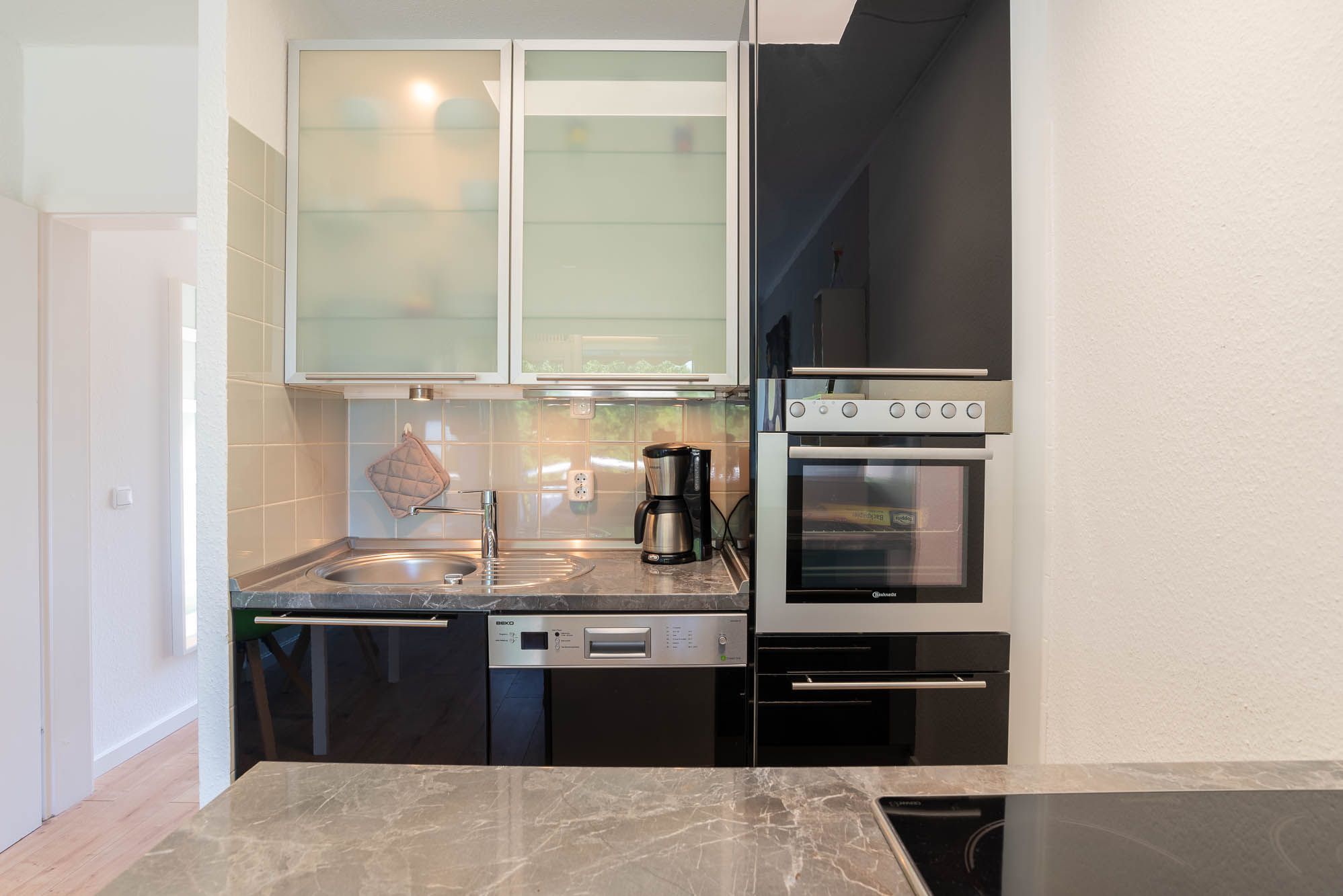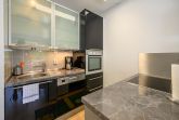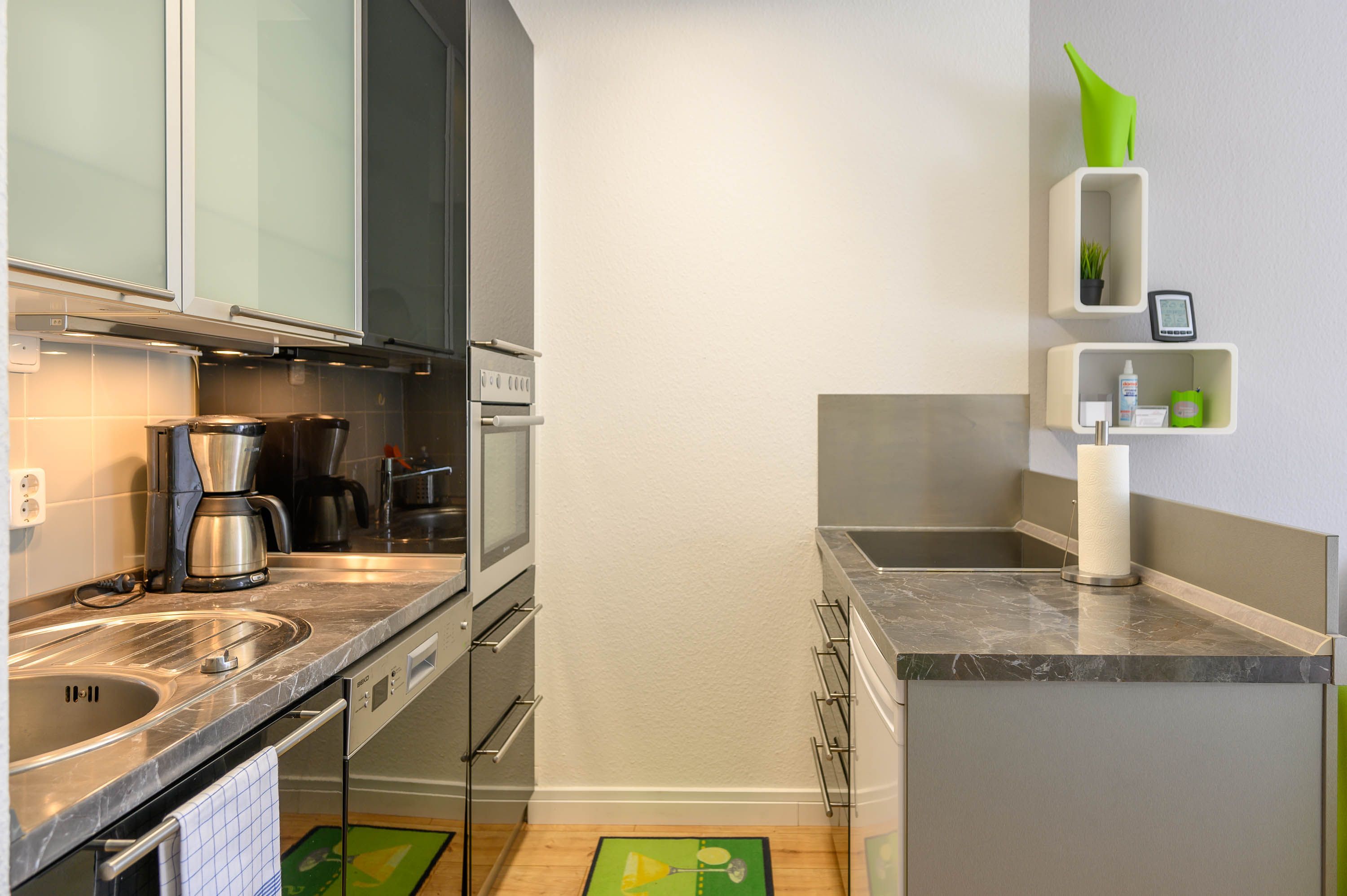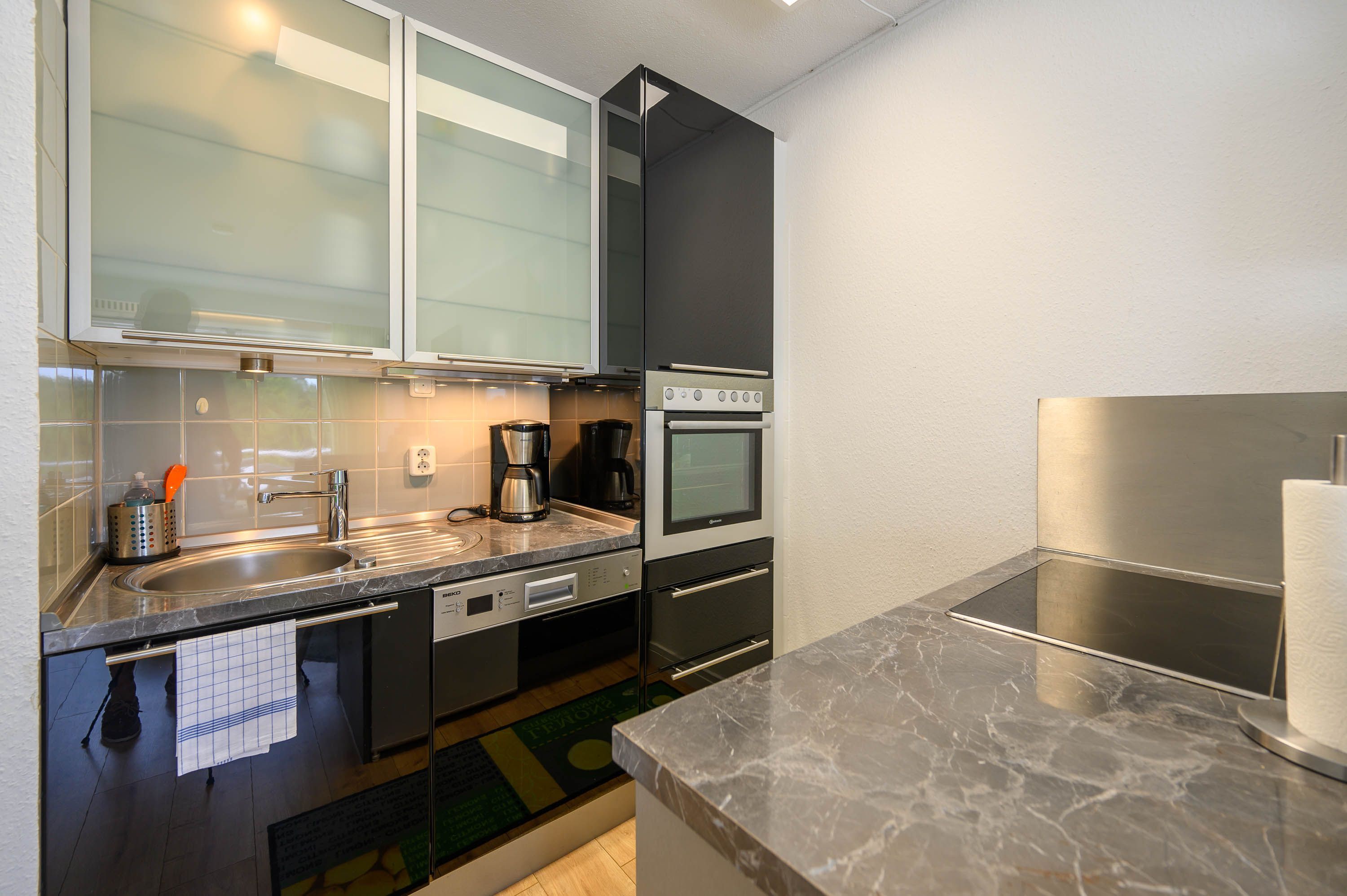 Die mit einer halbhohen Wand abgetrennte moderne Einbauküche hat ein Cerankochfeld, eine Geschirrspülmaschine, sowie einen Kühlschrank mit Gefrierfach. Eine Besonderheit ist der Backofen in erhöhter Position.