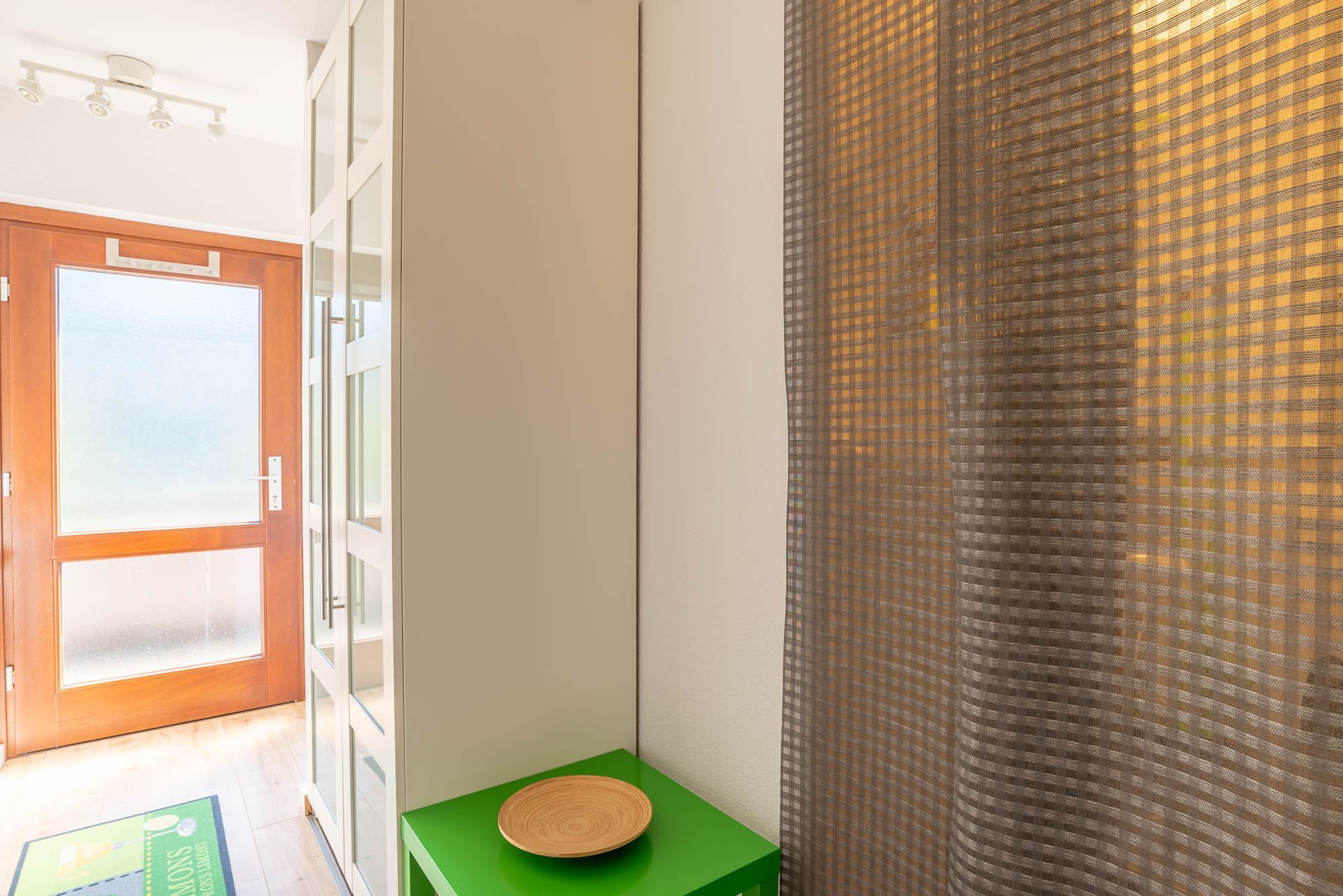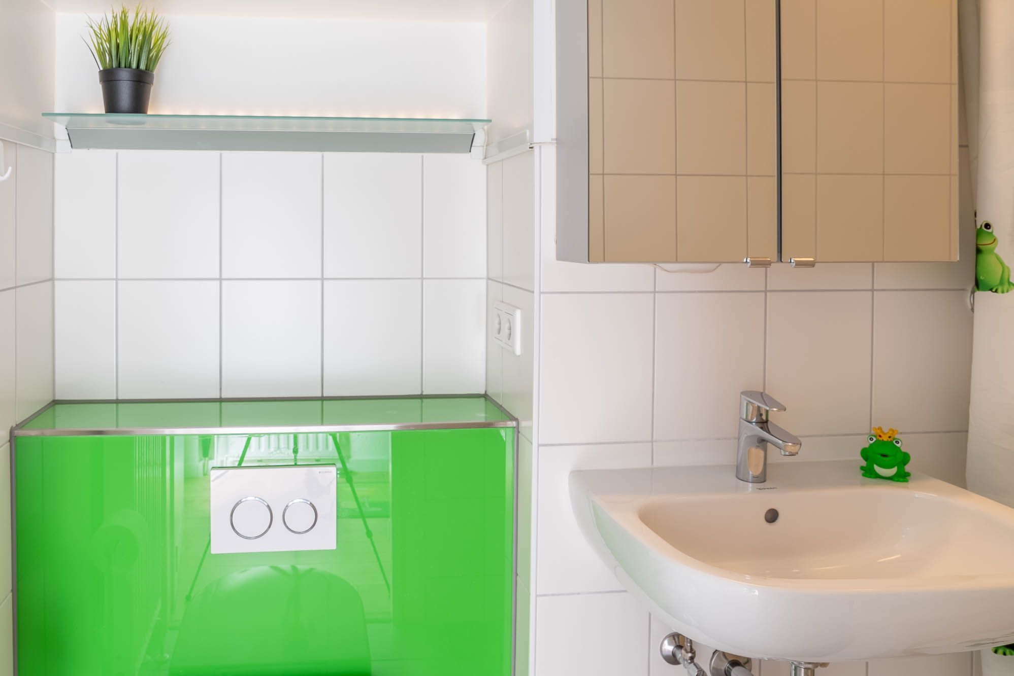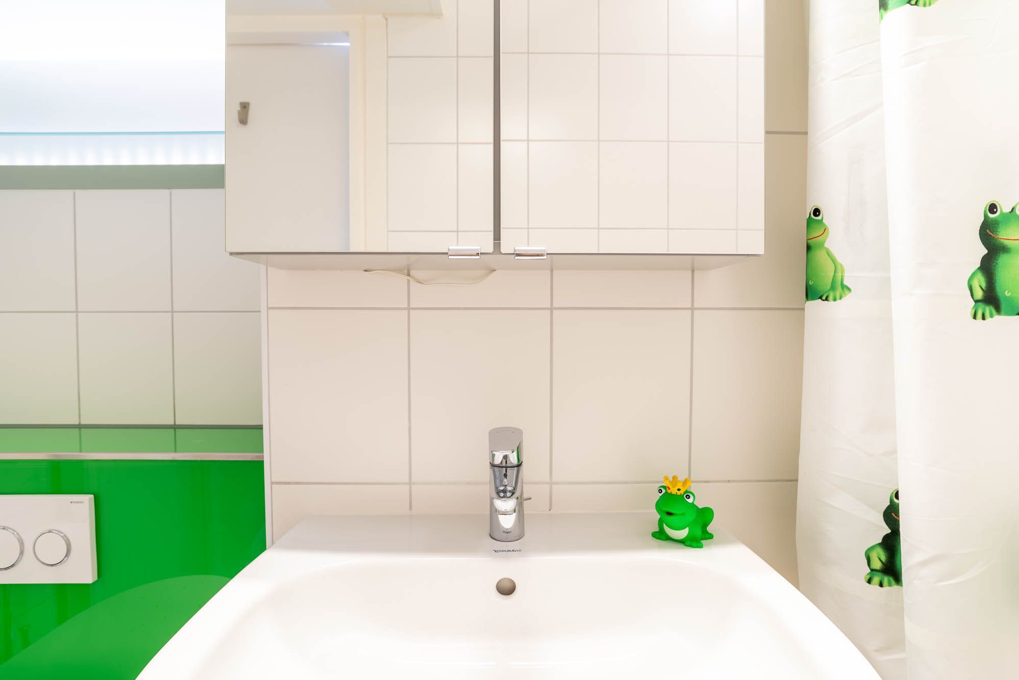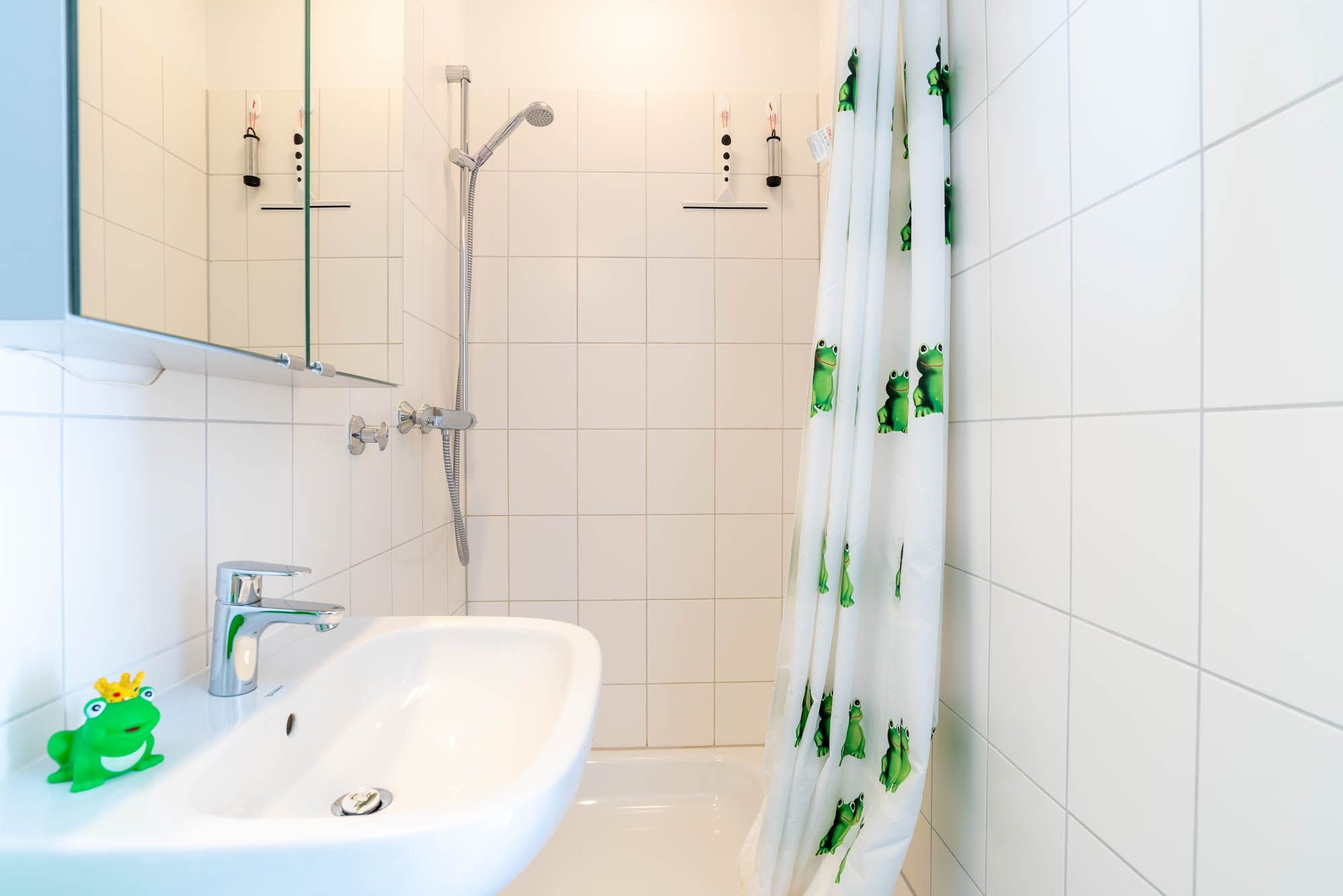 Das Duschbad ist hell, freundlich und durch die Farbgestaltung auf den Froschkönig abgestimmt. Im Flur befindet sich ein Schrank, der während Ihres Aufenthalts ausreichend Stauraum bietet.