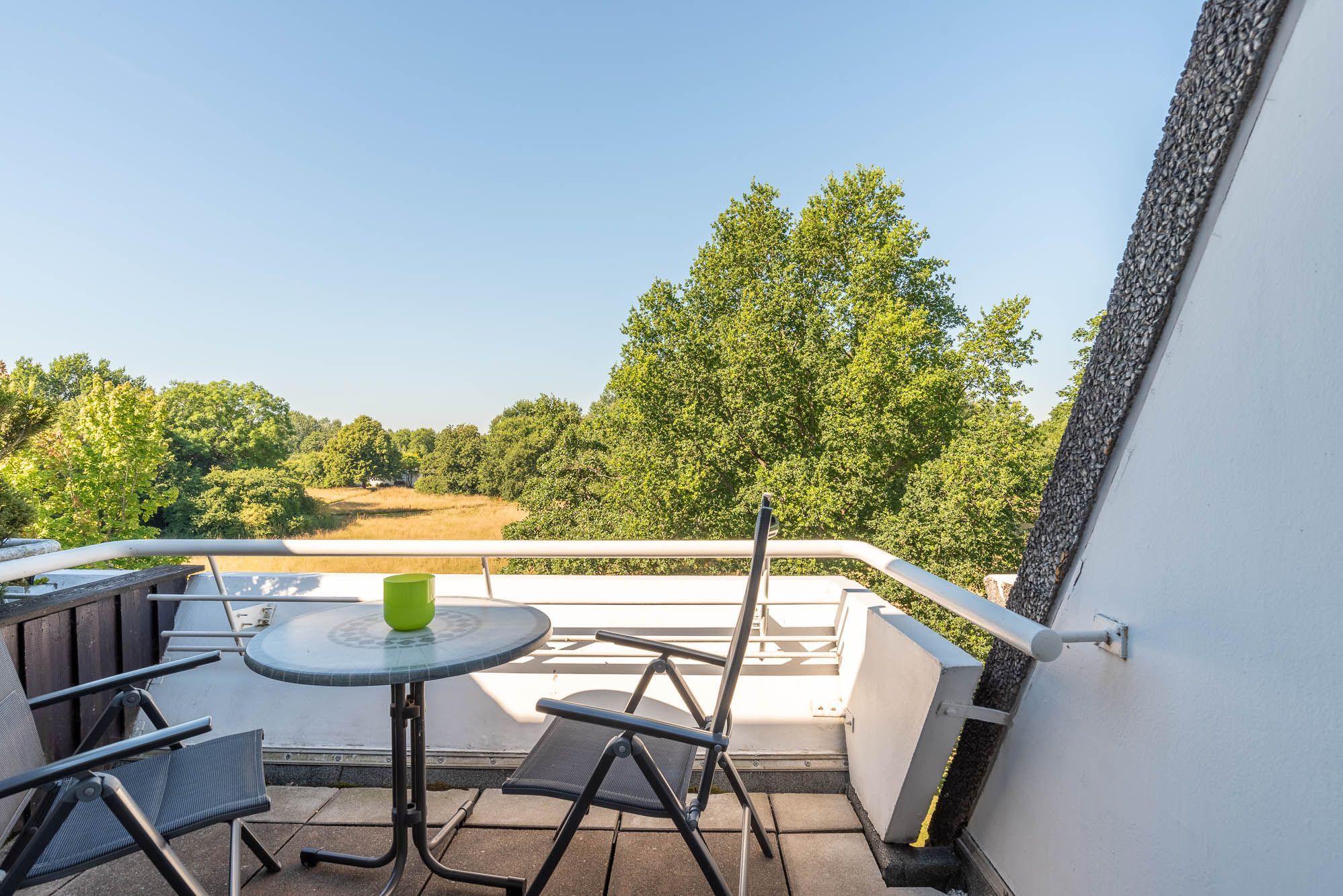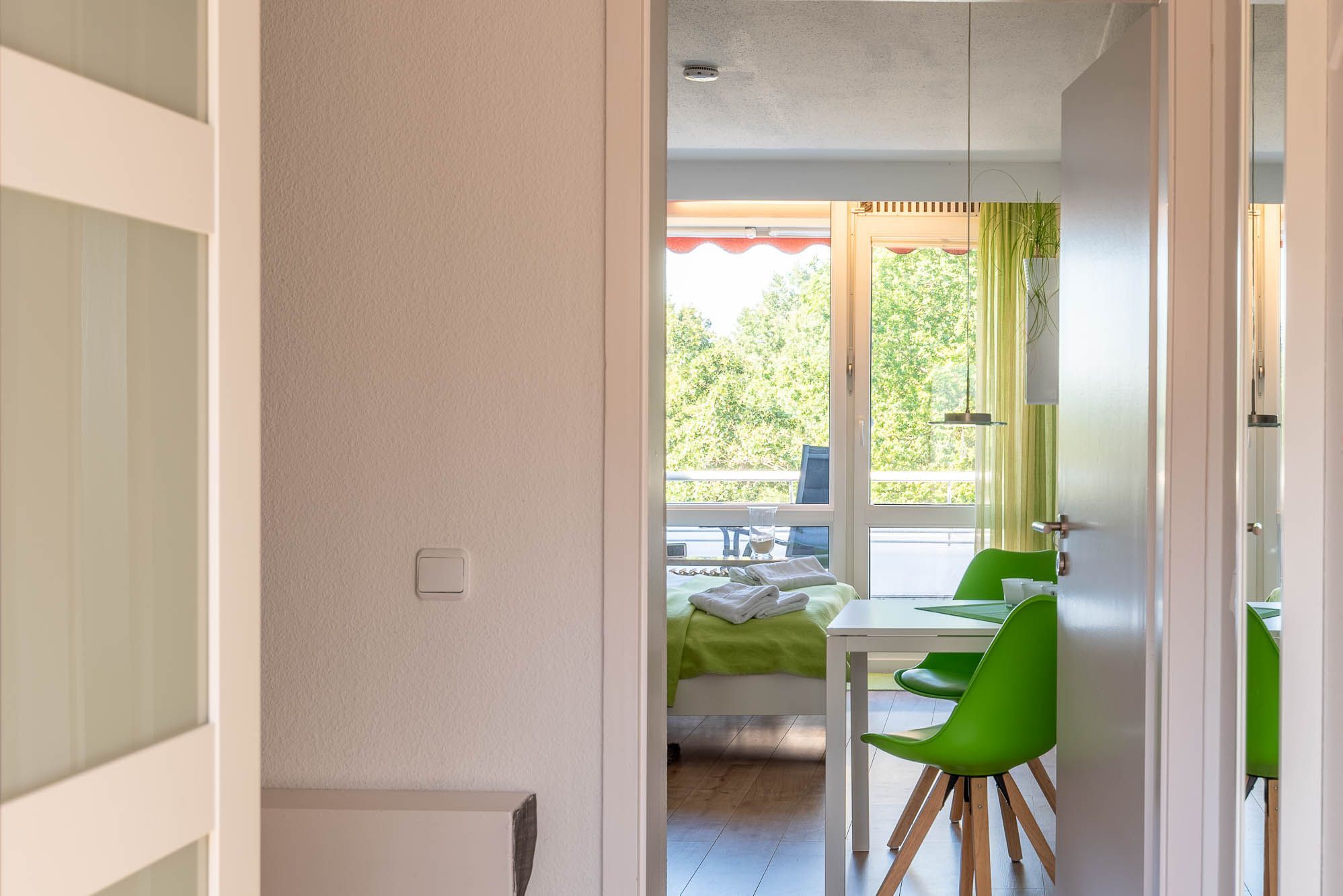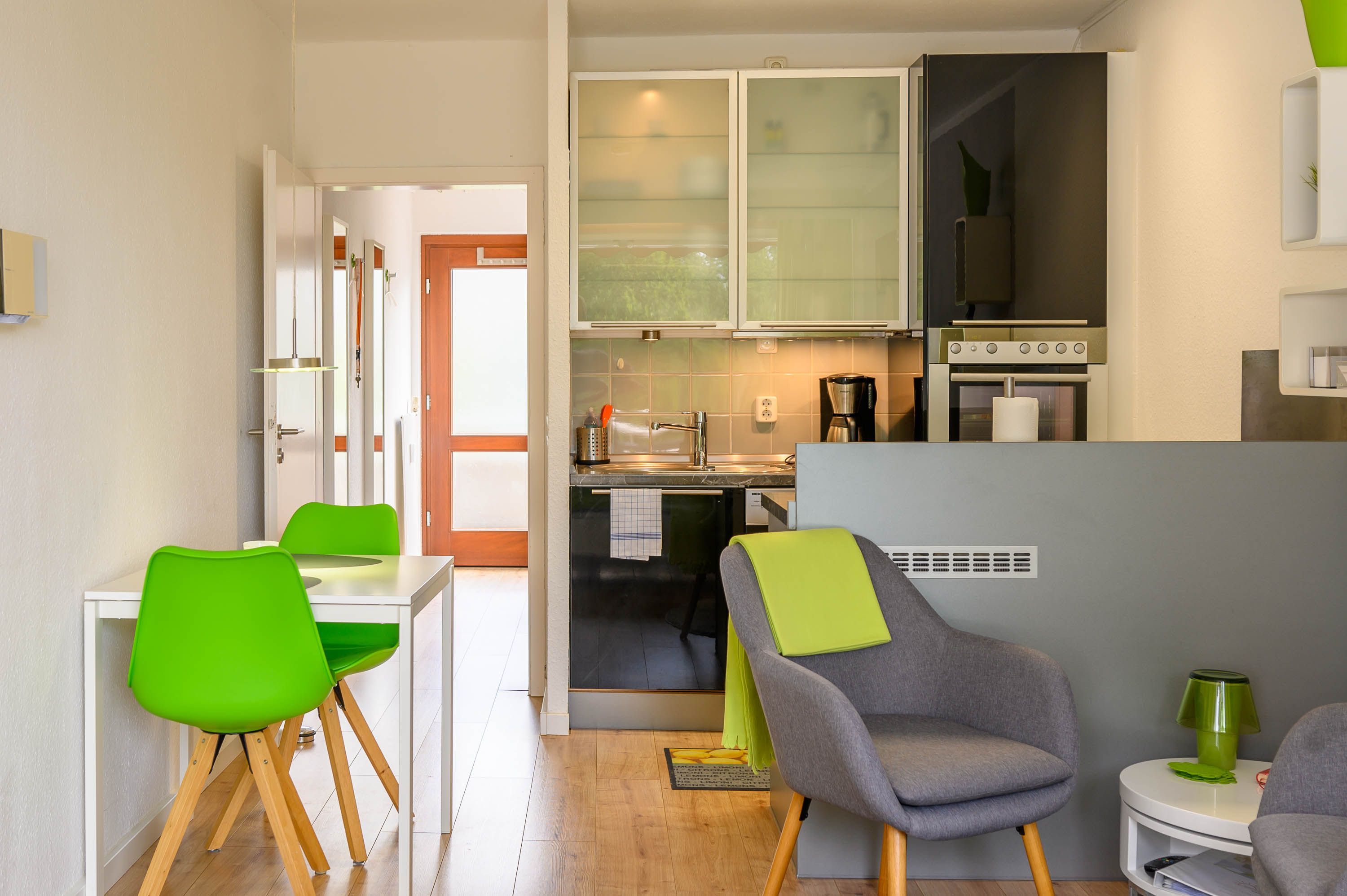 Ein Esstisch mit zwei Stühlen bietet eine angenehme Sitz-, und Aufenthaltsmöglichkeit. Aber auch der Balkon ist mit zwei Stühlen, einem Tisch und einer Markise ausgestattet. Genießen Sie bis in den Abend hinein die Sonne und den entspannenden Blick ins Grüne.