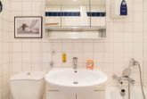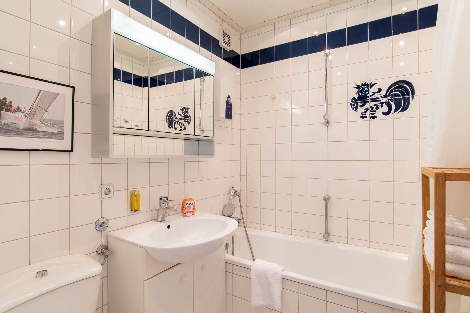 Das Badezimmer mit Badewanne befindet sich in einem gepflegten Zustand und verfügt neben einem Spiegel noch über ausreichend Ablagefläche.