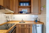 Im kombinierten Wohn-, und Essbereich befindet sich direkt am Fenster ein geschmackvolles Sofa, ein Couchtisch und ein Sessel. Auch vom Esstisch aus, welcher sich auf der anderen Seite der Fensterfront befindet, haben Sie einen tollen Blick nach draußen. Die offene Pantry-Küche ist optisch durch ein Regal vom Essbereich abgetrennt. In der Einbauküche finden Sie alles, was Sie für ein exklusives Frühstück auf dem Balkon in der Morgensonne brauchen. Neben Kaffeemaschine, Toaster und Wasserkocher befindet sich auch noch ein Kühlschrank mit separatem Gefrierfach, ein Ceranherd mit Backofen und sogar ein Geschirrspüler.