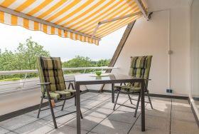 Vom Flur aus gelangen Sie in das 1-Zimmerappartment. Die Ferienwohnung verfügt in ganzer Breite über eine bodentiefe Fensterfront und einen dementsprechend langen Balkon. Die südwestliche Ausrichtung des Balkons mit Blick ins Grüne lässt Sie fast den ganzen Tag über Sonne haben. Eine Markise, sowie Gartenmöbel stehen Ihnen zur Verfügung, so kann auch bis in die Abendstunden hinein der Tag und die Sonne auf dem Balkon genossen werden.