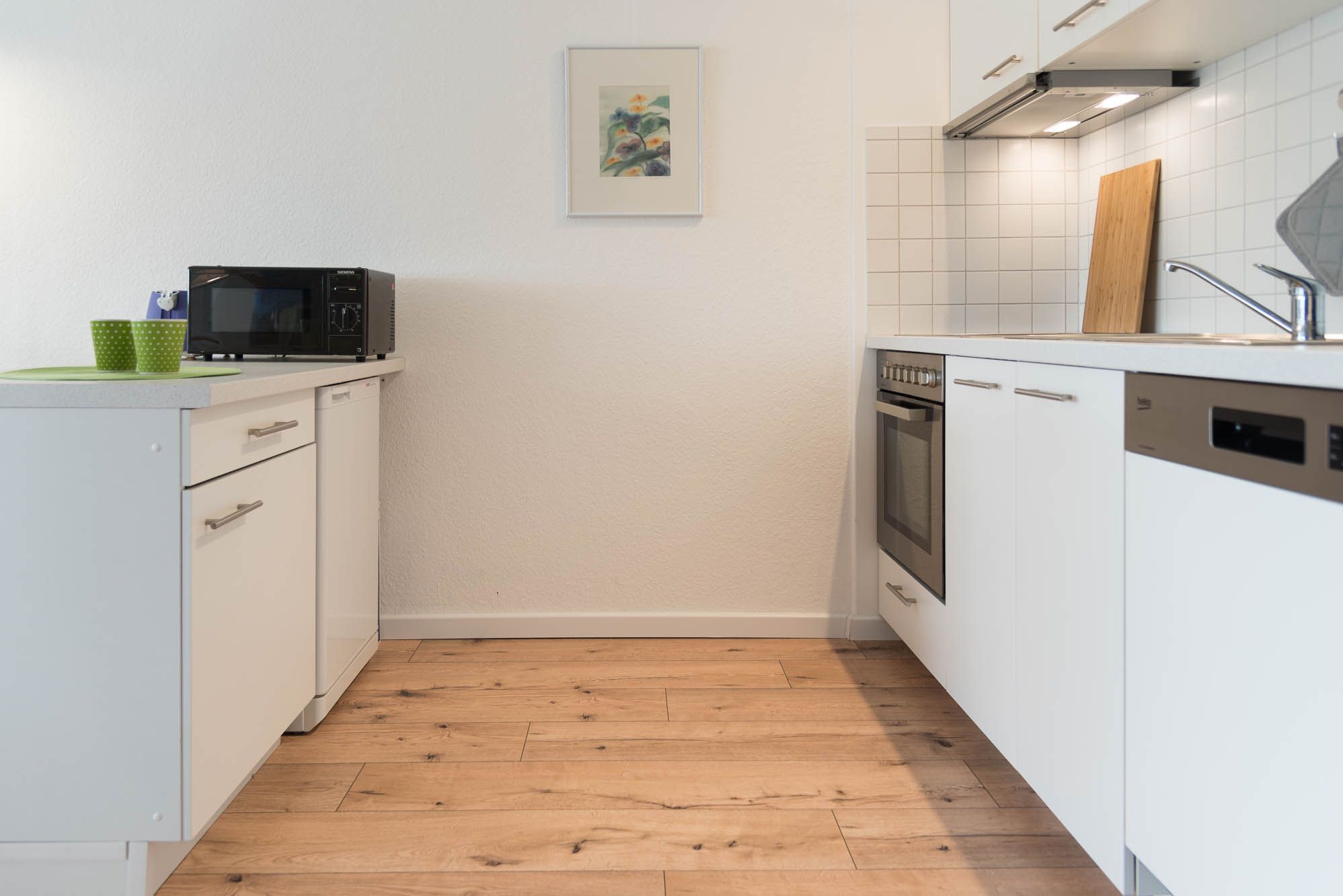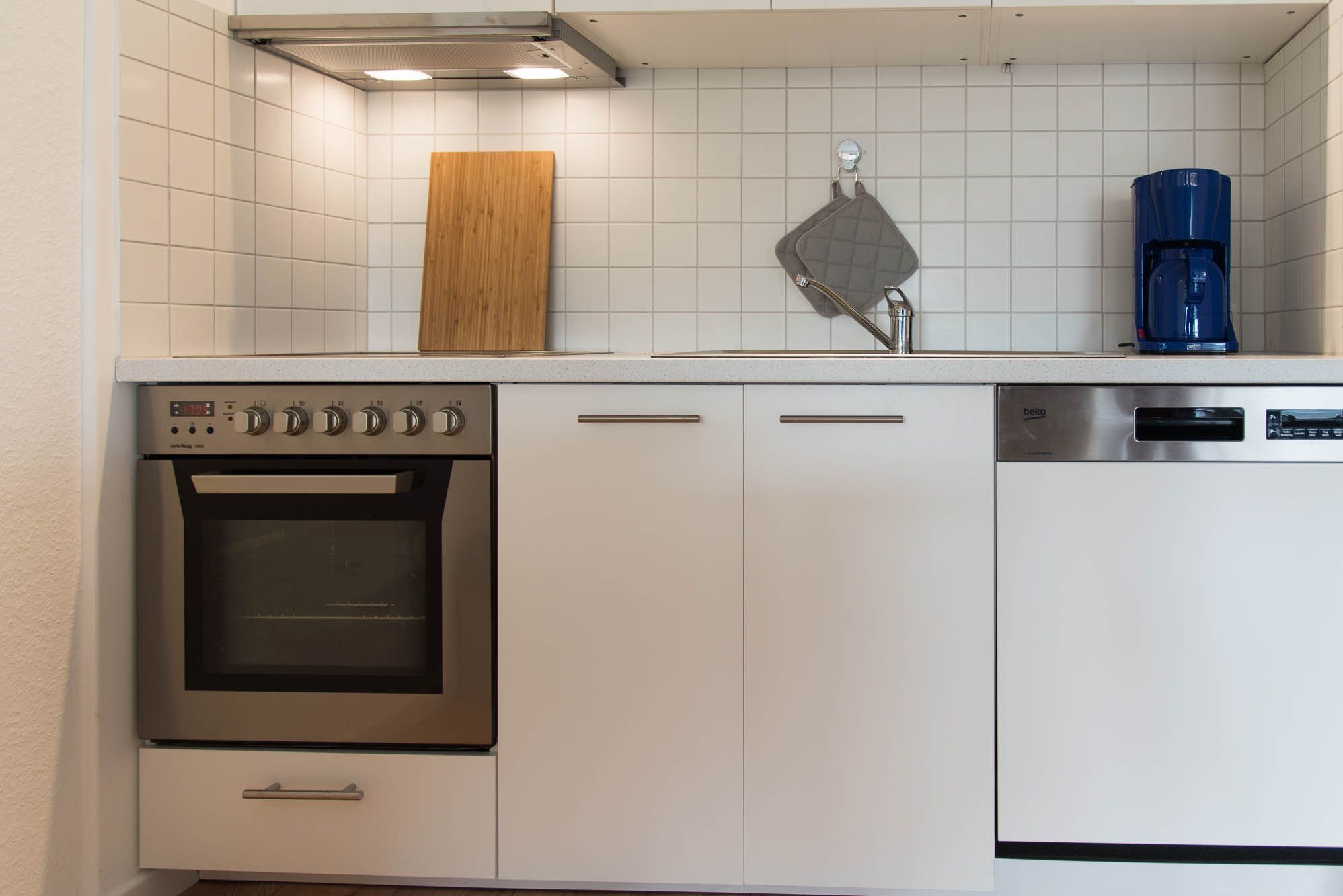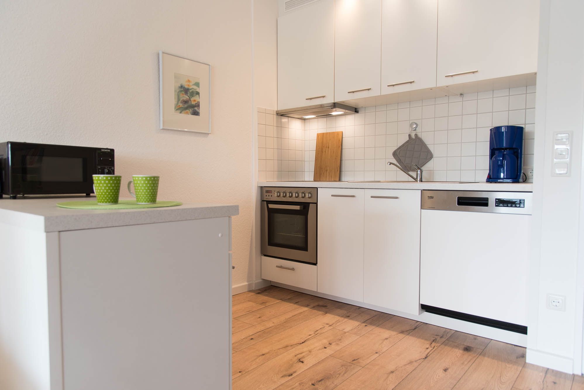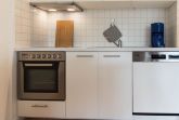 Die Ferienwohnung ist mit einer Wohnküchenzeile ausgestattet. Neben der Grundausstattung wie einem Backofen, Cerankochfeld, Wasserkocher, einer Kaffeemaschine und ausreichend Geschirr, ist auch eine Geschirrspülmaschine vorhanden. Mit dieser Ausstattung steht einer selbstgemachten Mahlzeit nichts mehr im Wege. Ein Küchenschrank als Tresen grenzt die Küche geschickt vom Wohnbereich ab.