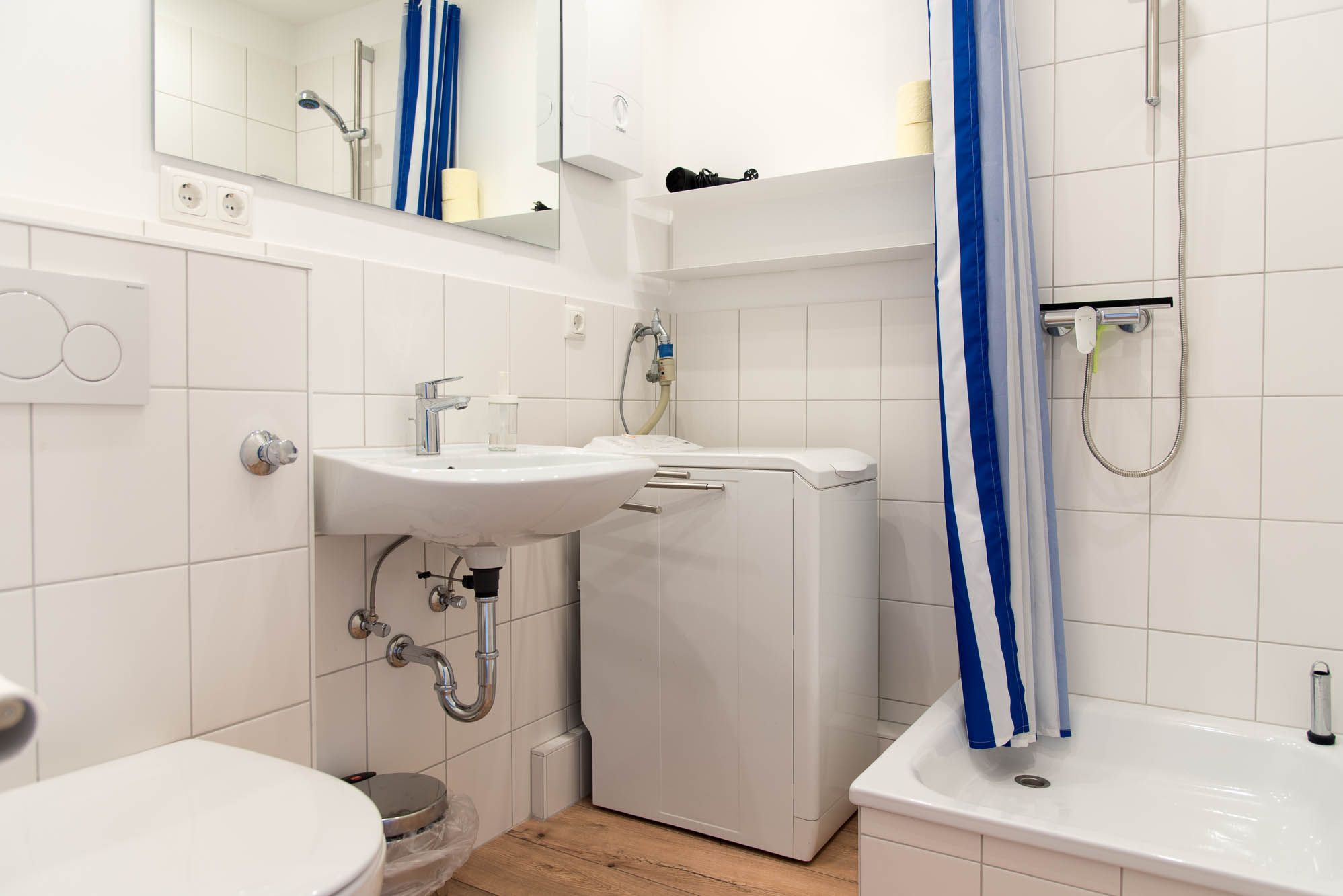 Das moderne Badezimmer ist vom Flur aus zu erreichen und ist auch mit Holzfußboden ausgelegt. Neben einer Dusche, einem WC, Waschbecken und einem großen Spiegel verfügt das Badezimmer zusätzlich über eine Waschmaschine.
