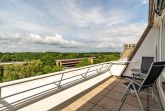 Zu dieser Wohnung gehört ein 9 qm großer Balkon mit Hochlehner-Stühlen und ein Tisch. Der freie Blick zu den Salzwiesen ist ruhig und Sie können den ganzen Tag die Sonne genießen (Süd-West-Lage).