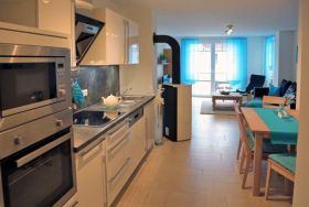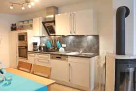 Der Wohn- und Essbereich empfängt den Gast mit einer modern ausgestatteten, offenen Wohnküche, einem Essbereich, einer TV-Lounge bestehend aus einem gemütlichen Ecksofa sowie einem Relax Sessel zum Entspannen. Die luxuriöse Einbauküche ist hochwertig und komplett ausgestattet. Ein Kaminofen macht die Wohnung auch für die kühlere Jahreszeit gemütlich (Kaminholz muss selbst organisiert werden). Außerdem steht für unsere Gäste eine Wii-Konsole mit diversen Spielen bereit, damit es zu keiner Zeit langweilig wird. Das moderne Tageslicht-Bad mit Dusche ist mit einem Handtuchwärmer und einem Föhn ausgestattet.