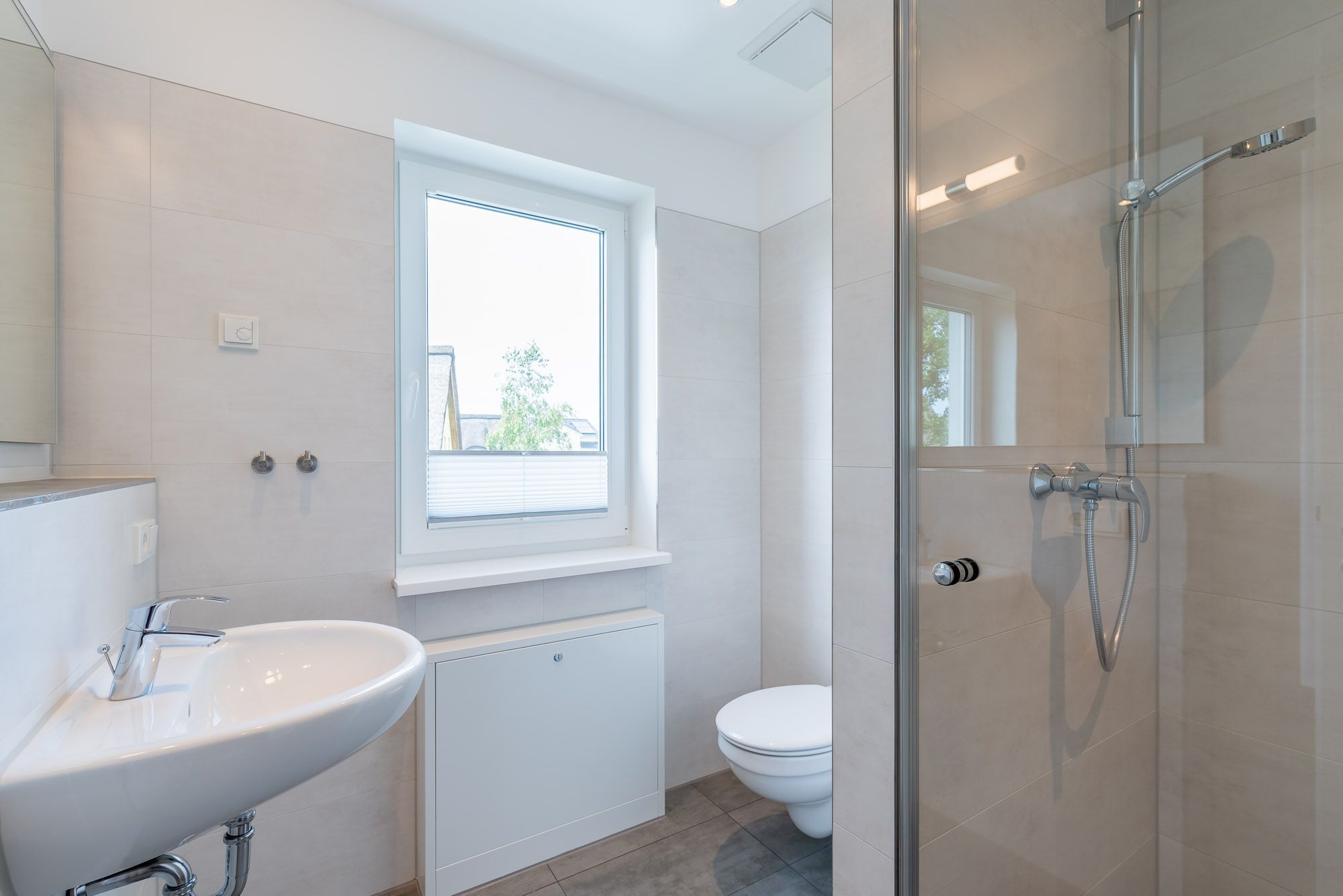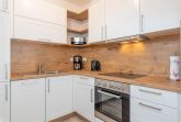 Durch Ihre eigene Haustür erreichen Sie das Erdgeschoss, die Diele ist mit Kleiderschrank und Schuhschrank möbliert. Rechts von der Diele ist ein Gäste-WC mit Duschbad untergebracht. Das helle Wohn-/Esszimmer lädt zum gemütlichen Verweilen ein. Hierzu gehören ein großer Massivholztisch mit sechs Sitzgelegenheiten, ein gemütliches Ecksofa und ein 139 cm TV/Tripletuner. Die offene Einbauküche in L-Form ist mit Markeneinbaugeräten ausgestattet.
