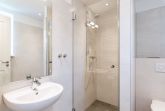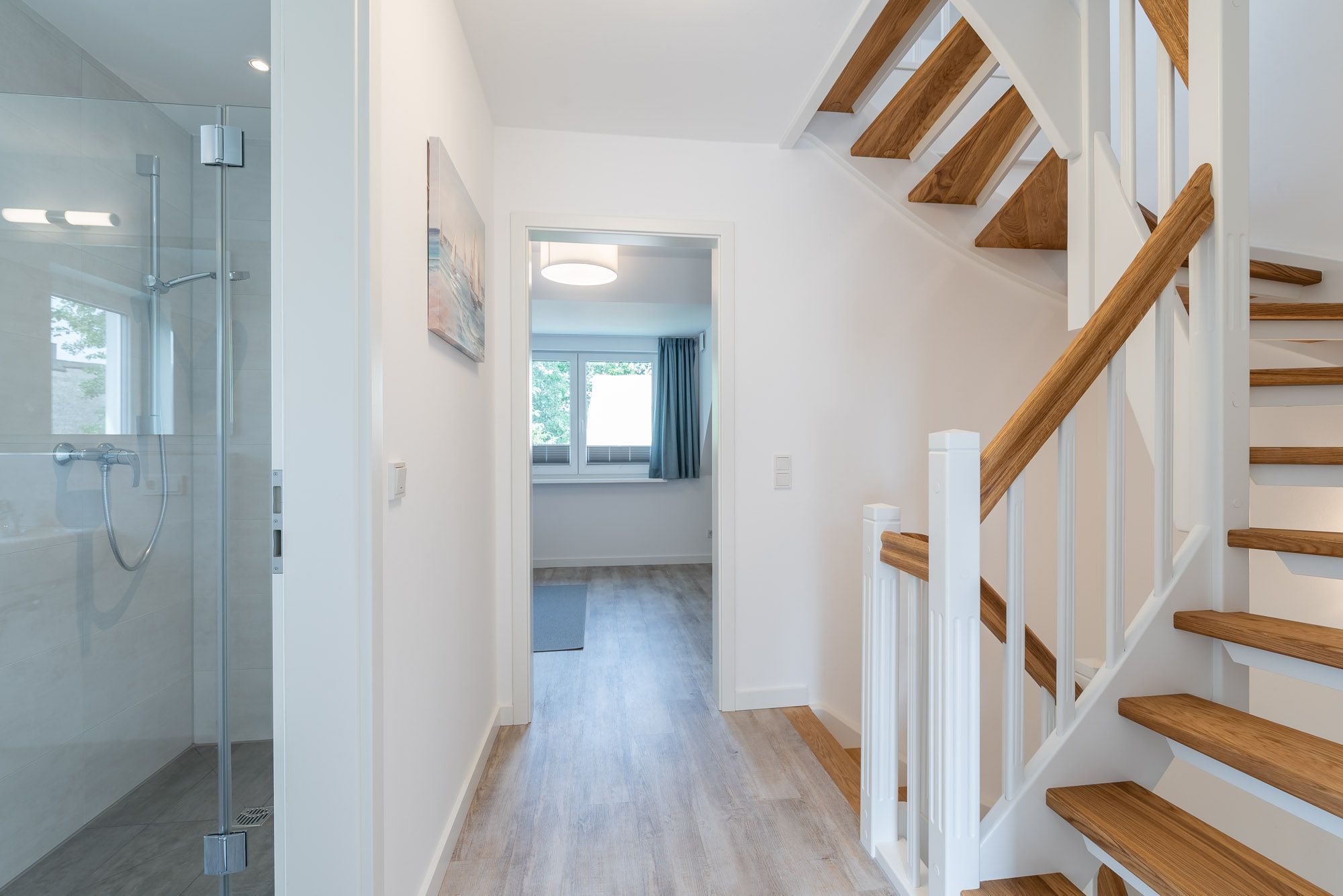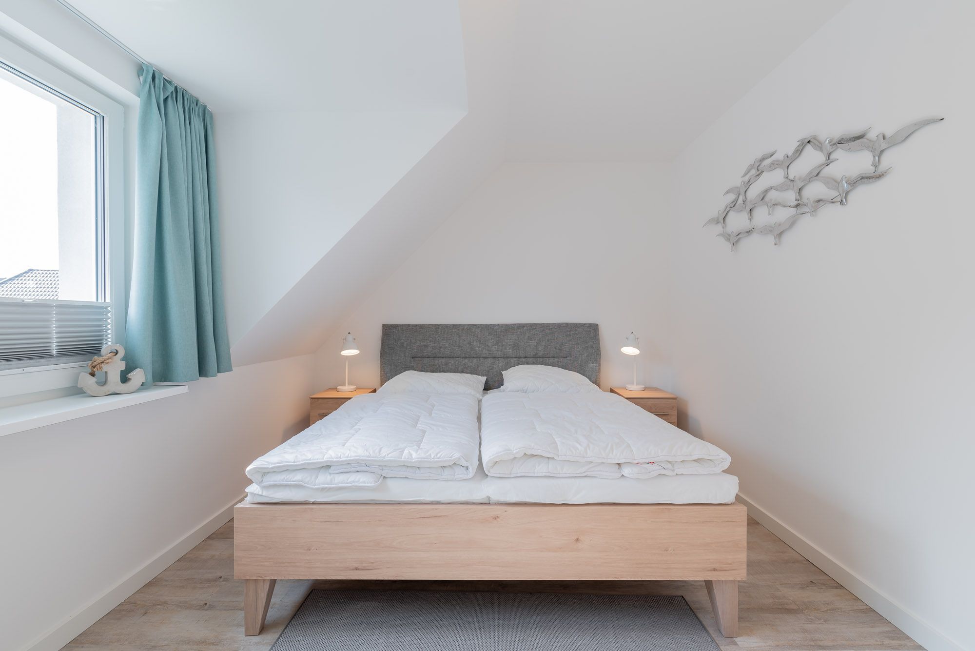 Im angrenzenden umzäunten Garten empfängt Sie eine nach Süden ausgerichtete Terrasse mit einer gemütlichen Sitzgruppe. Über eine hochwertige Treppenanlage erreichen Sie das Obergeschoss mit zwei Schlafräumen. Hier können Sie in 1,80 x 2,00 m breiten Doppelbetten Ihre Urlaubsträume genießen. In beiden Schlafräumen sind ebenfalls TV/Tripletuner vorhanden. Ein weiteres Duschbad mit WC steht auf dieser Etage zur Verfügung. Bei Bedarf ist ein drittes Zimmer mit Doppelbett (1,80 x 2,00 m) im Spitzboden vorhanden.