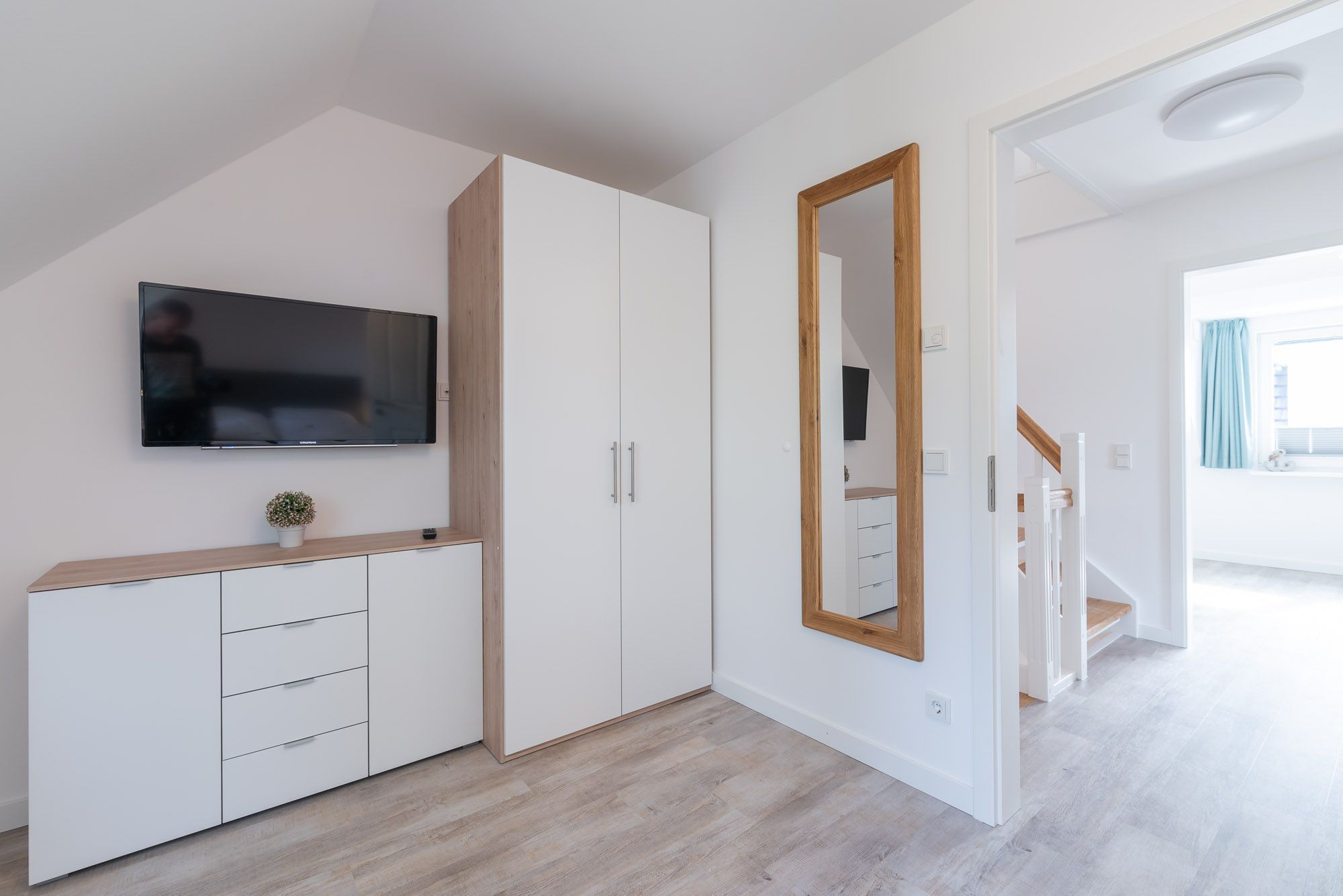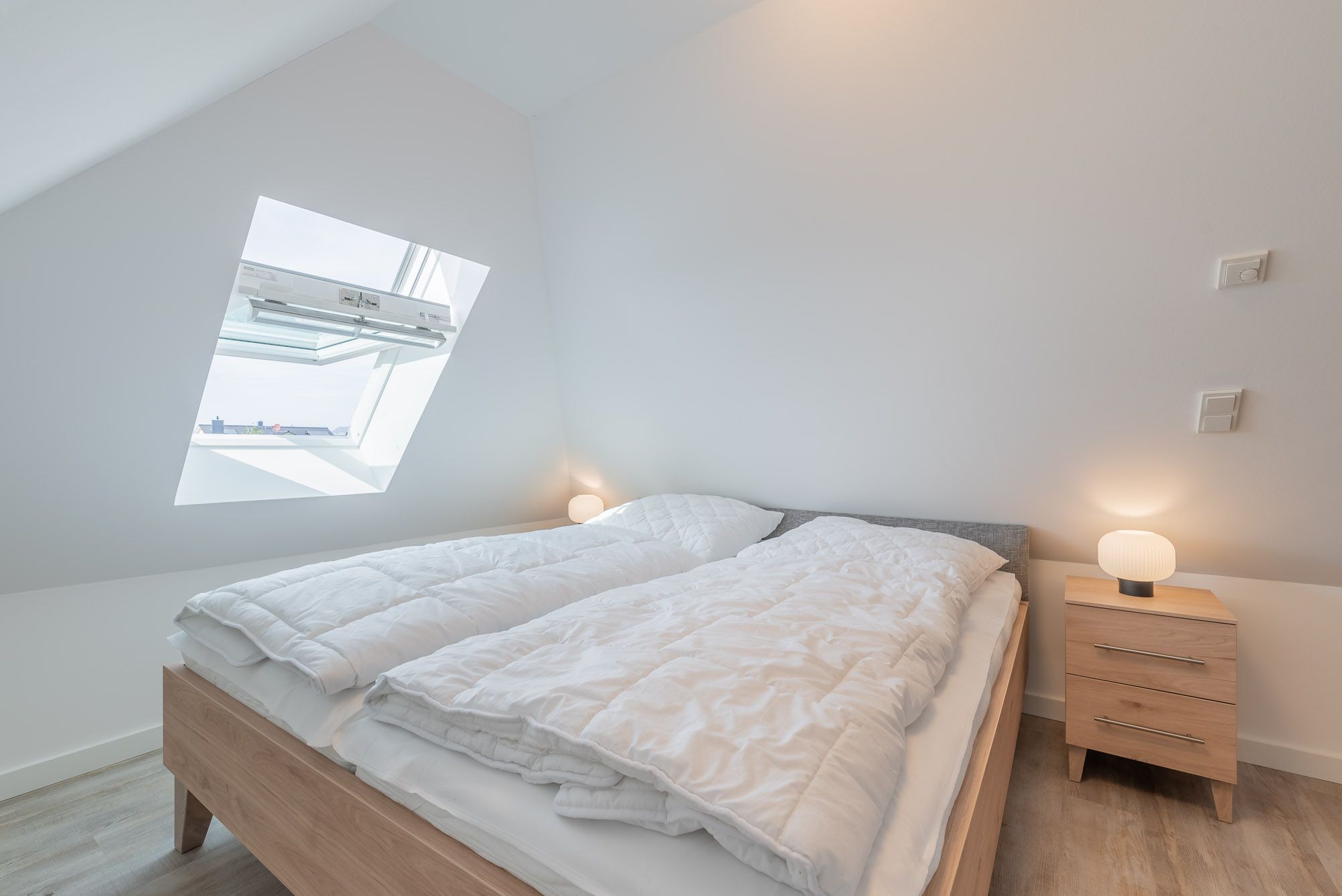 Im angrenzenden umzäunten Garten empfängt Sie eine nach Süden ausgerichtete Terrasse mit einer gemütlichen Sitzgruppe. Über eine hochwertige Treppenanlage erreichen Sie das Obergeschoss mit zwei Schlafräumen. Hier können Sie in 1,80 x 2,00 m breiten Doppelbetten Ihre Urlaubsträume genießen. In beiden Schlafräumen sind ebenfalls TV/Tripletuner vorhanden. Ein weiteres Duschbad mit WC steht auf dieser Etage zur Verfügung. Bei Bedarf ist ein drittes Zimmer mit Doppelbett (1,80 x 2,00 m) im Spitzboden vorhanden.