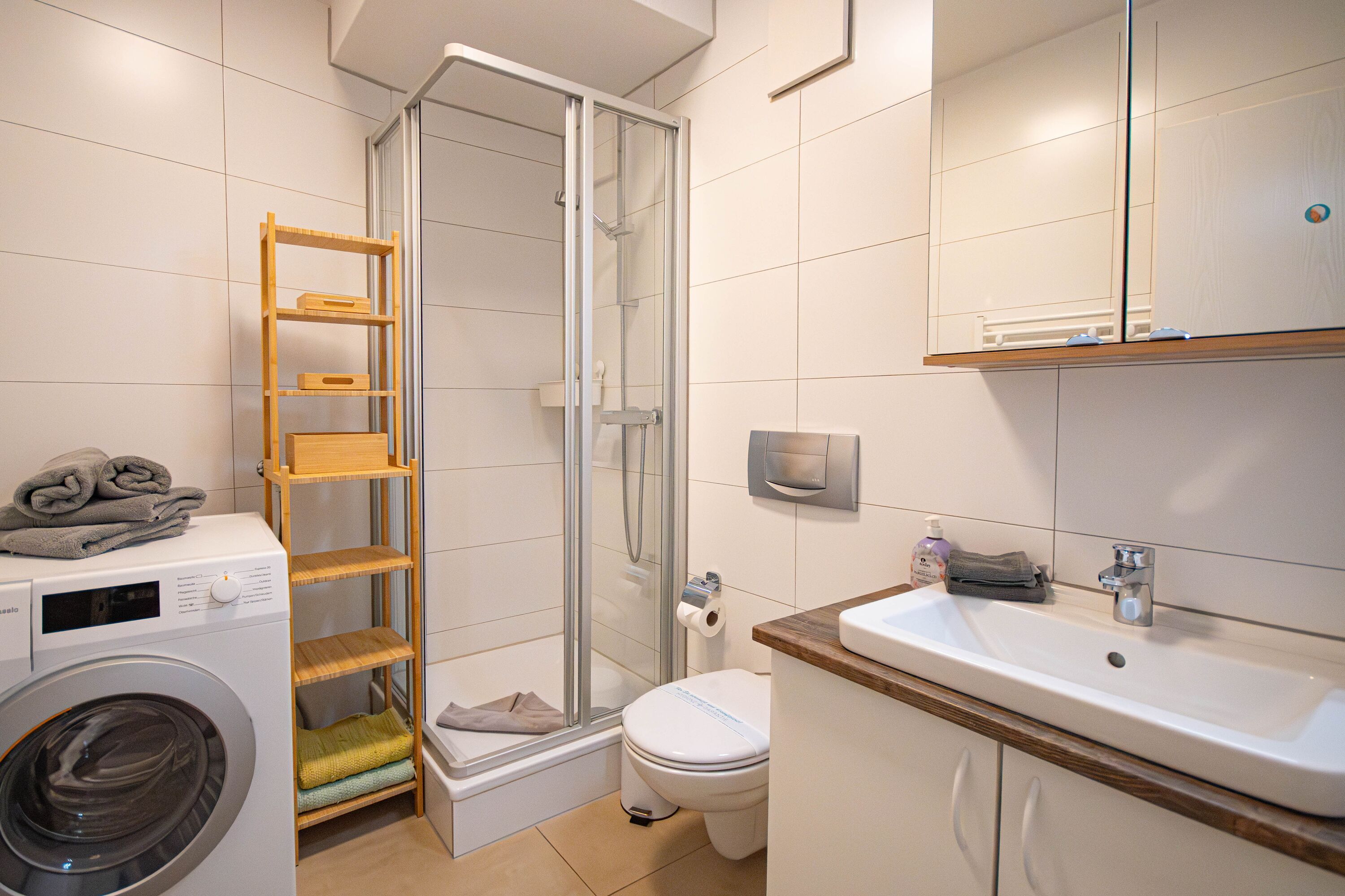 • Badezimmer: Modernes Bad mit Dusche und Waschmaschine für zusätzlichen Komfort.
