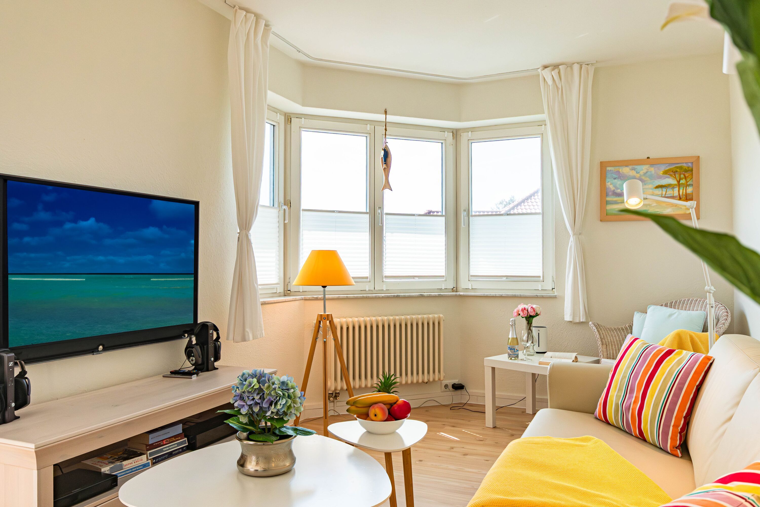 • Wohnbereich: Heller Wohn- und Essbereich mit bequemer Couch und großem Fernseher für entspannte Stunden.