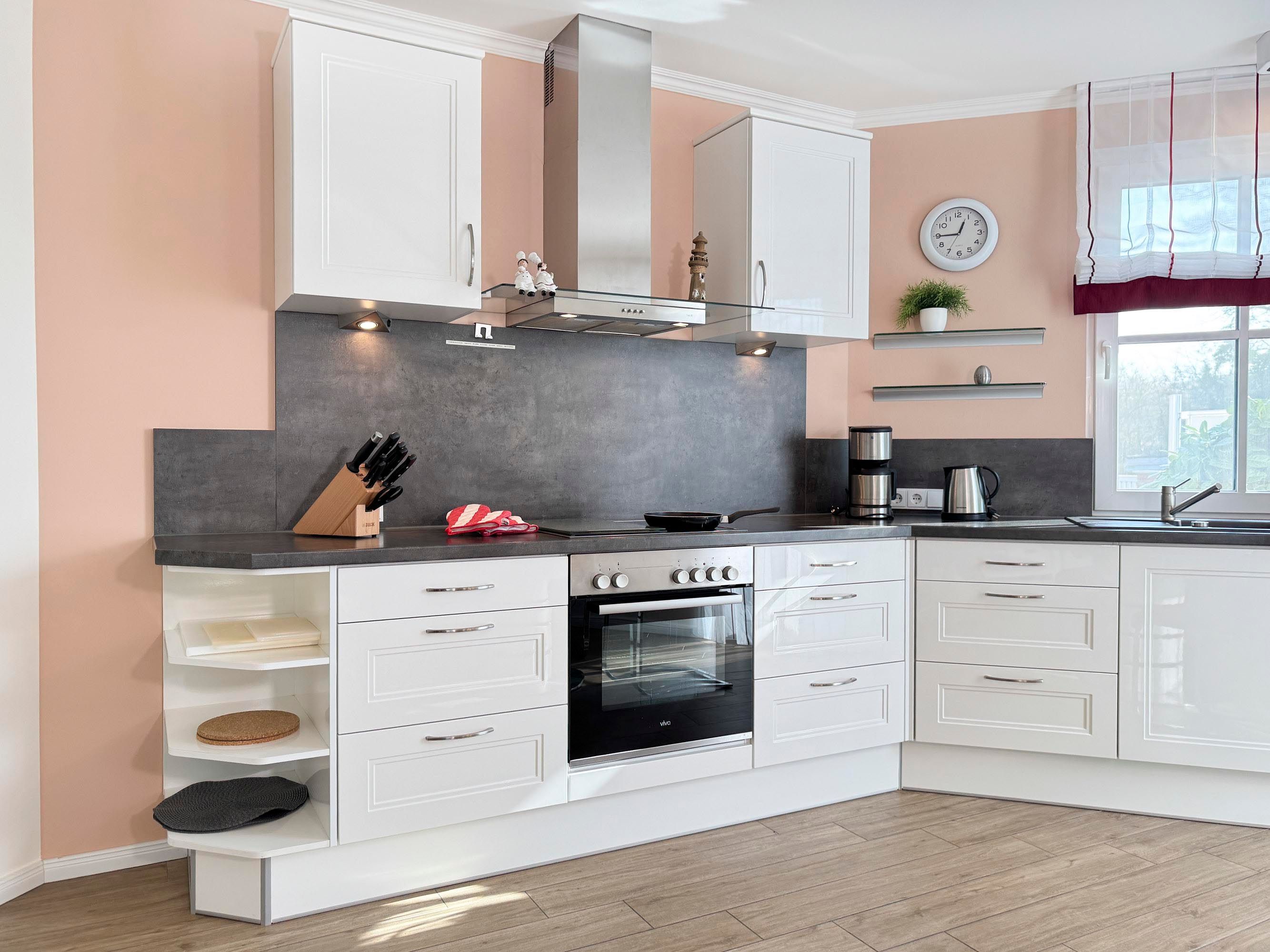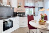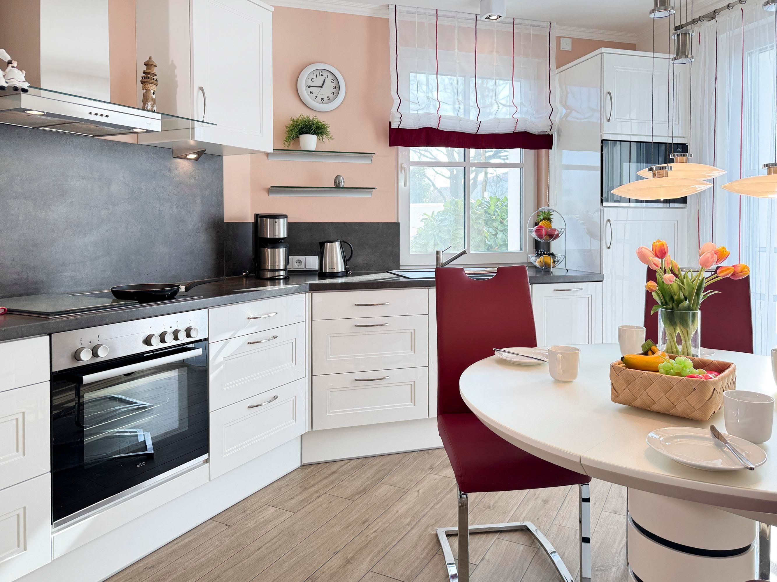• Küche und Essbereich: Offene, voll ausgestattete Küche mit Cerankochfeld, Backofen, Geschirrspüler, Kühlschrank mit Gefrierfach, Mikrowelle, Filterkaffeemaschine, Toaster, Wasserkocher und Küchenmixer. Die angrenzende Essgruppe lädt zu geselligen Mahlzeiten ein.