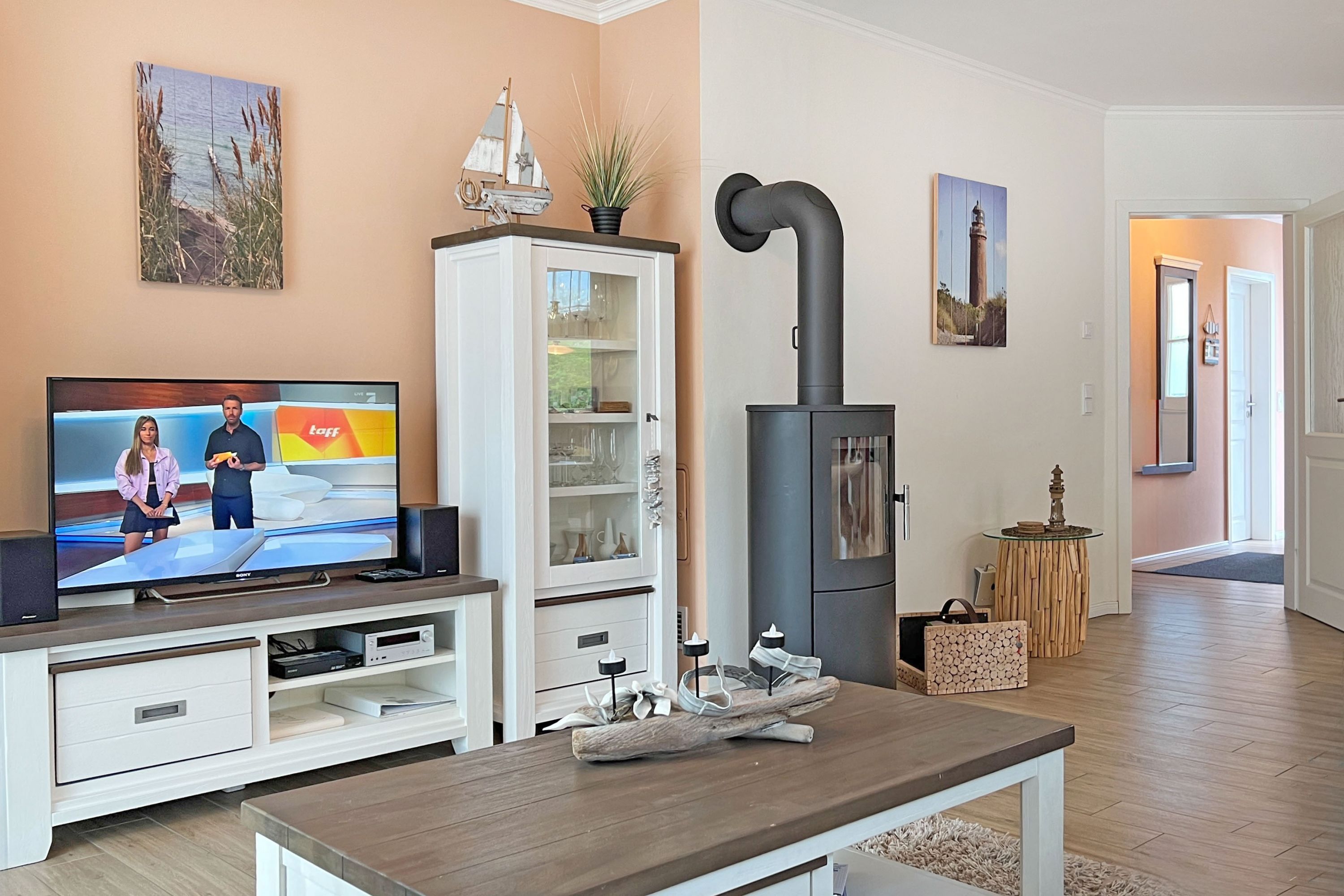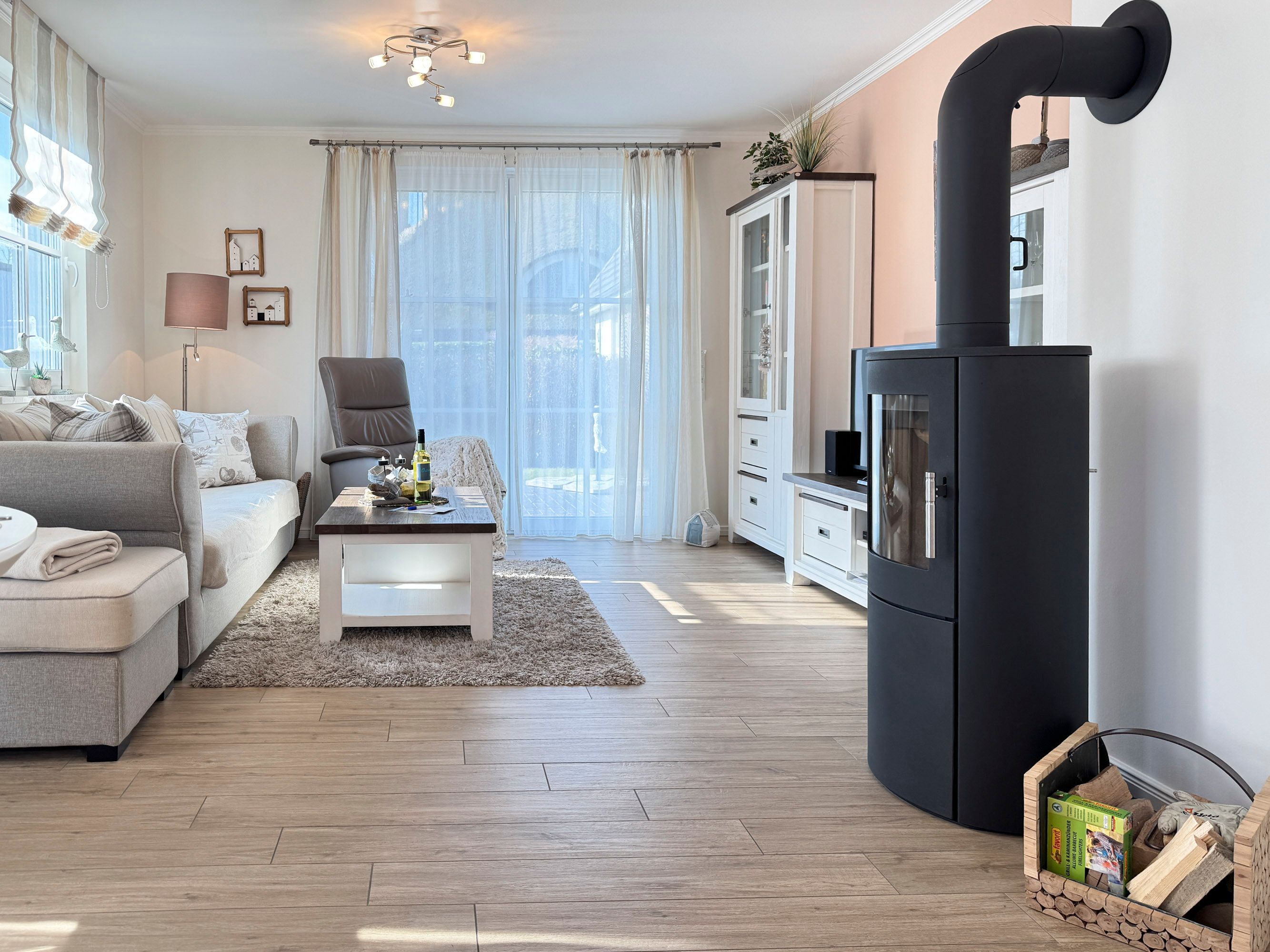 • Wohnbereich: Großzügiger Wohn-/Essbereich mit bequemer Sitzgruppe, Kaminofen, Flachbild-Sat-TV, Blu-ray-Player und HiFi-Anlage für entspannte Stunden.