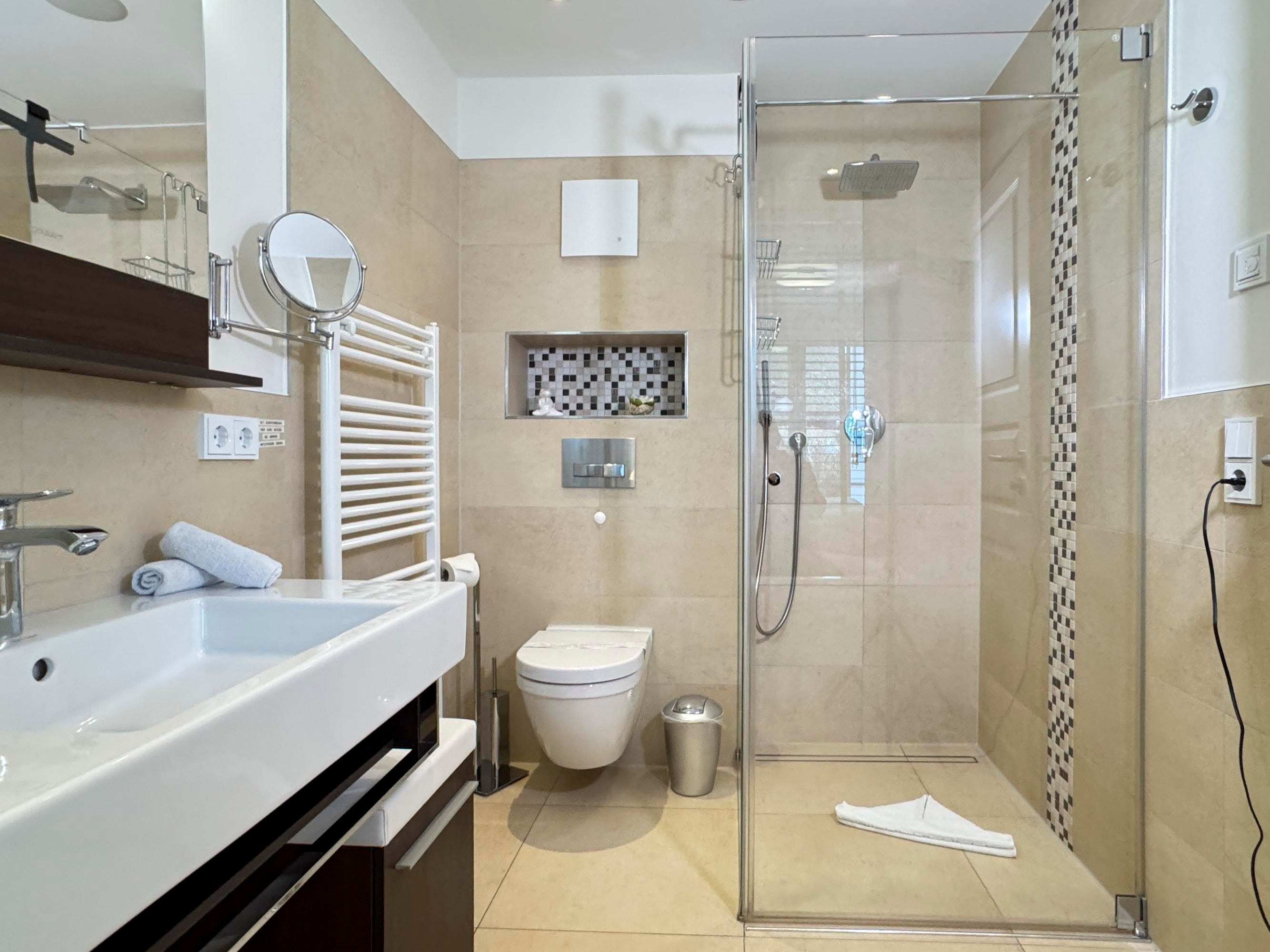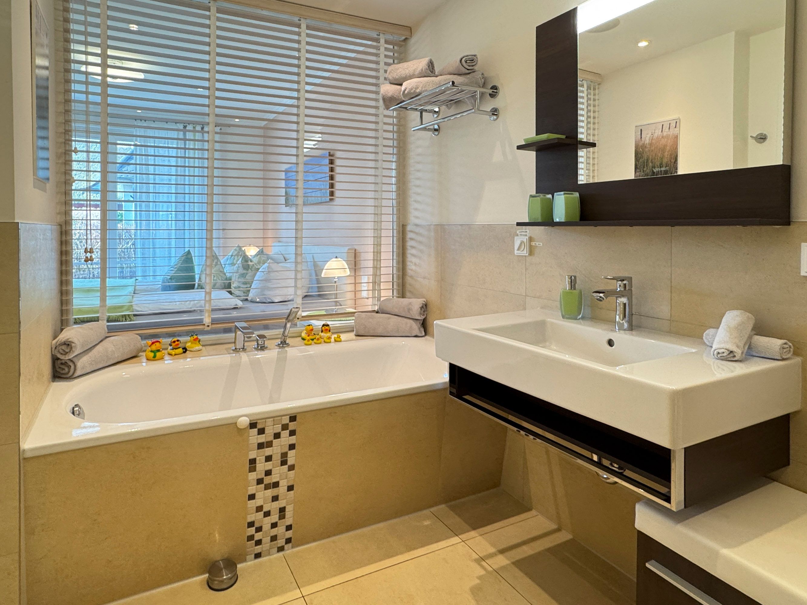 • Badezimmer: Zwei moderne Bäder eines mit Badewanne, ebenerdiger Dusche, WC, Handtuchwärmer und Haartrockner; das zweite Bad mit ebenerdiger Dusche, WC und Handtuchwärmer bieten zusätzlichen Komfort.