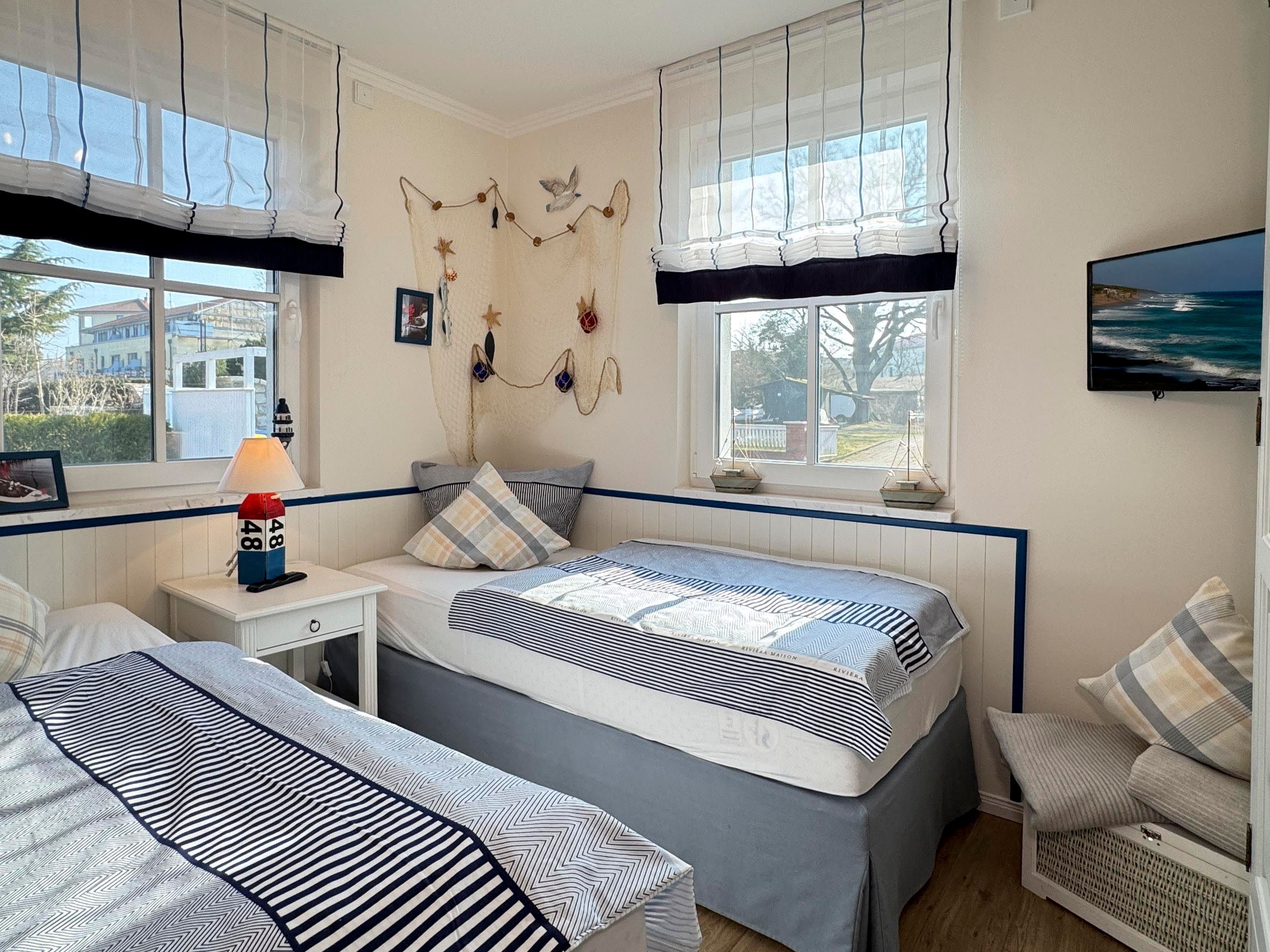 • Schlafzimmer: Zwei separate Schlafzimmer – eines mit luxuriösem Boxspring-Doppelbett (200 x 200 cm) und Sat-TV, das andere mit zwei Boxspring-Einzelbetten (je 90 x 200 cm) und Sat-TV mit DVD-Player – garantieren erholsame Nächte für alle Gäste.