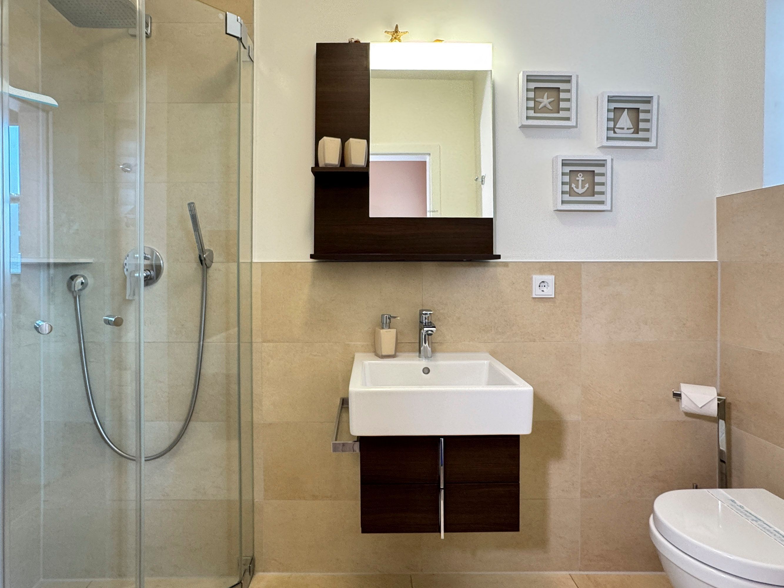• Badezimmer: Zwei moderne Bäder – eines mit Badewanne, ebenerdiger Dusche, WC, Handtuchwärmer und Haartrockner; das zweite Bad mit ebenerdiger Dusche, WC und Handtuchwärmer – bieten zusätzlichen Komfort.