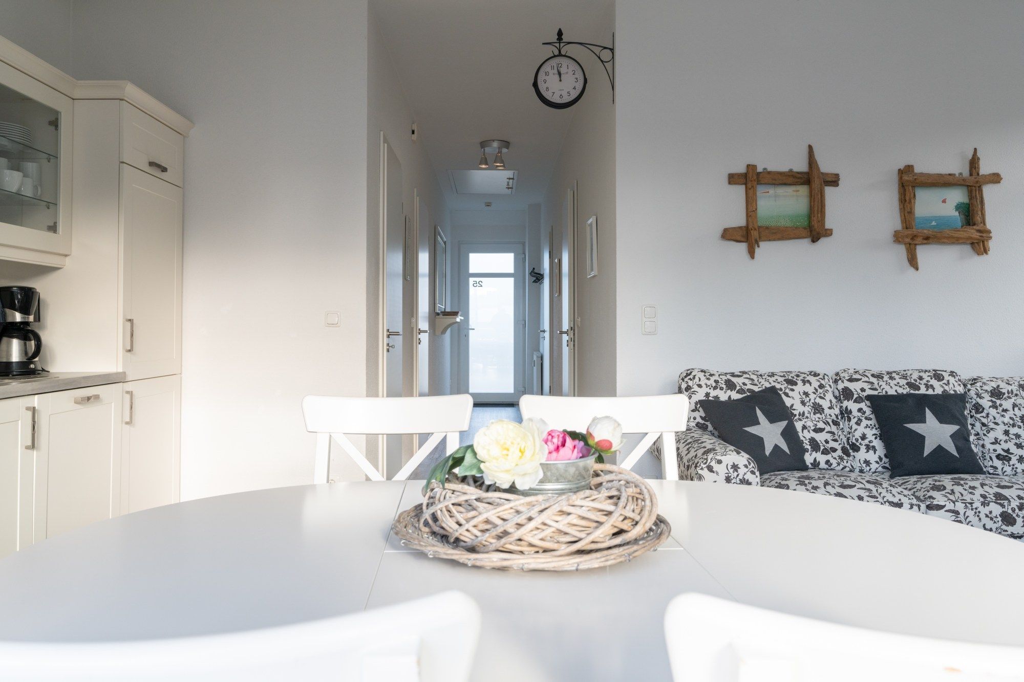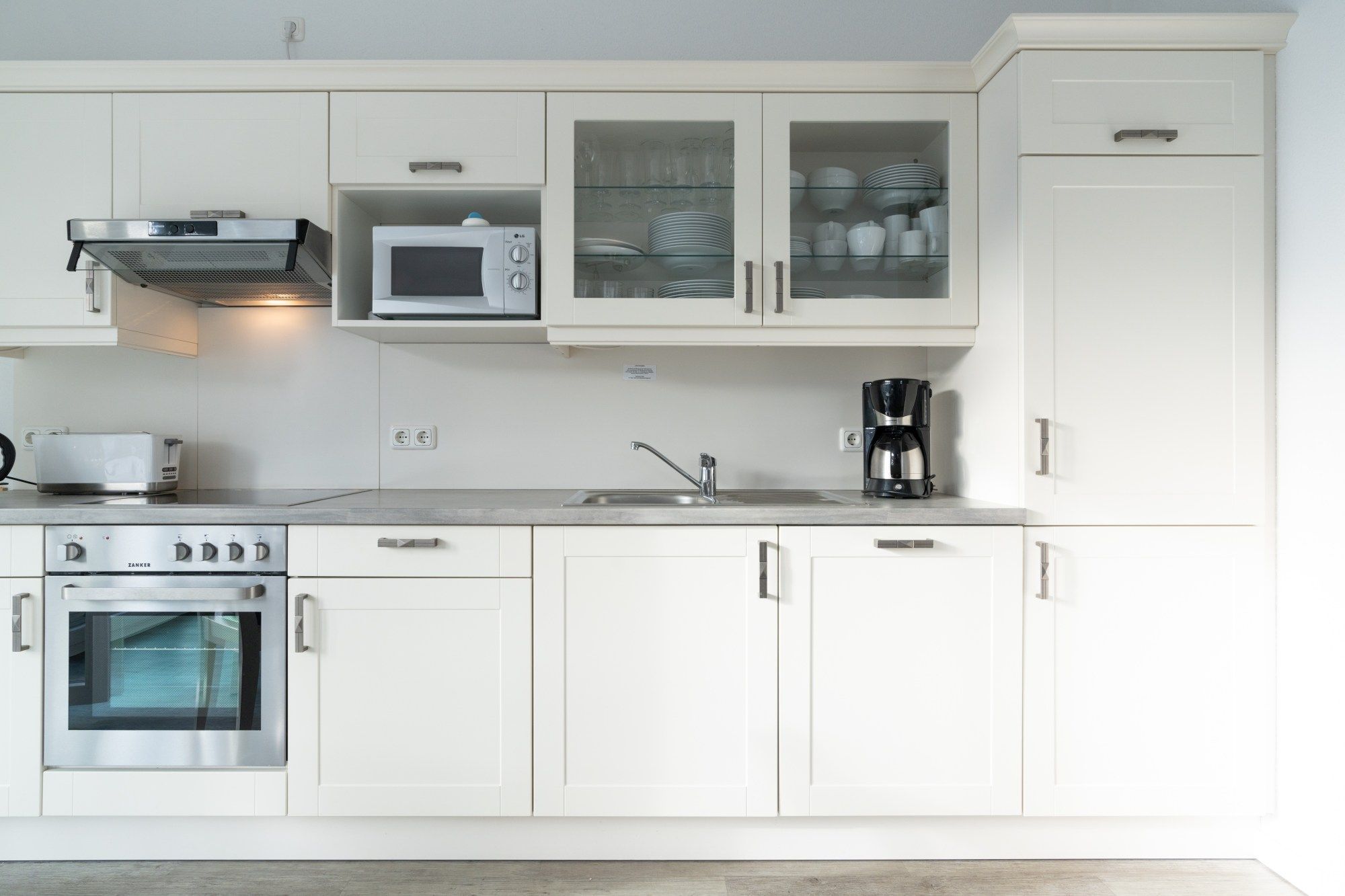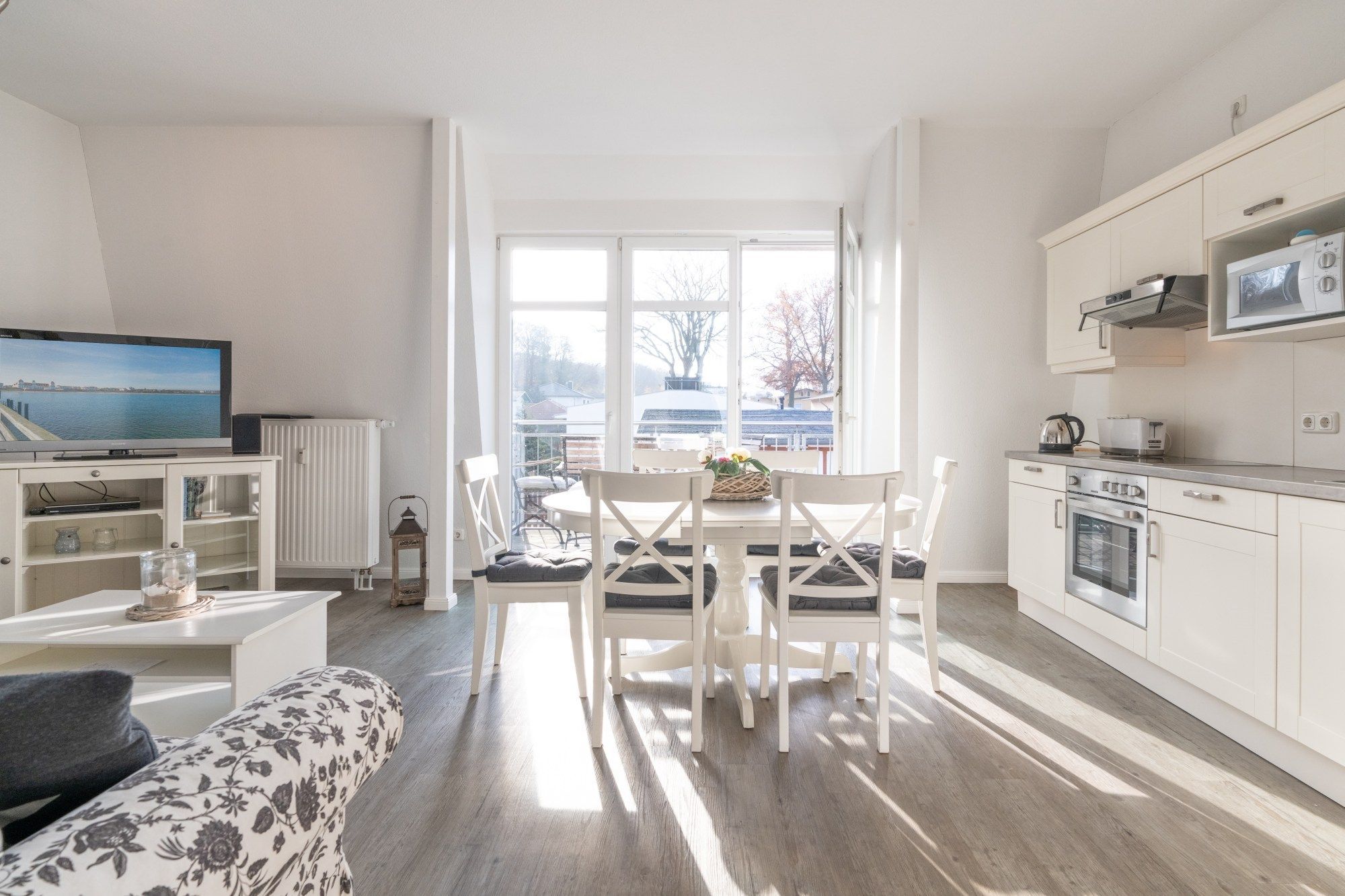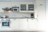 Die hier angrenzende Küchenzeile ist mit einem Kühlschrank mit Gefrierfach, einem Geschirrspüler und einem Backofen mit Cerankochfeld ausgestattet. Eine Kaffeemaschine, ein Toaster und ein Wasserkocher stehen Ihnen hier selbstverständlich zur Verfügung.