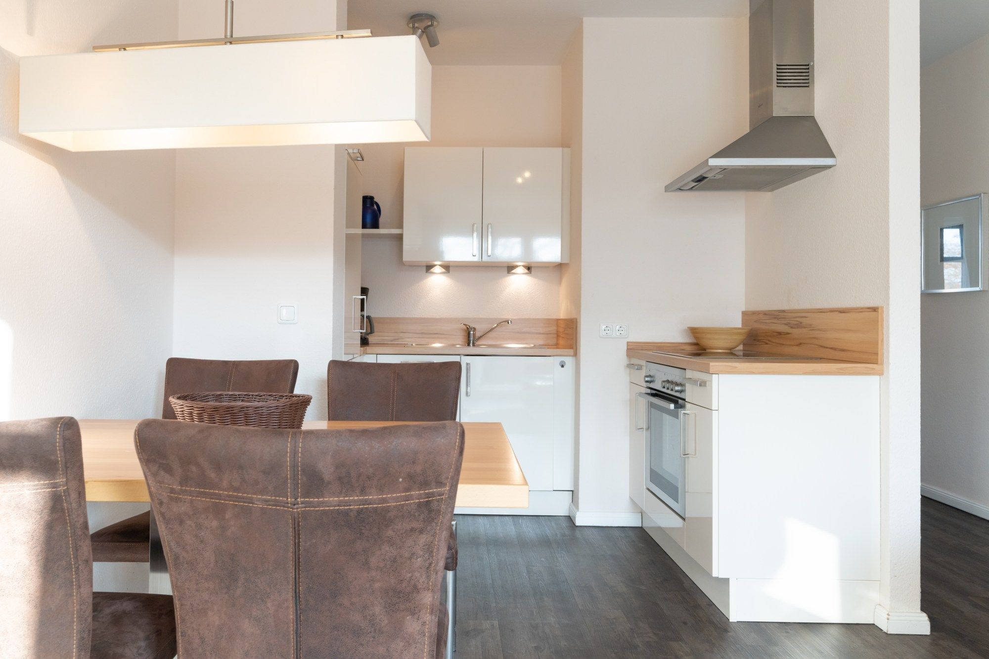 Die hier angrenzende Küchenzeile ist mit einem Kühlschrank mit Gefrierfach, einem Geschirrspüler und einem Backofen mit Cerankochfeld ausgestattet. Eine Kaffeemaschine, ein Toaster und ein Wasserkocher stehen Ihnen hier selbstverständlich zur Verfügung.
