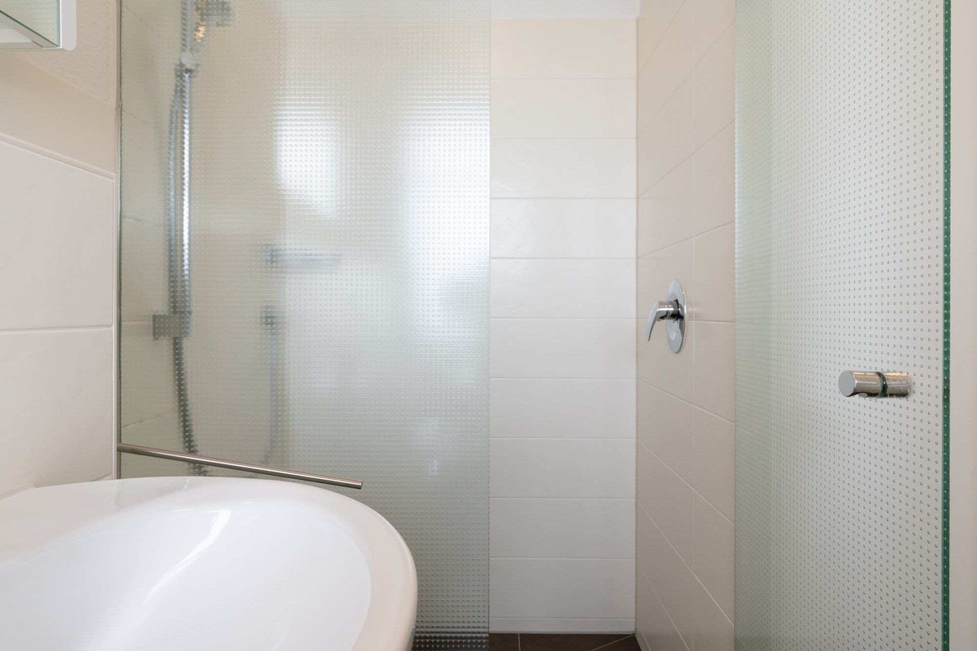 Das Badezimmer verfügt über eine Dusche (ebenerdig) und WC.