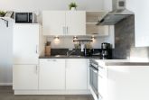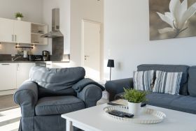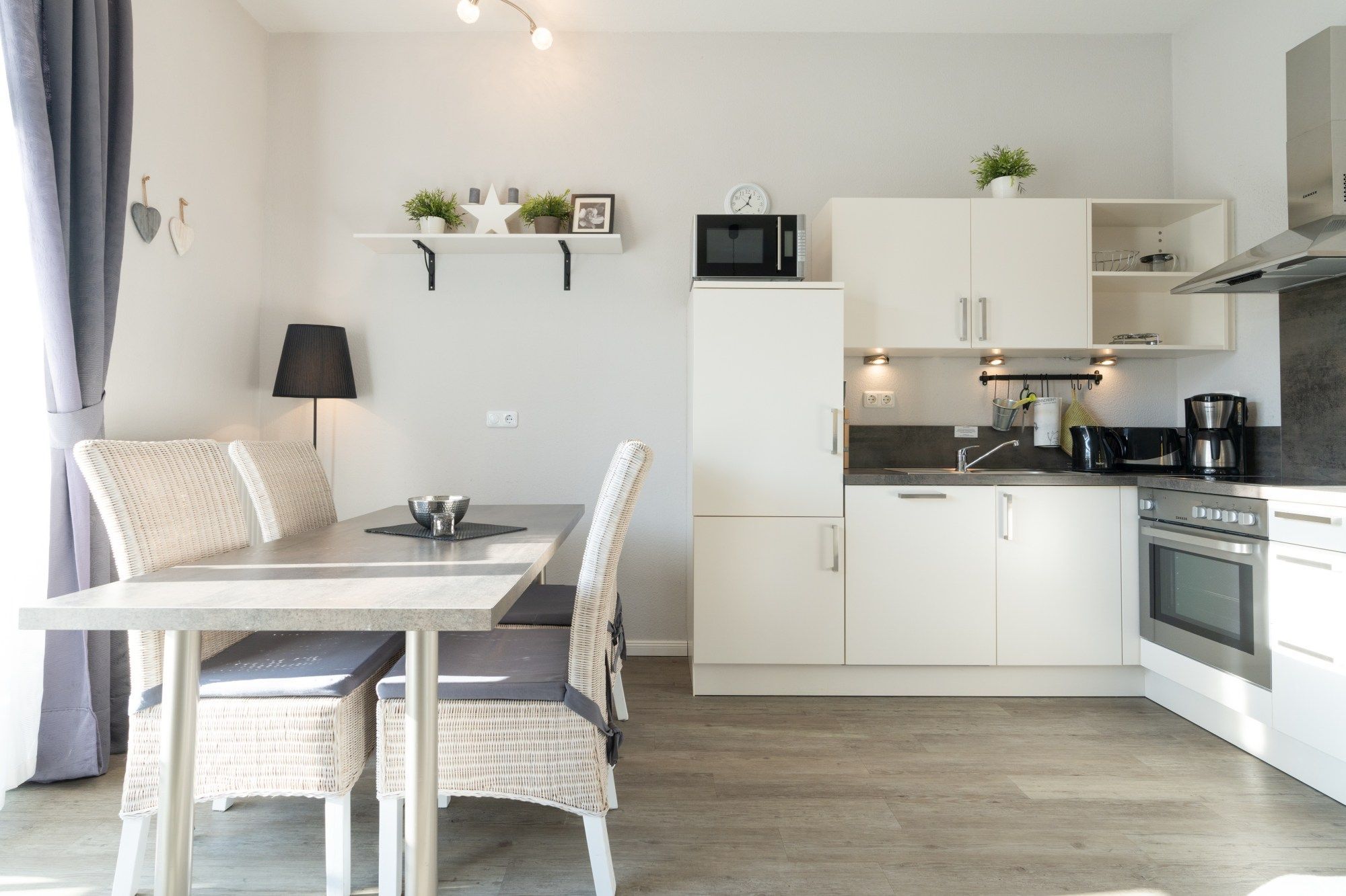 Die hier angrenzende Küchenzeile ist mit einem Kühlschrank mit Gefrierfach, einem Geschirrspüler und einem Backofen mit Cerankochfeld ausgestattet. Eine Kaffeemaschine, ein Toaster und ein Wasserkocher stehen Ihnen hier selbstverständlich zur Verfügung.