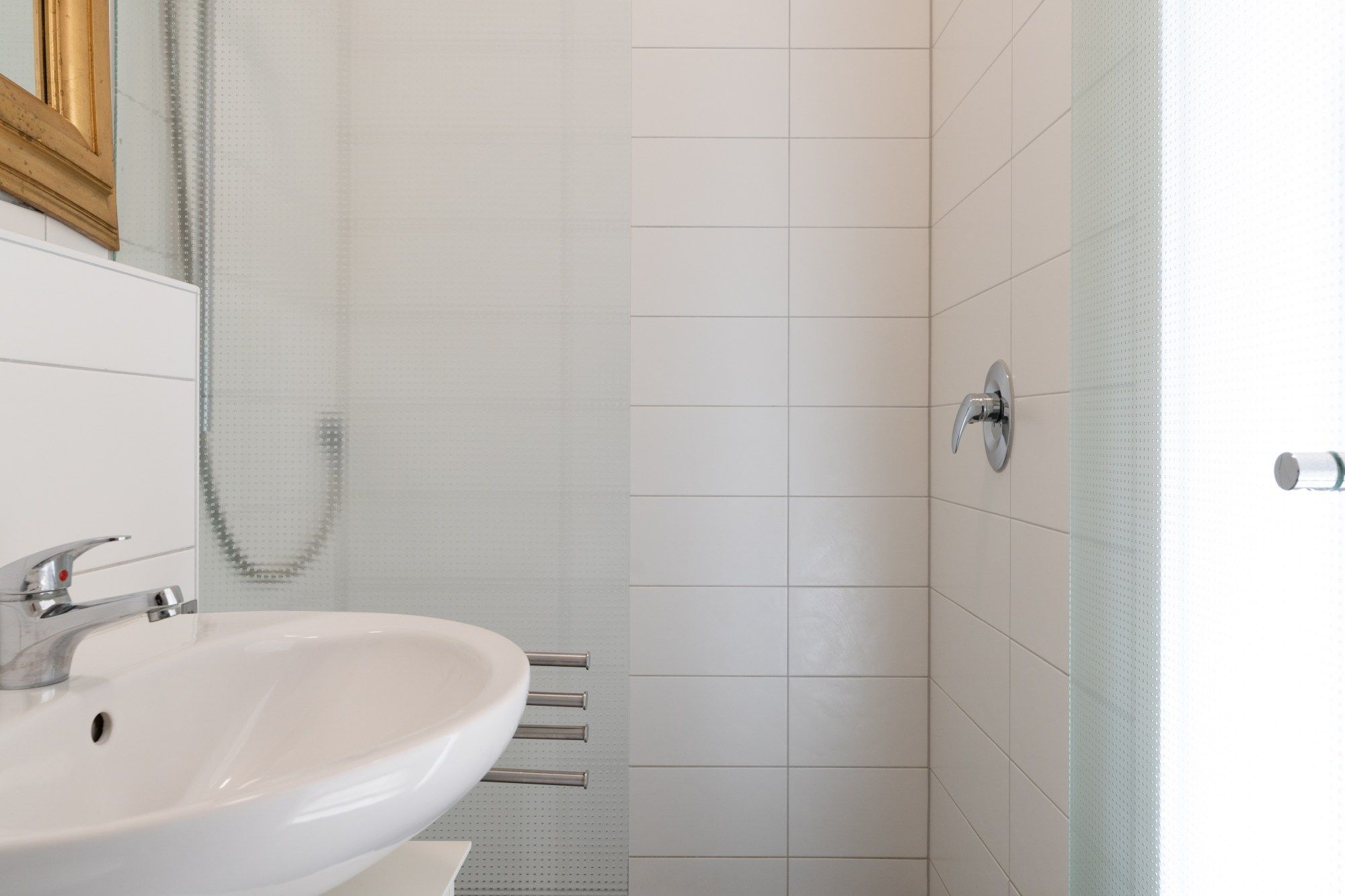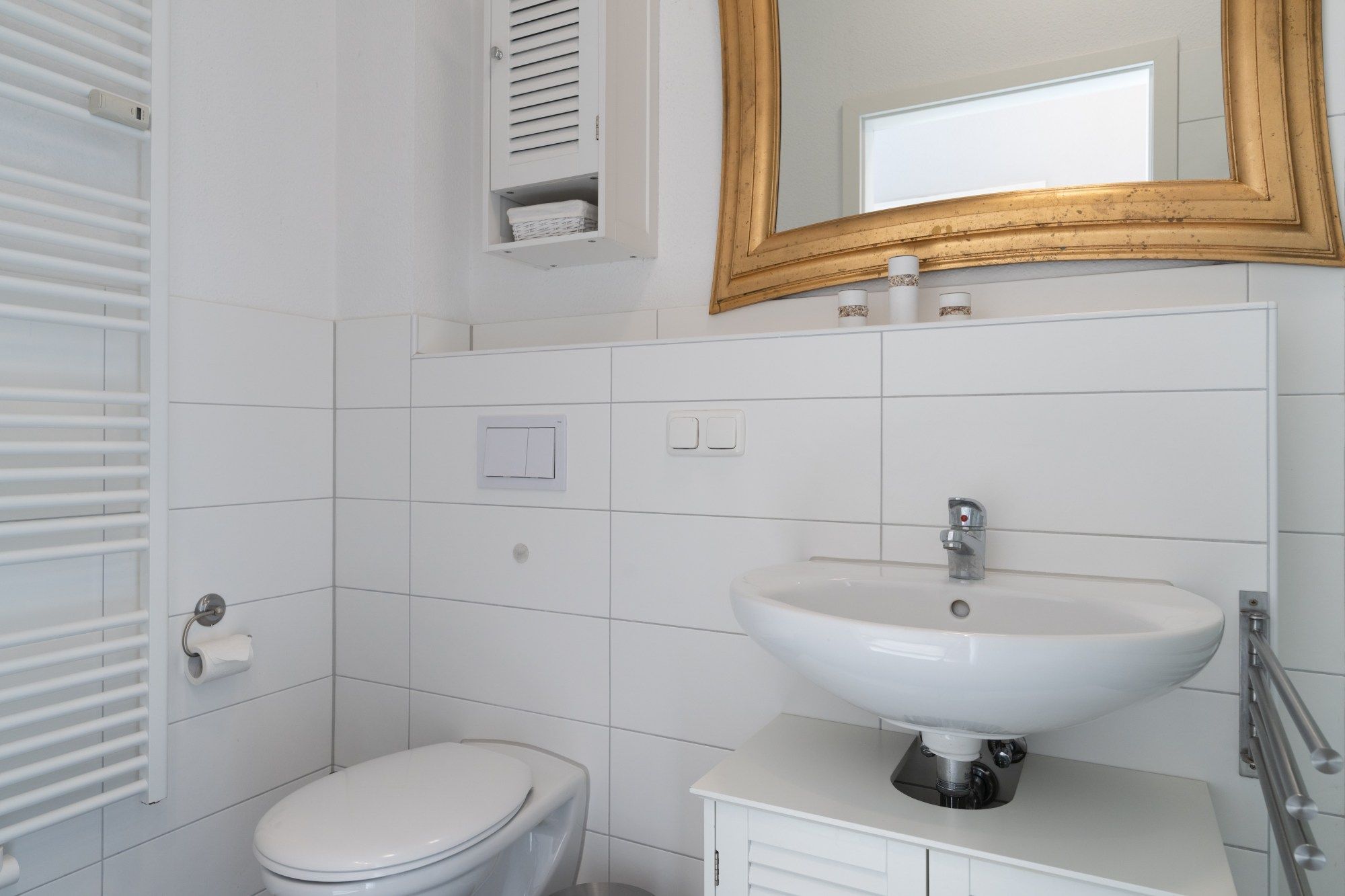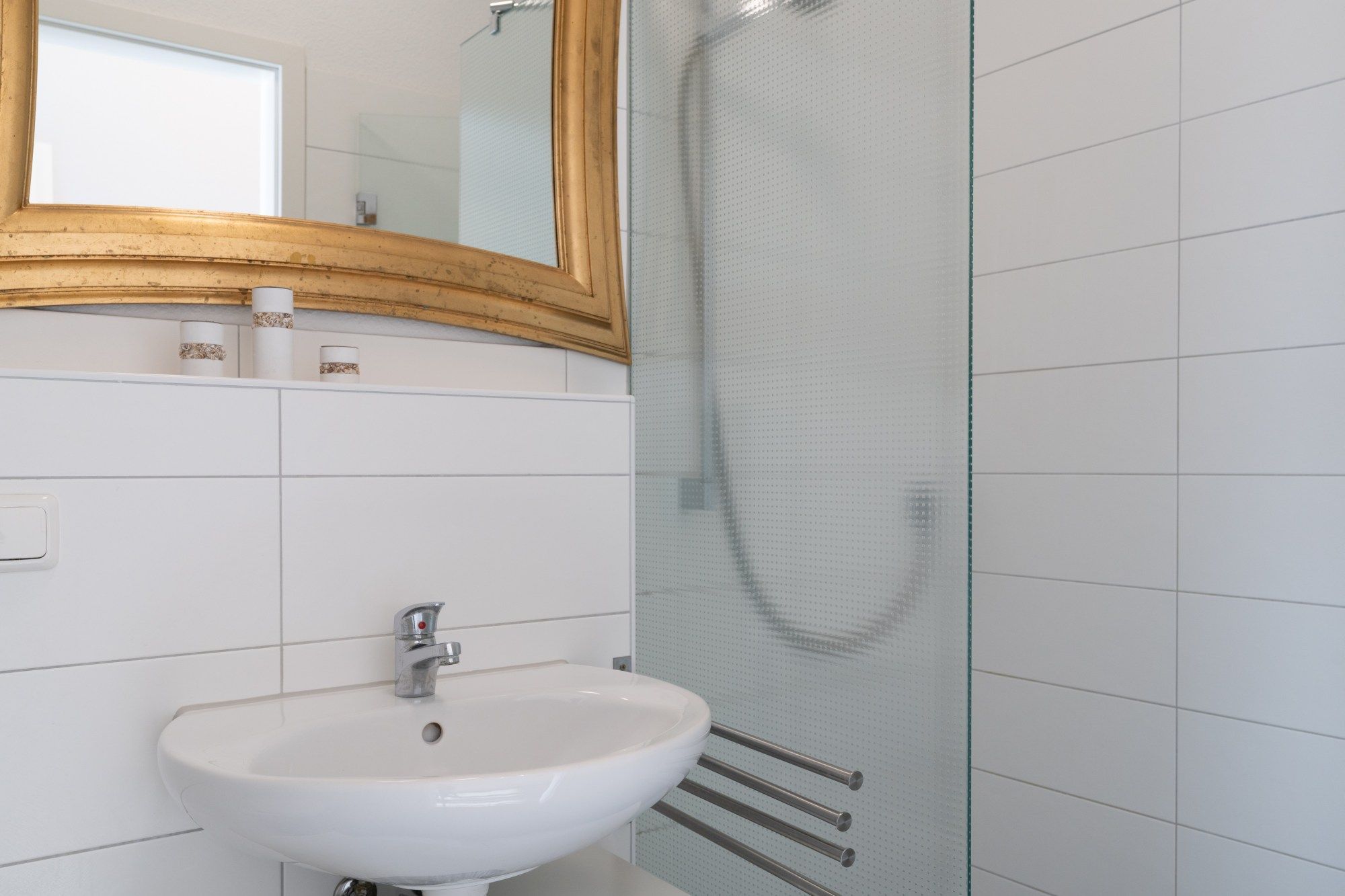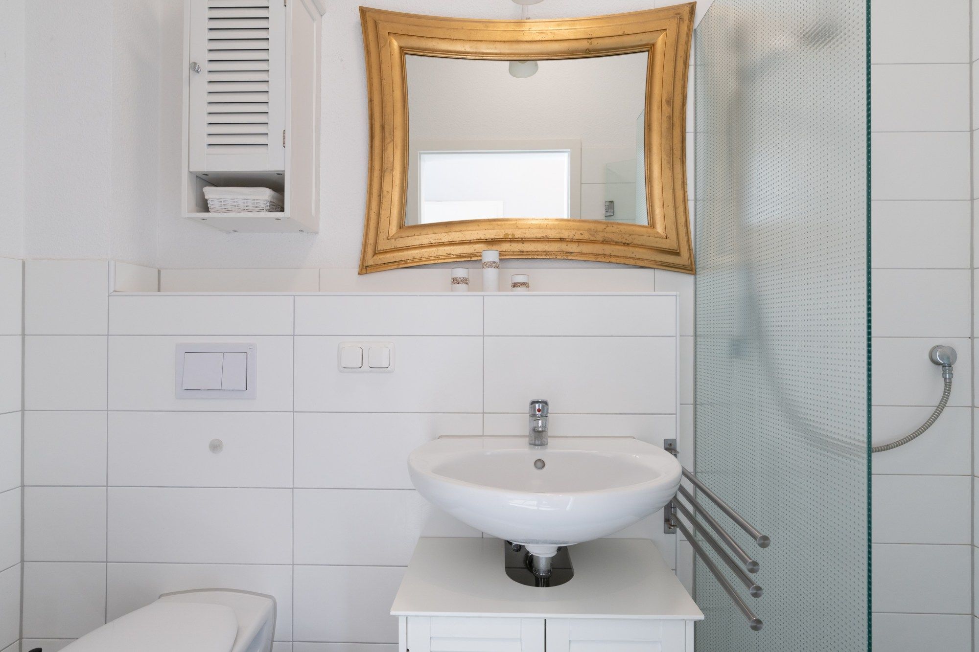 Das Badezimmer verfügt über eine Dusche (ebenerdig) und WC.