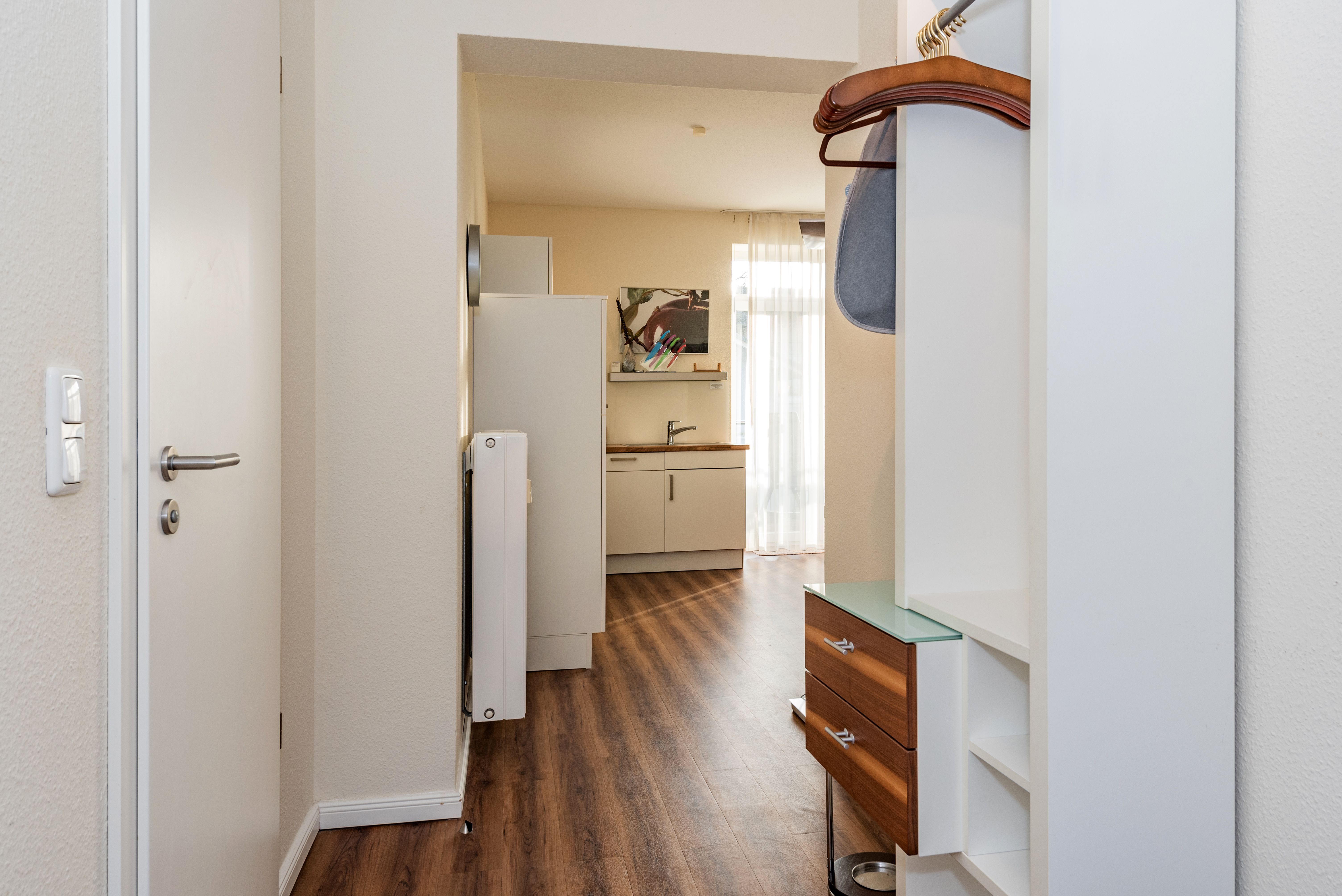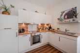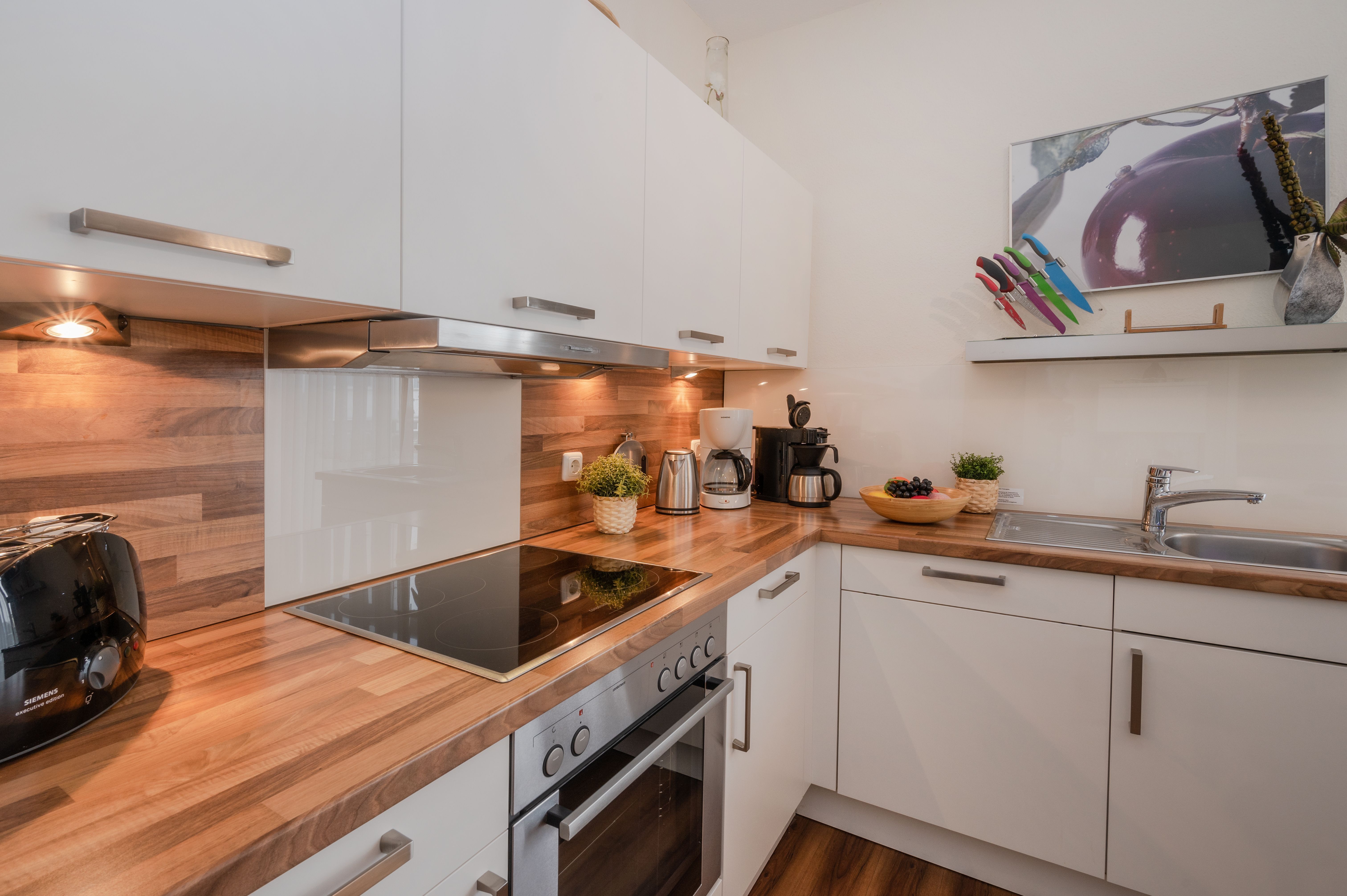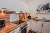 Die hier angrenzende Küchenzeile ist mit einem Kühlschrank mit Gefrierfach, einem Geschirrspüler und einem Backofen mit Cerankochfeld ausgestattet. Eine Kaffeemaschine, ein Toaster und ein Wasserkocher stehen Ihnen hier selbstverständlich zur Verfügung.