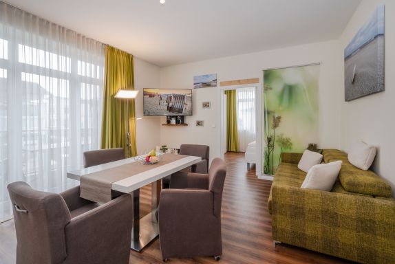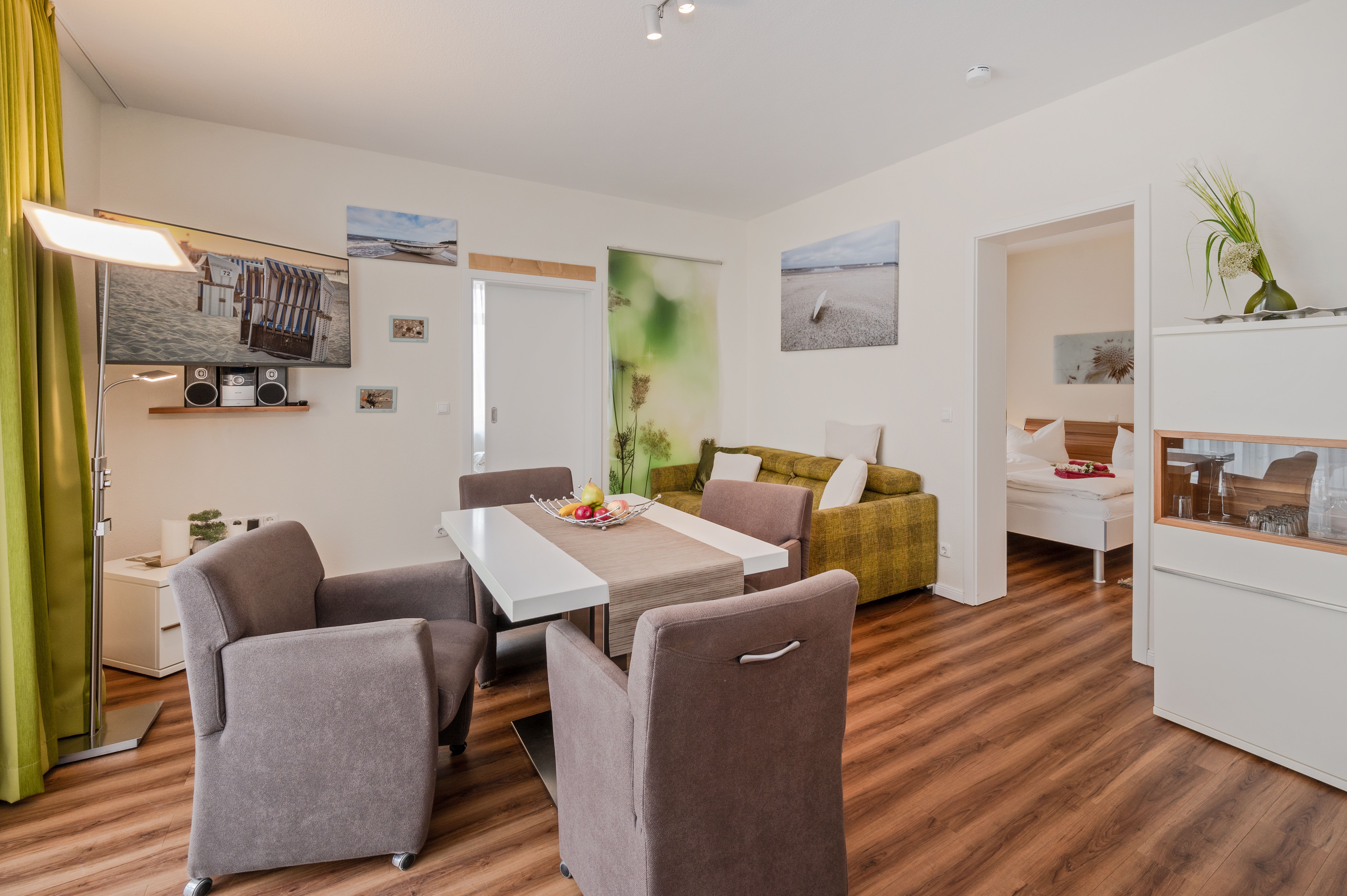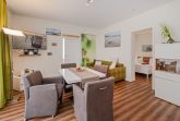 Im gemütlichen Wohnbereich laden bequeme Sessel, ein Schlafsofa und ein Flachbildfernseher zu geselligen Abenden ein. Der Essbereich ist im Wohnbereich integriert und bietet 4 Personen ausreichend Platz zum gemeinsamen Essen.