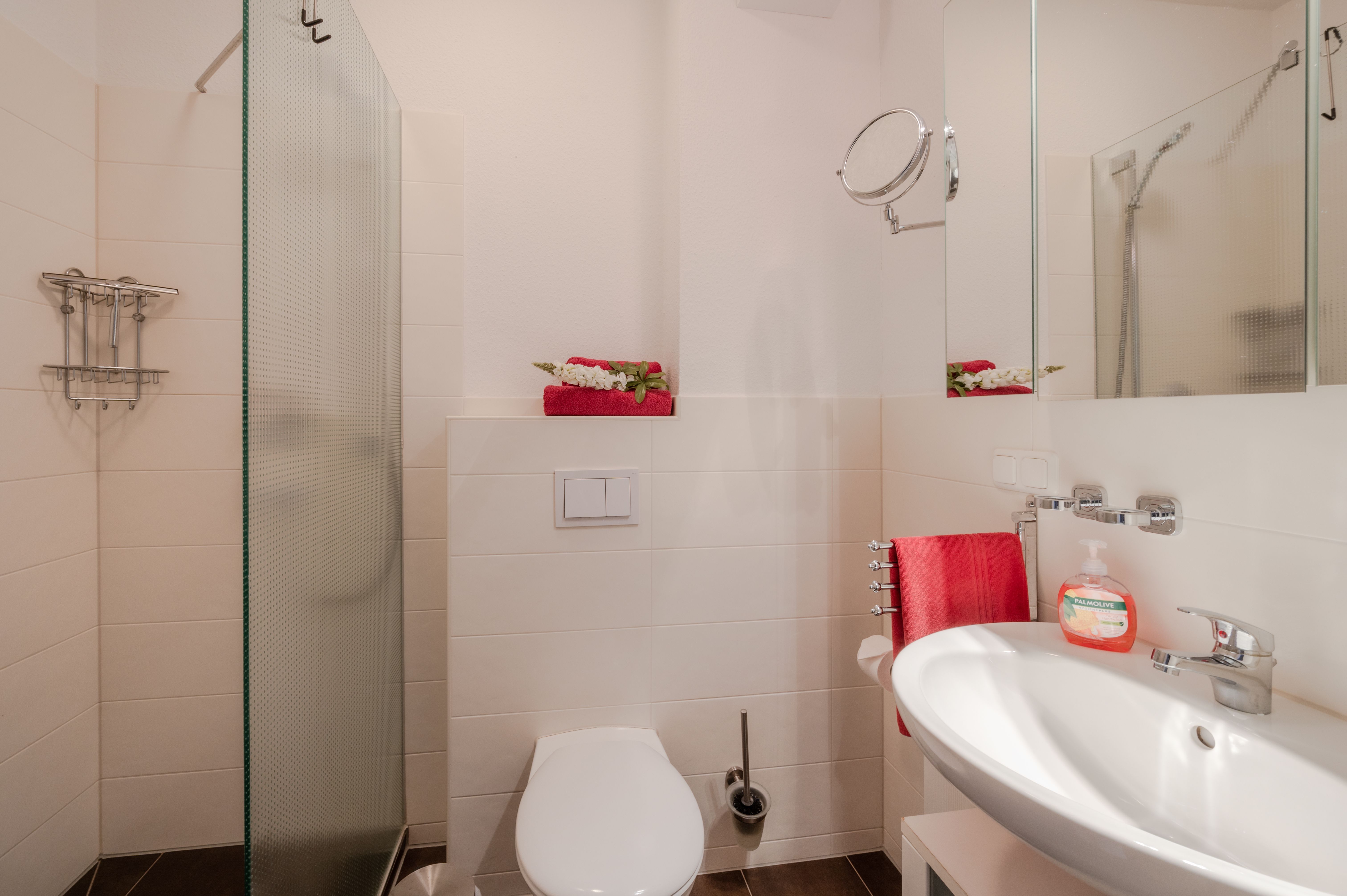 Das Badezimmer verfügt über eine Dusche (mit Absatz) und WC.