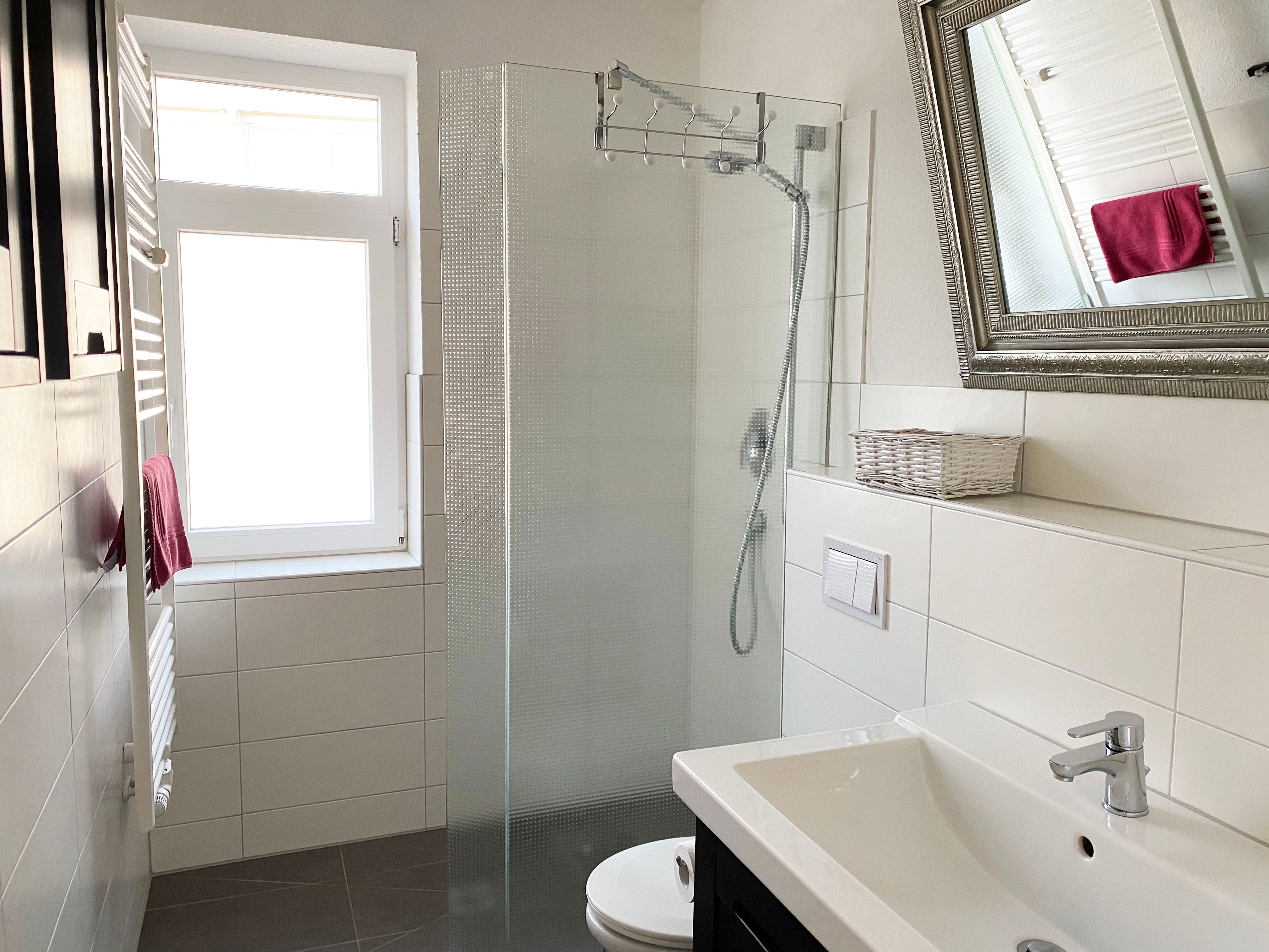 Das Badezimmer verfügt über eine Dusche (mit Absatz) und WC.