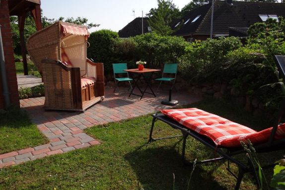 Im Garten gibt es für euch eine abgetrennte Sitzecke mit Strandkorb und Grill.
