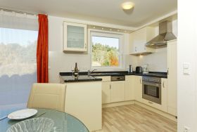 Die zwei Schlafzimmer bieten einen gemütlichen Rückzugsort. Sie sind jeweils mit einem Doppelbett (180 x 200 cm) und einem geräumigen Schrank ausgestattet. In dem großzügigen Wohnzimmer befindet sich zudem eine Schlafcouch für eine zusätzliche Aufbettung. Durch Fernseher und Stereoanlage können Sie die Zeit in ihrer Wohnung gemeinsam genießen. Zur Ausstattung der hochwertigen Einbauküche gehört ein Herd mit Backofen, ein Geschirrspüler sowie ein großer Kühlschrank mit Gefrierfach. Das moderne Bad mit Dusche ist mit Fußbodenheizung und einem elektrischem Handtuchtrockner ausgestattet. Auf der möblierten Terrasse können Sie das schöne Wetter auch direkt an der Wohnung nutzen. Alle Fenster wurden mit Jalousien versehen. Zur Wohnung gehört natürlich ein gekennzeichneter PKW-Stellplatz.