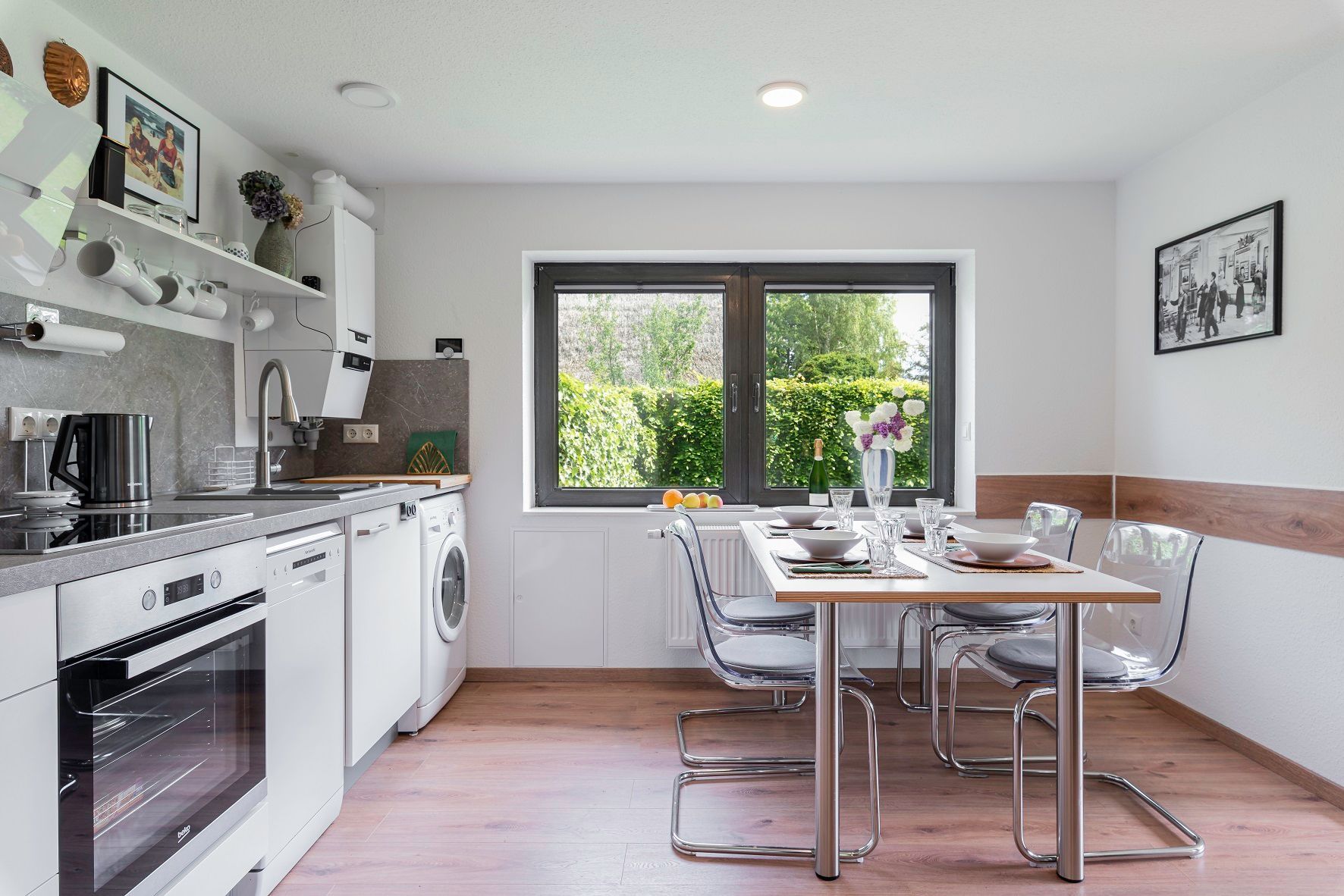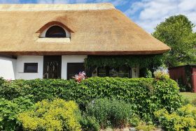 Unser reetgedecktes Haus erstreckt sich über zwei Ebenen. Die Küche ist voll ausgestattet und am großen Esstisch finden bis zu sechs Personen Platz. Eine Waschmaschine steht ebenfrei zur Nutzung bereit. Das Wohnzimmer besticht mit einem geräumigen Ecksofa. Das erste Schlafzimmer empfängt Sie mit einem Doppelbett (160 x 200 cm). Im zweiten Schlafzimmer erwarten Sie ein Doppelbett (140 x 200 cm) und eine Rècamière (80 x 200 cm). Das Badezimmer verfügt über ein modernes Design mit Dusche. Die 25 qm große Terrasse ist teilweise überdacht und wird seit 55 Jahren vom Frühjahr bis spät in den Herbst hinein als zweites Wohn- / Esszimmer und abendlicher Stammtisch genutzt.