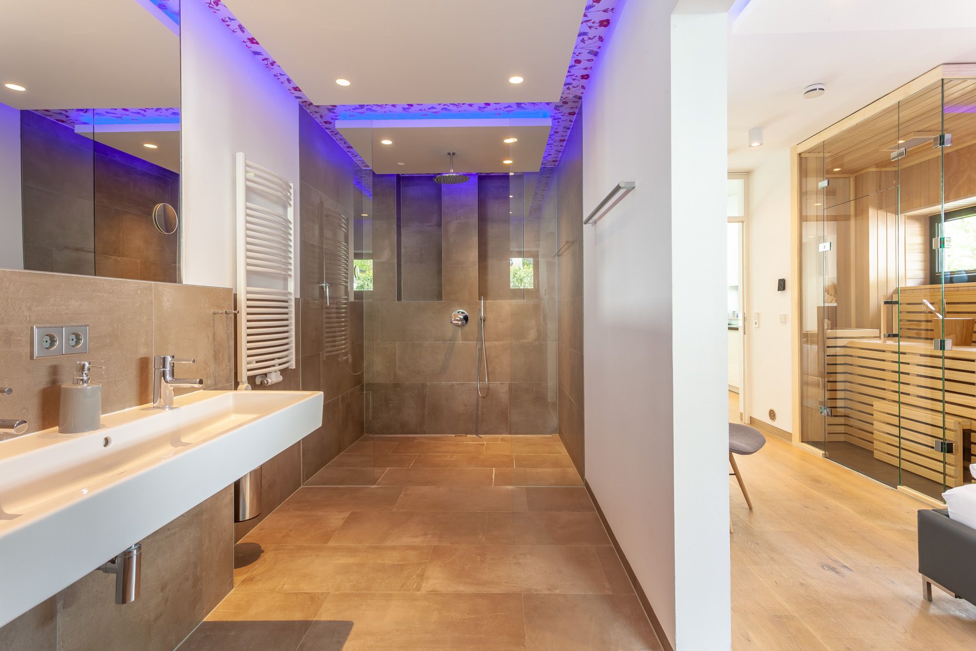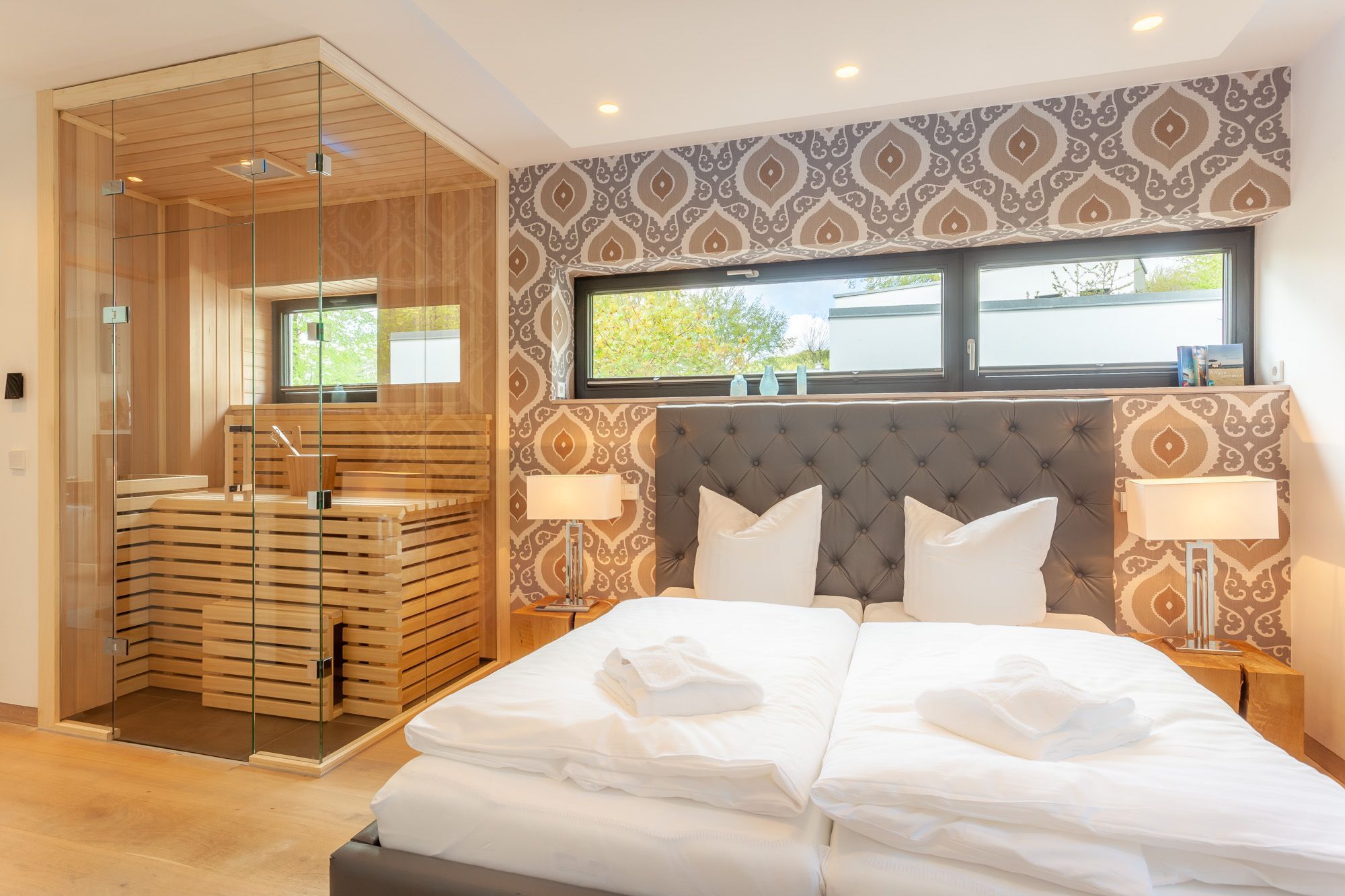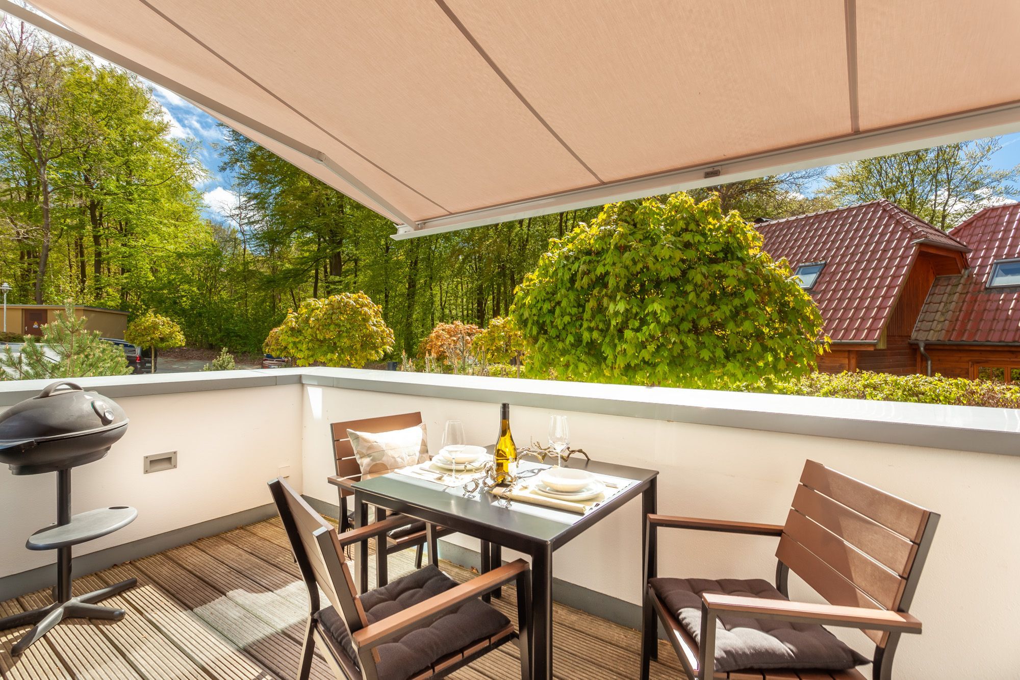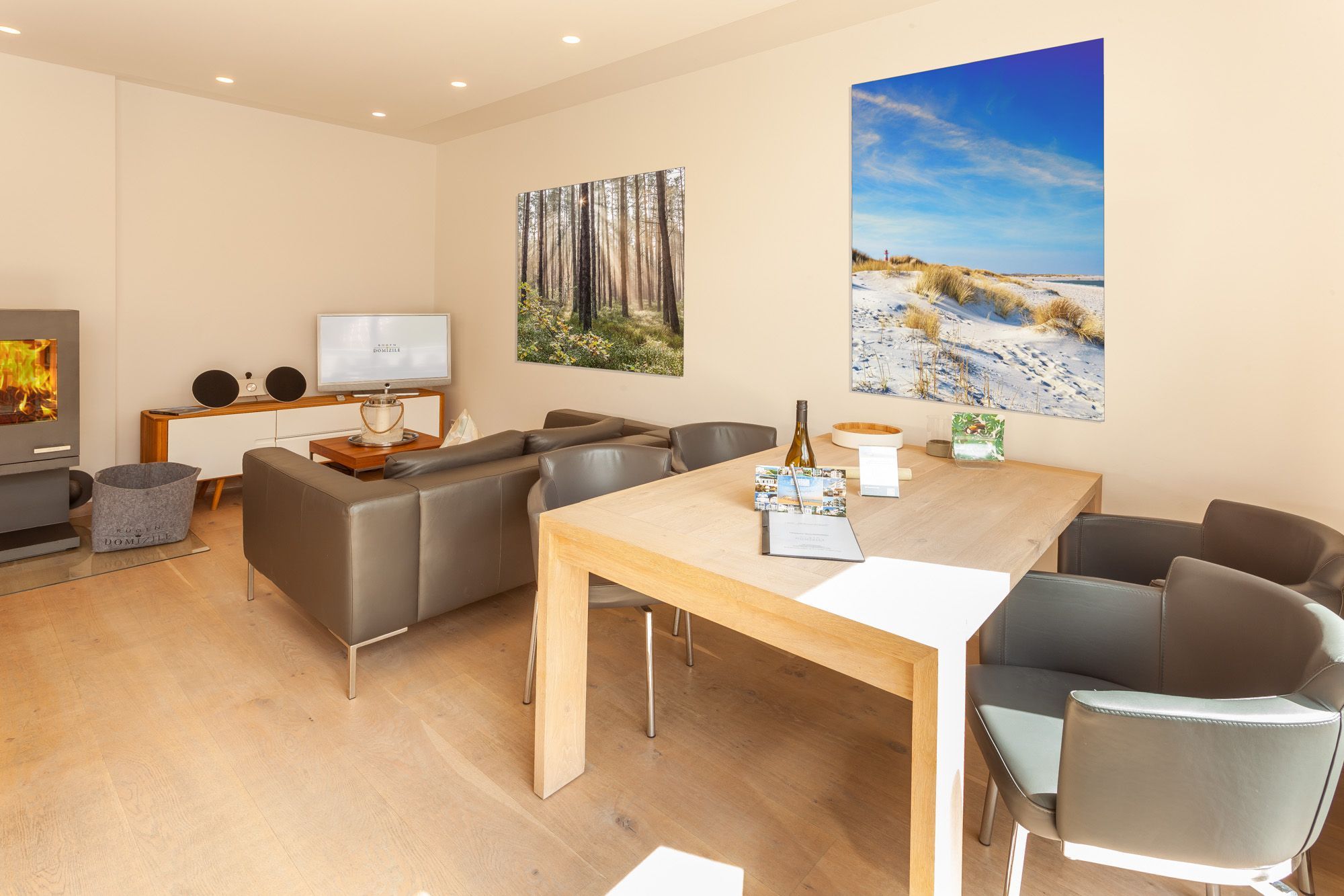 Der Wohn- und Essbereich lädt mit hochwertigen Leder- und Eichenmöbeln, integrierter Designerküche und modernster Unterhaltungselektronik zum gemeinsamen Entspannen ein. Für ganzjährig kuschelige Gemütlichkeit sorgen der Kamin und eine Fußbodenheizung. Auch das stilvolle Schlafzimmer mit dem Doppelbett und das Interieur des Badezimmers mit seinem Designwaschtisch und der ebenerdigen Dusche werden Sie begeistern. Auf der südwestlich ausgerichteten Terrasse stehen Ihnen bequeme Sitzmöbel und ein BBQ-Grill zur Verfügung.
