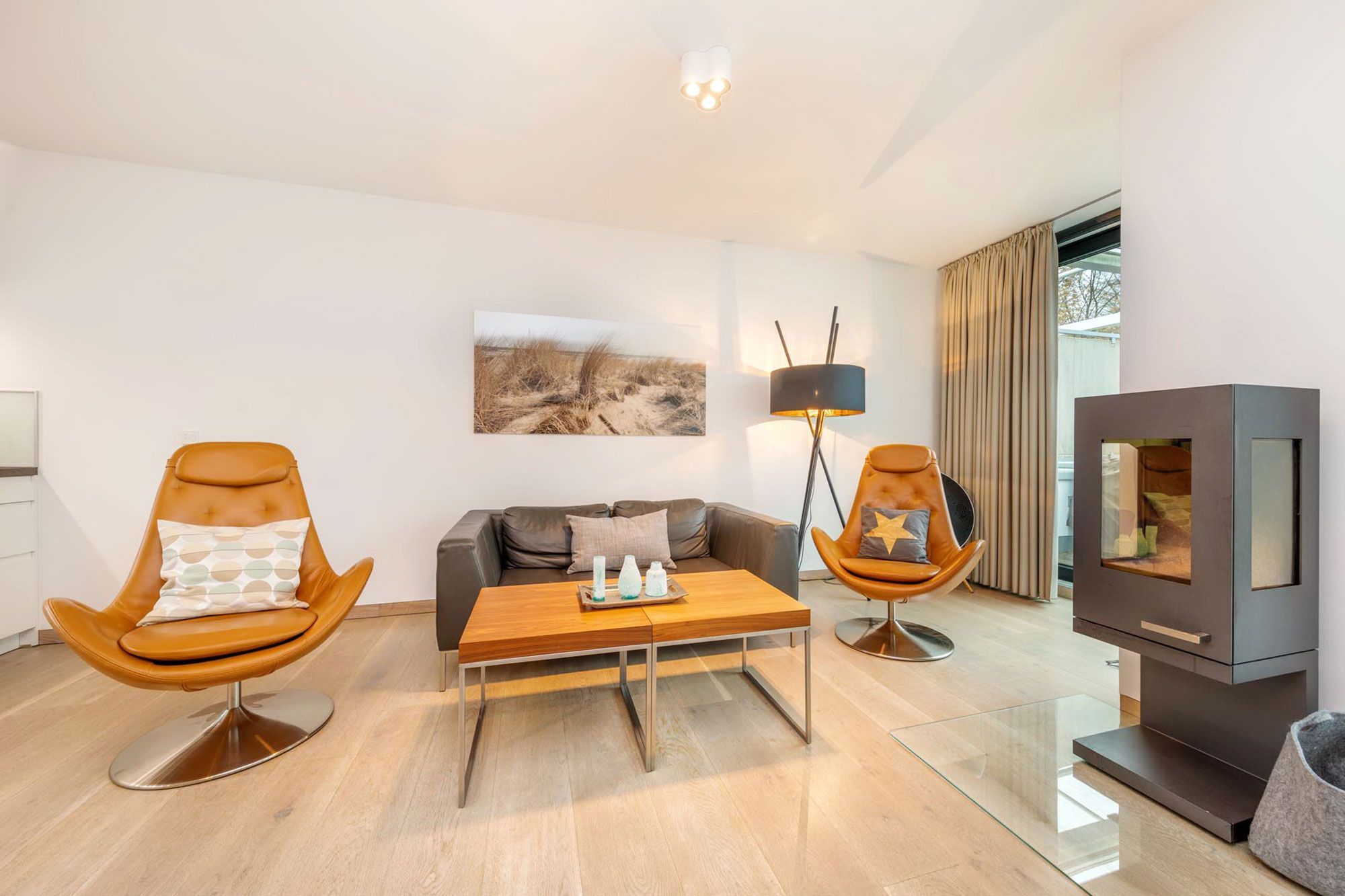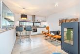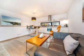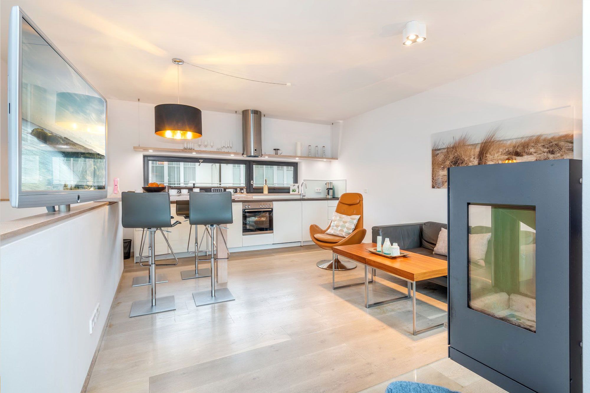 Das 3-Raum-Penthouse Sonnendeck erstreckt sich über das erste Obergeschoss und das Dachgeschoss der Strandvilla und erfüllt auf 93 Quadratmetern Wohnfläche alle Urlaubsträume von bis zu vier Personen. Auch Ihr gut erzogener Vierbeiner ist hier nach Anmeldung willkommen. Hochwertige Leder- und Eichenmöbel, pointierte Dekorationen und modernste Unterhaltungselektronik zaubern ein Ambiente der Spitzenklasse. Eines der vielen Highlights ist dabei ganz sicher der geräumige Wohn- und Essbereich mit seiner integrierten Designerküche, deren exklusive Ausstattung Funktionalität und Komfort in vollkommener Weise verbindet.