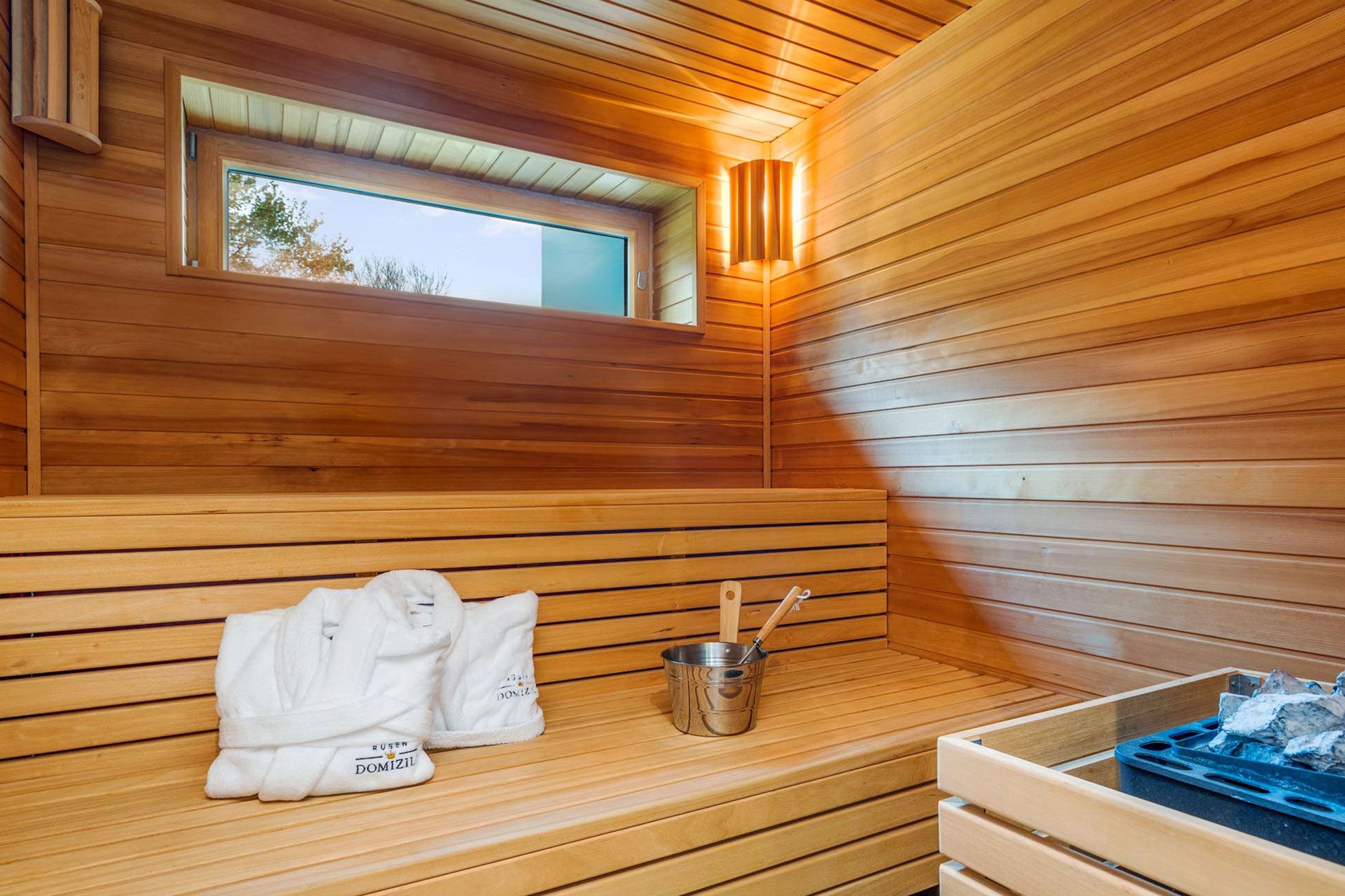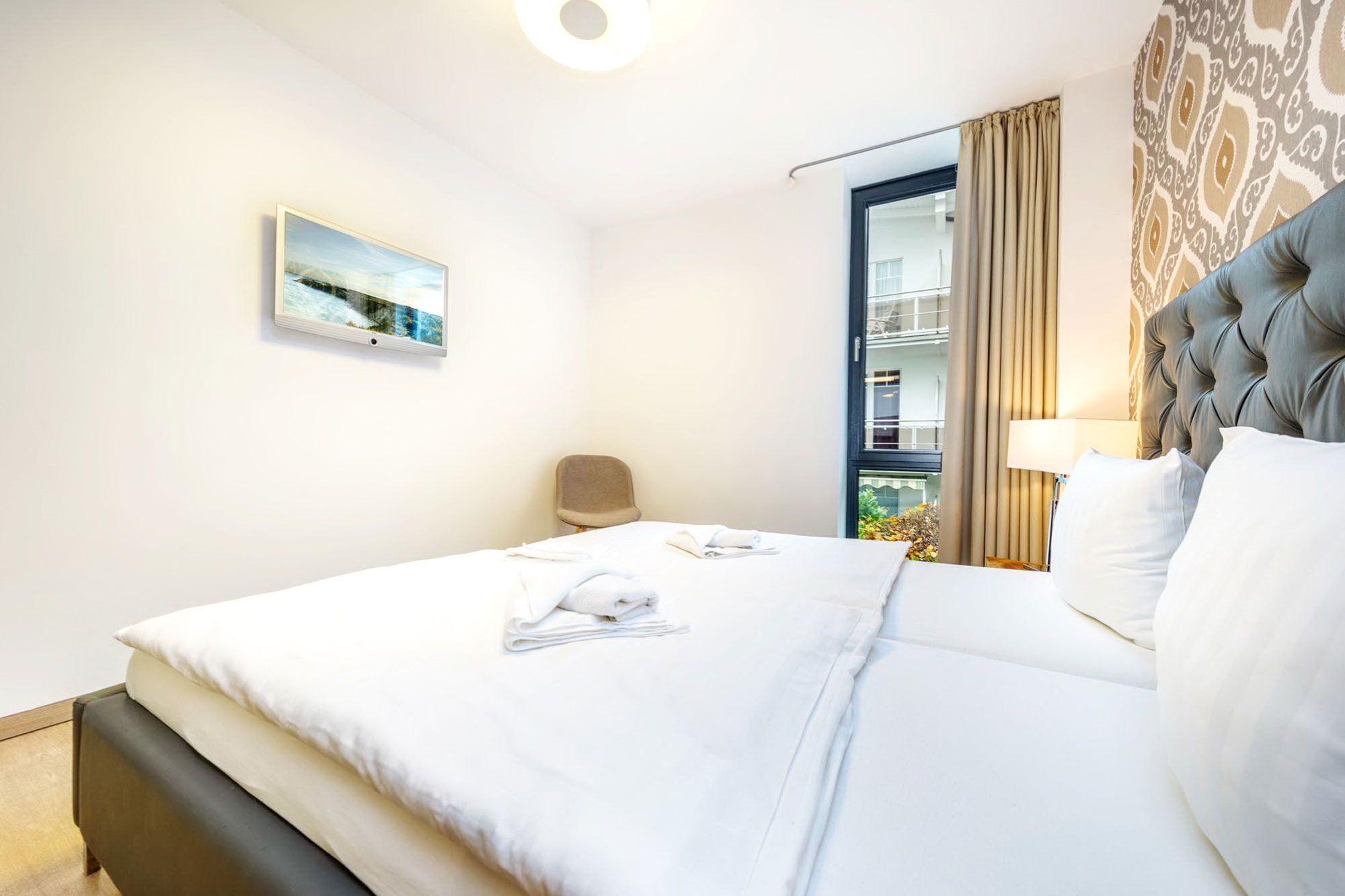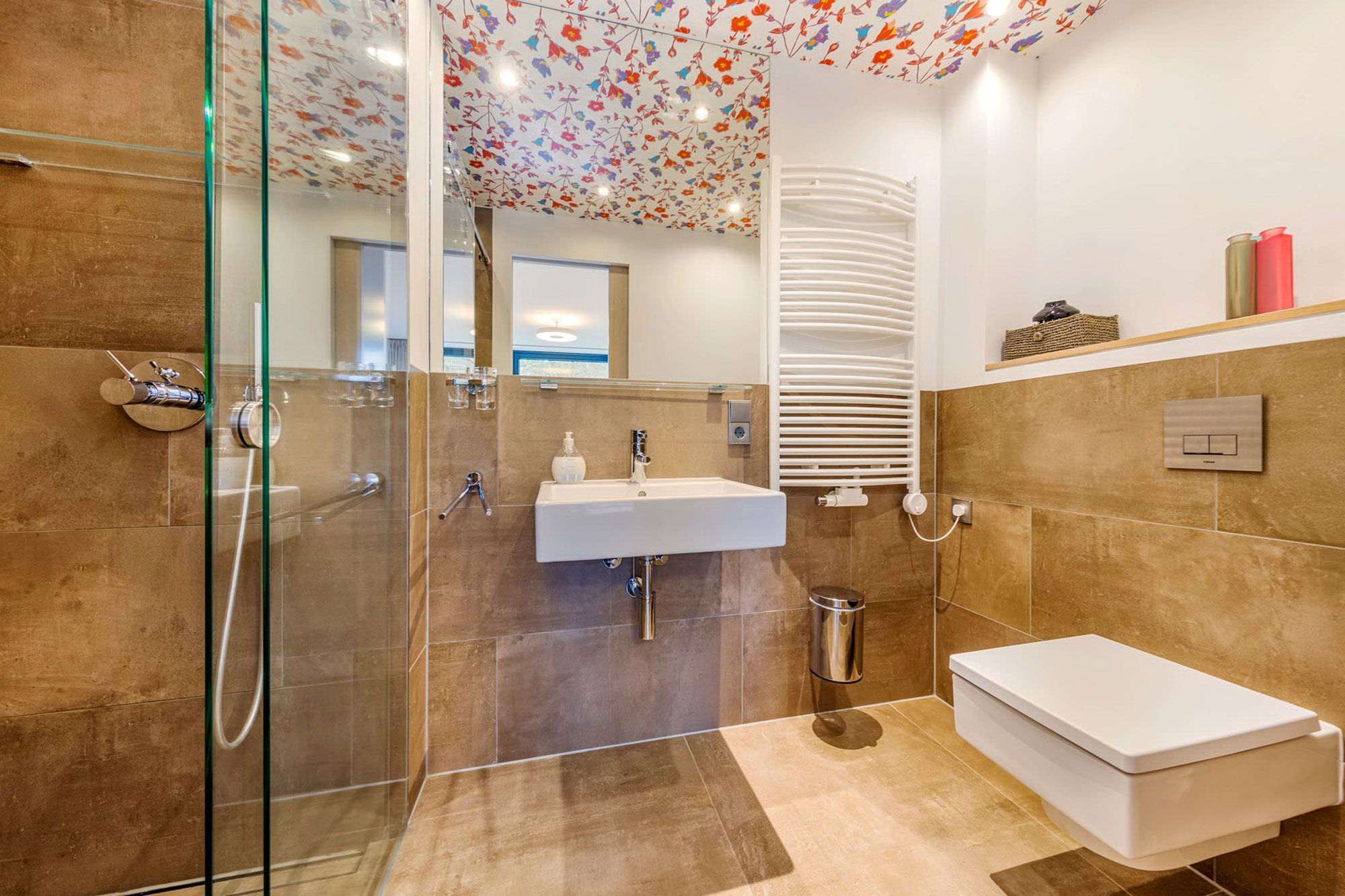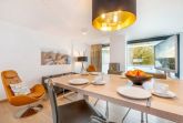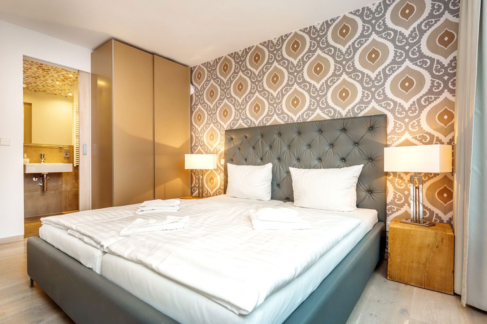 Auf der großen, nach Südwesten ausgerichteten Dachterrasse laden unter dem vollautomatischen Sonnensegel saisonal bequeme Sitzmöbel und ein BBQ-Grill zum gemütlichen Verweilen ein. Darunter warten im ersten Obergeschoss zwei elegant eingerichtete Schlafzimmer und exklusive Ensuite-Bäder darauf, von Ihnen entdeckt zu werden. Hier befindet sich auch die finnische Farblicht-Sauna, die Sie jederzeit für Ihr individuelles Verwöhnprogramm nutzen können. Die im gesamten Appartement vorhandene Fußbodenheizung sorgt für ein angenehmes Raumklima und unterstützt Ihre Entspannung zusätzlich.