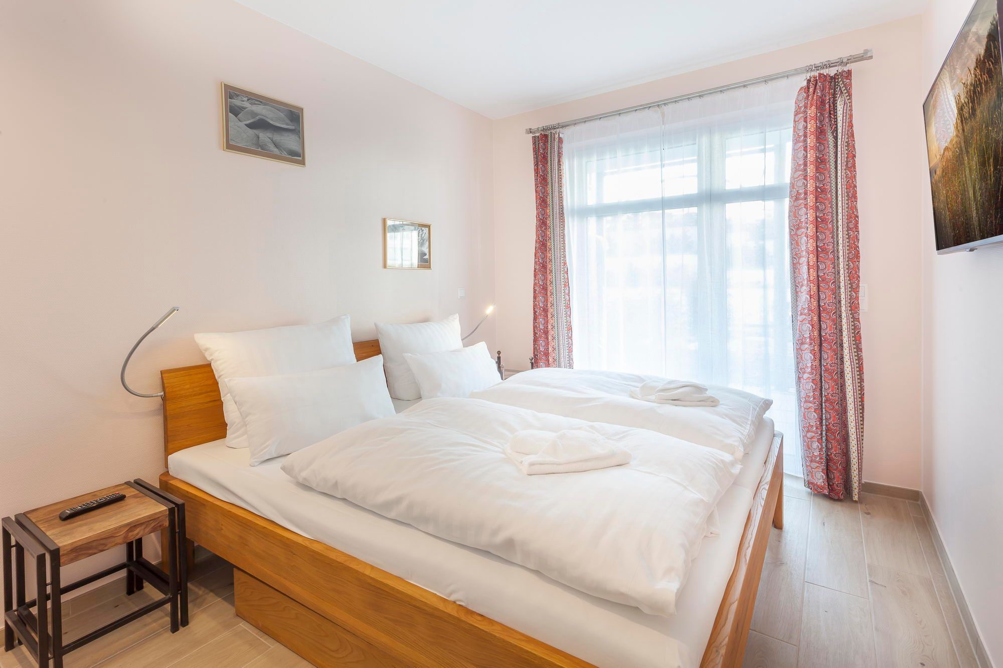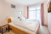 Im Schlafzimmer bettet man sich auf einem komfortablen Doppelbett mit 1,80 x 2,00 Metern Breite wahrhaft königlich. Der Kleiderschrank bietet genügend Stauraum für die Urlaubsgarderobe. Auch das Badezimmer ist mit der bodengleichen, herrlich geräumigen Dusche, dem beheizbarem Handtuchtrockner und einem modernen Duravit-Waschtisch äußerst praktisch und angenehm eingerichtet.